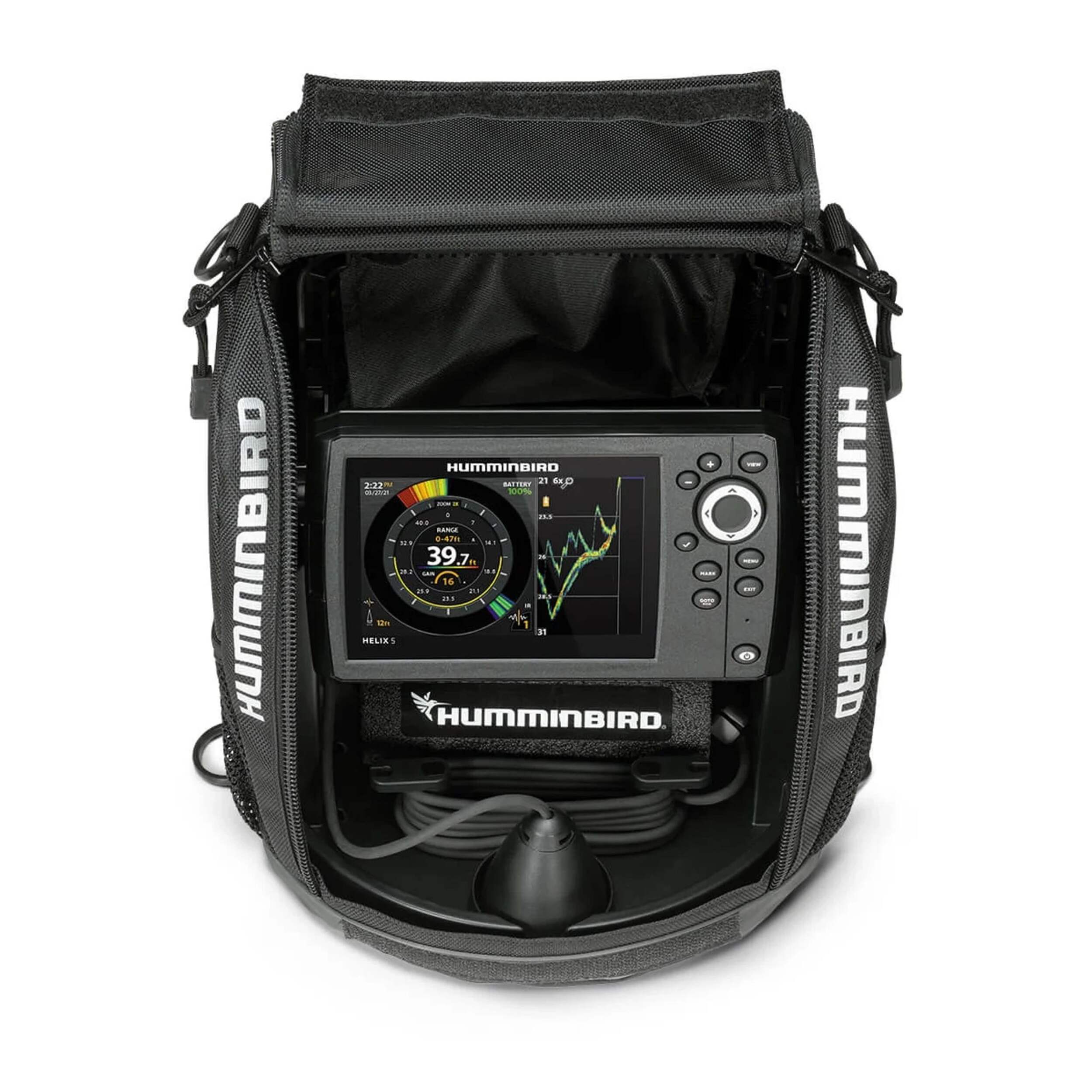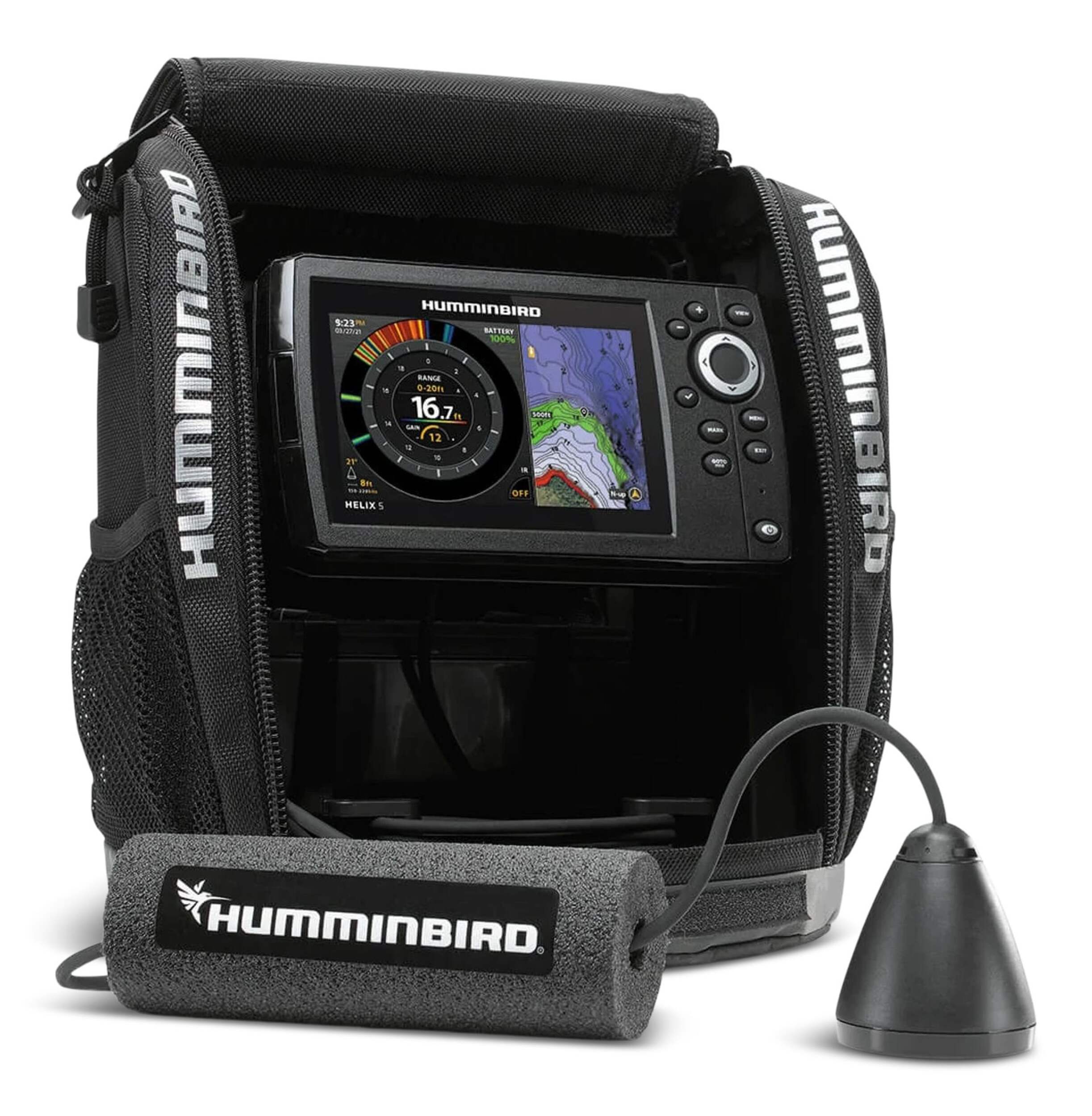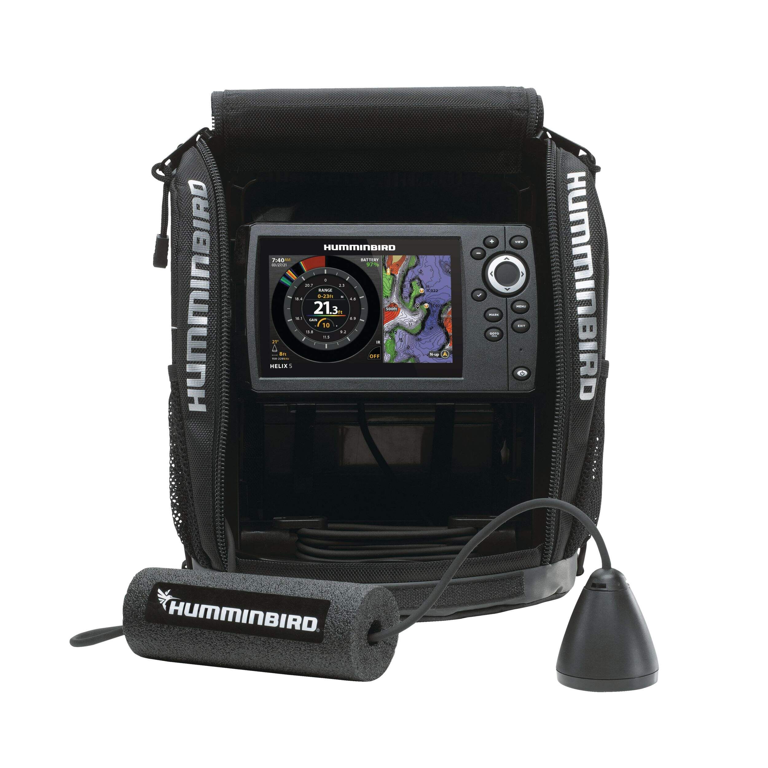 Bundle includes: ICE Helix 5 CHIRP GPS G3 fish finder, Dual Spectrum CHIRP ICE transducer, 9Ah battery and charger, ICE shuttle, hardware, power cable, portable bag and all necessary accessories to use on a boat or in portable applications (transom mount CHIRP transducer with optional suction cup transducer mount, fish finder gimbal mount and power cord)
