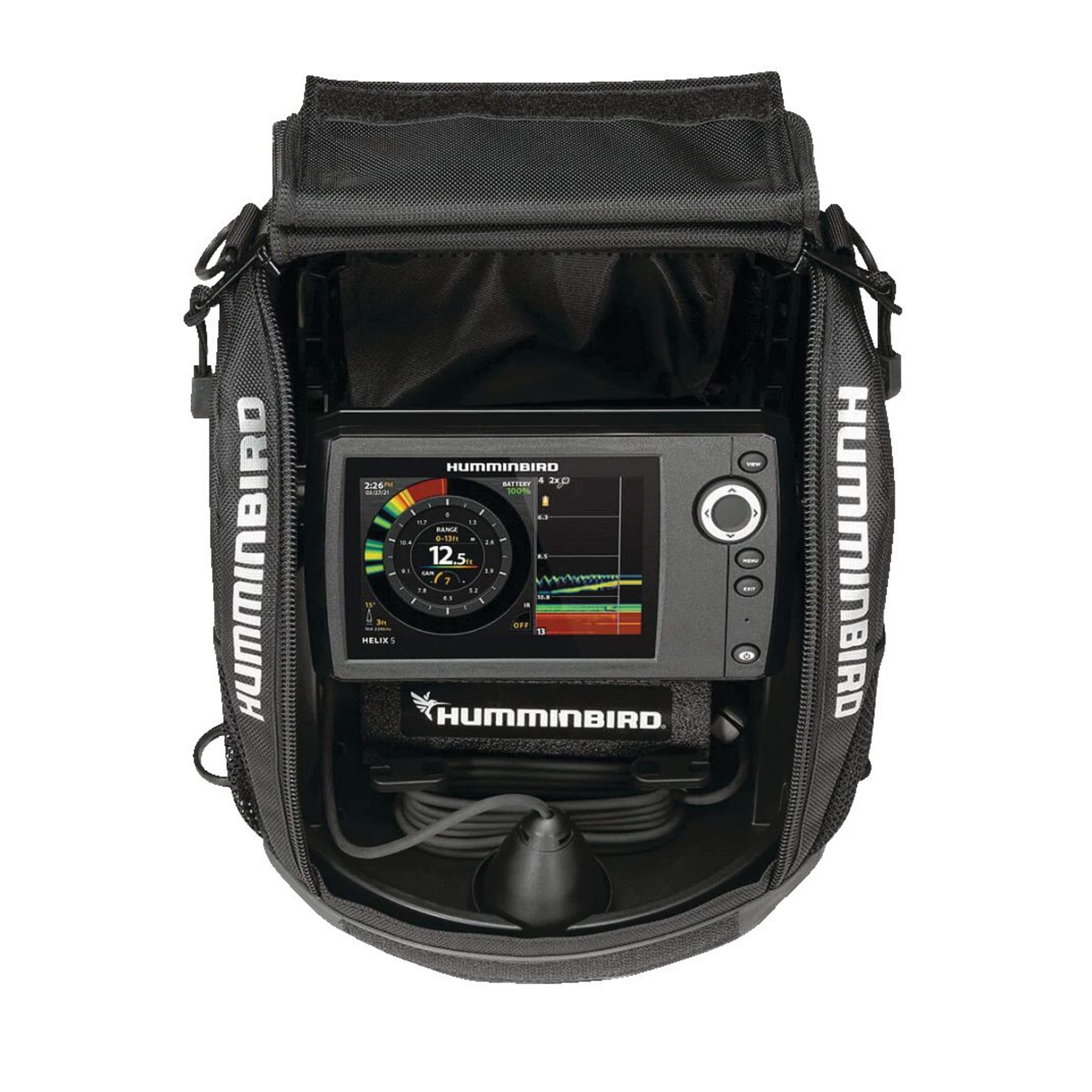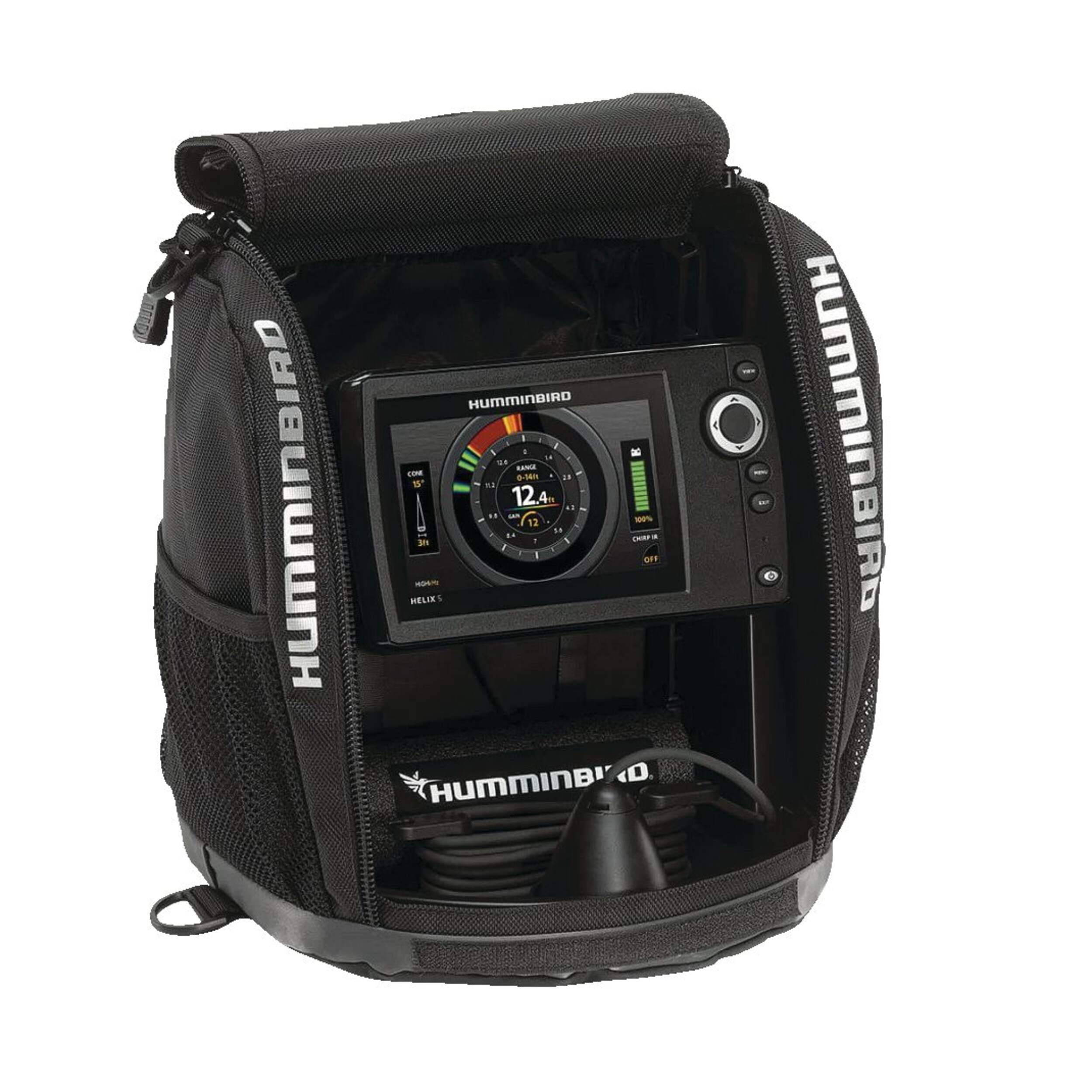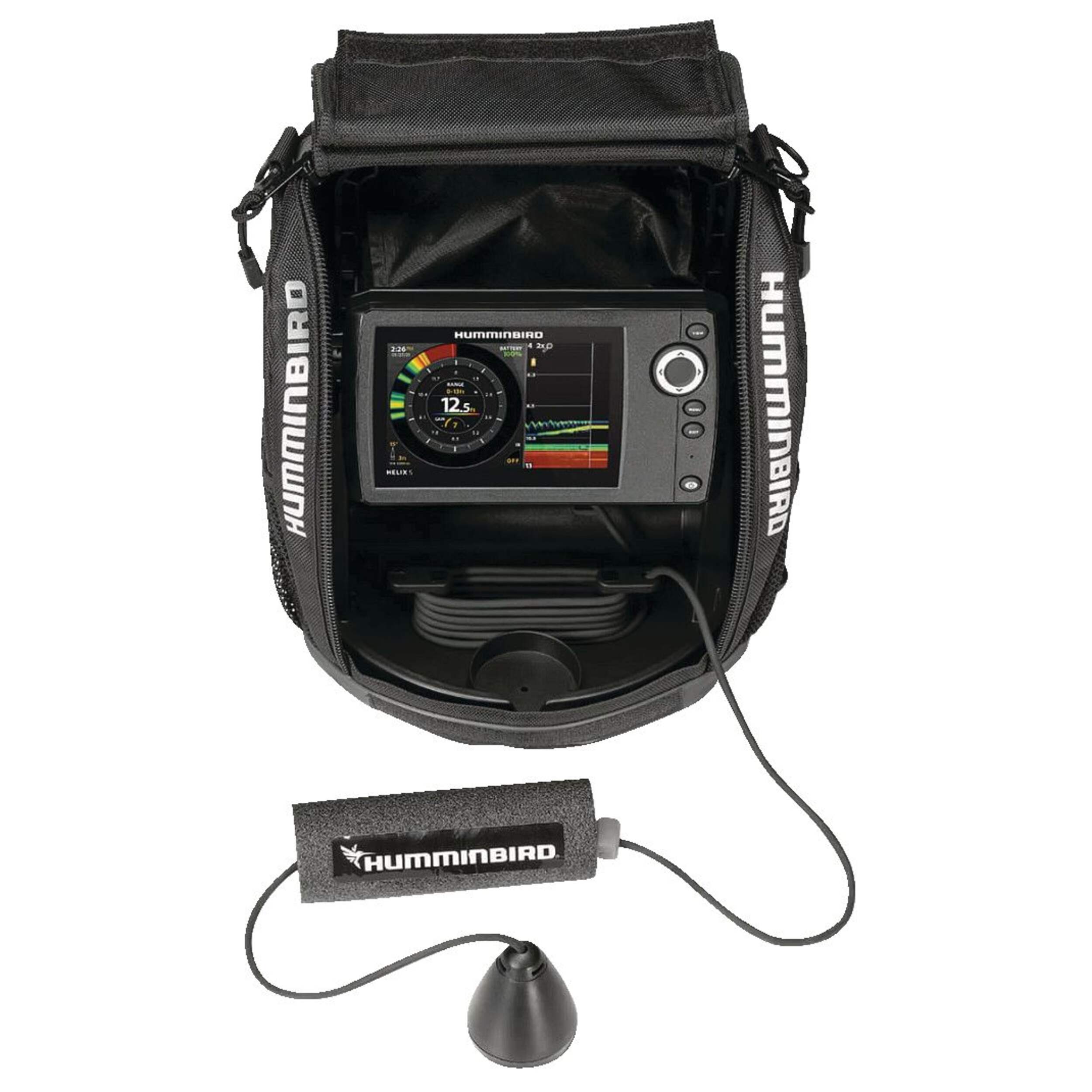 Bundle includes: (1) Ice Helix 5 CHIRP G3 fish finder, Dual Spectrum CHIRP ICE transducer, 9Ah battery and charger, ICE shuttle, hardware, power cable and a portable bag