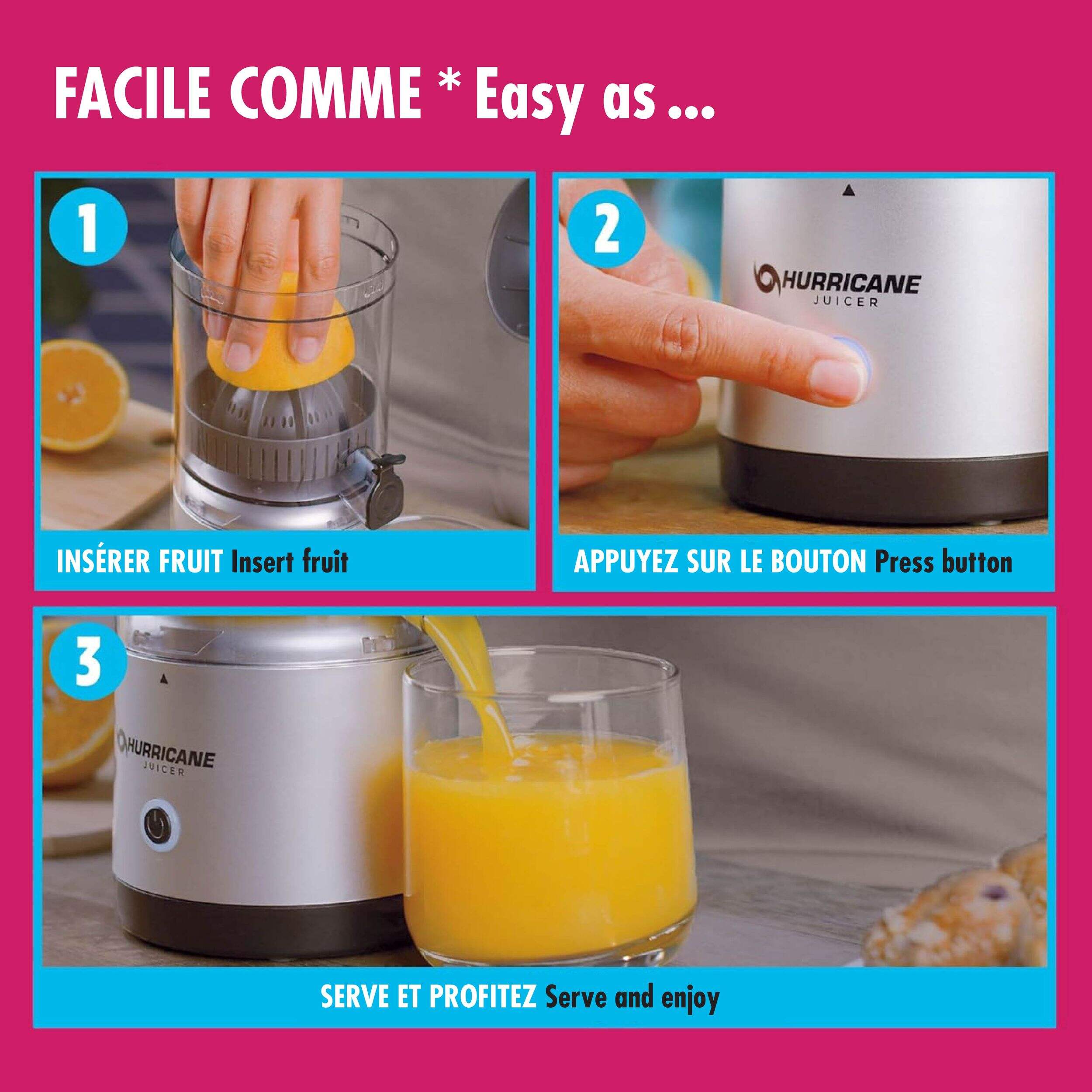 Enjoy freshly-made juice at home with the Hurricane Automatic Fruit Juicer. This innovative juicing machine is perfect for a variety of fruits, providing a convenient and efficient juicing experience. Its cordless and rechargeable design ensures ease of use, while the quiet operation makes it ideal for any kitchen.
