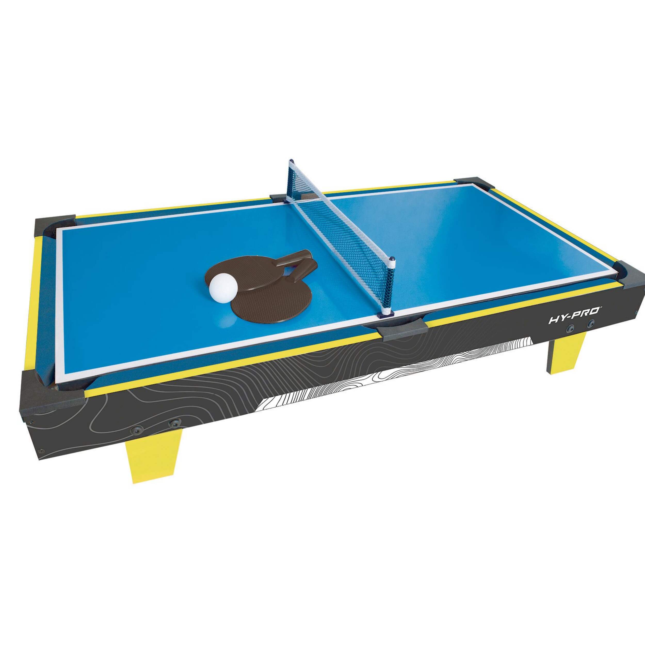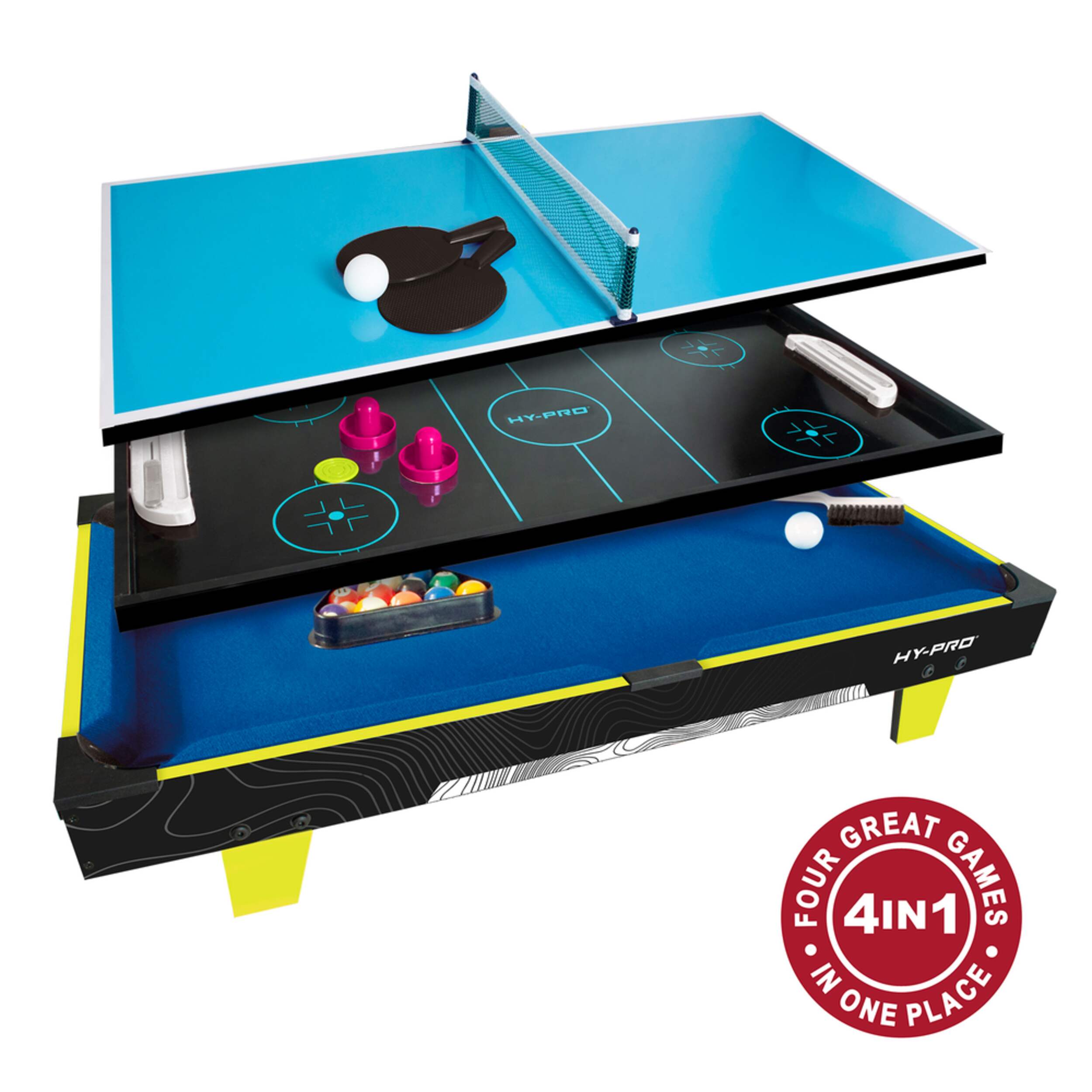 The Hy-Pro four-in-one tabletop game table lets you play any game you fancy, anytime and anyplace. Simply set up this 3 foot table and switch between table tennis, push hockey, basket-ball and billiards. It comes with all accessories for the games. Tired of just one sport? This table offers pool with American style spots and stripe balls, table tennis, push hockey and basket-ball. The durable veneers and thick 1.2 cm legs provide a sturdy yet fun play experience. Easy to assemble and store when you're done, this versatile table top game table helps keep the fun times rolling.