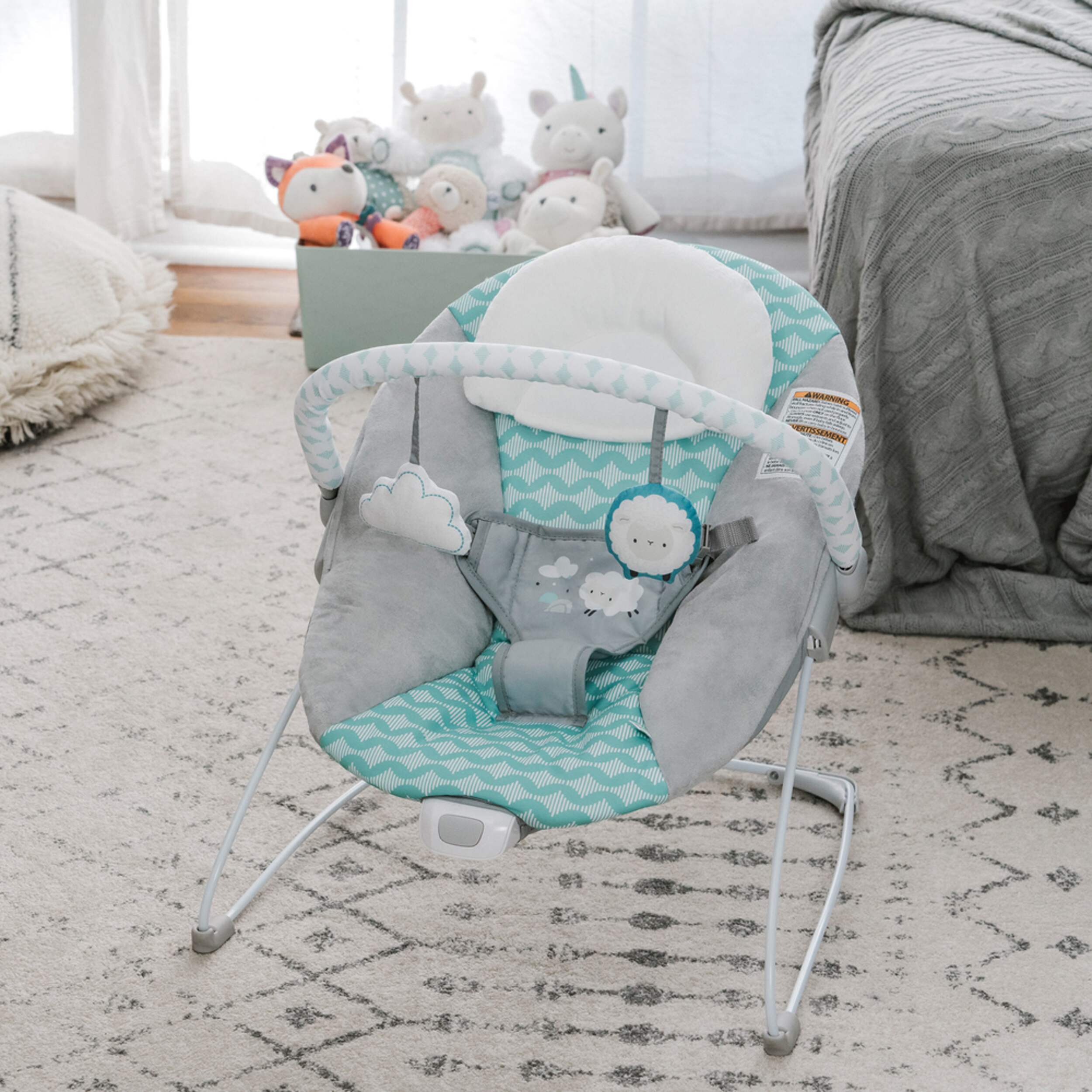 Removable toy bar with 2 toys entertains, while the soothing motion of the vibrating seat helps calm
