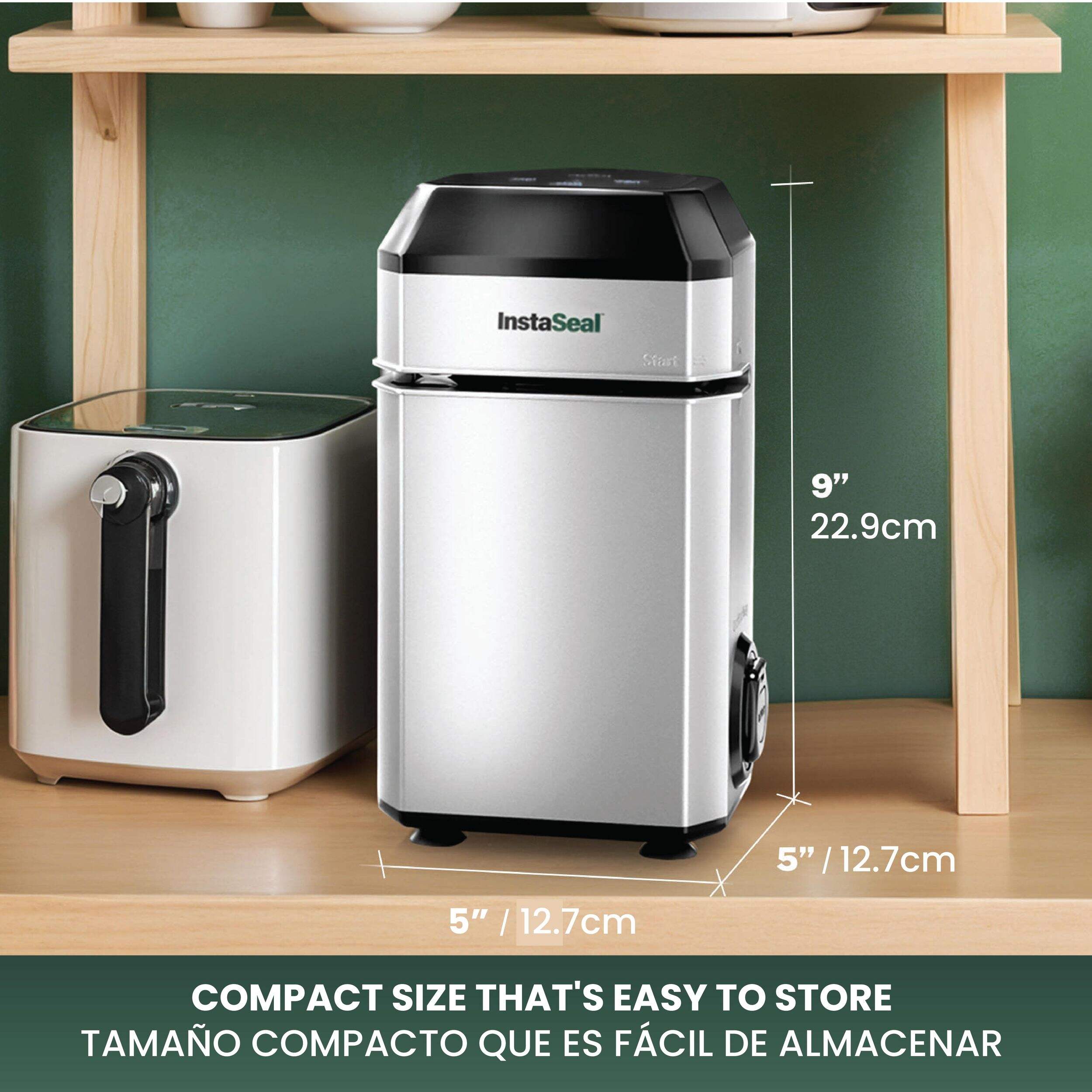 • Compact footprint: With dimensions of 5" W x 5" L x 9" H, the space-saving InstaSeal Vacuum Sealer is easy to store in your kitchen cabinet or countertop