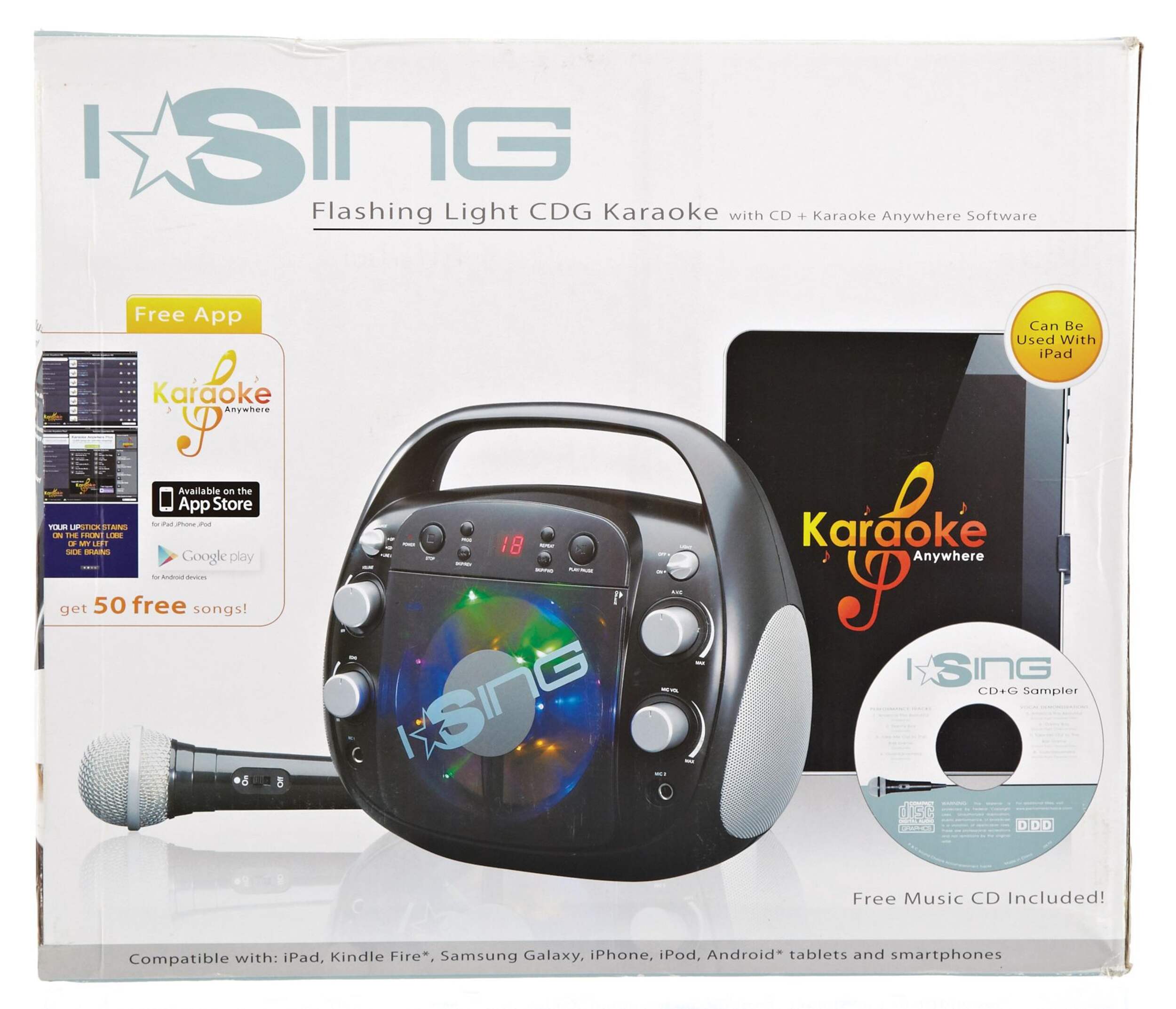 Includes the karaoke machine with stand and CD, plus a downloadable app
