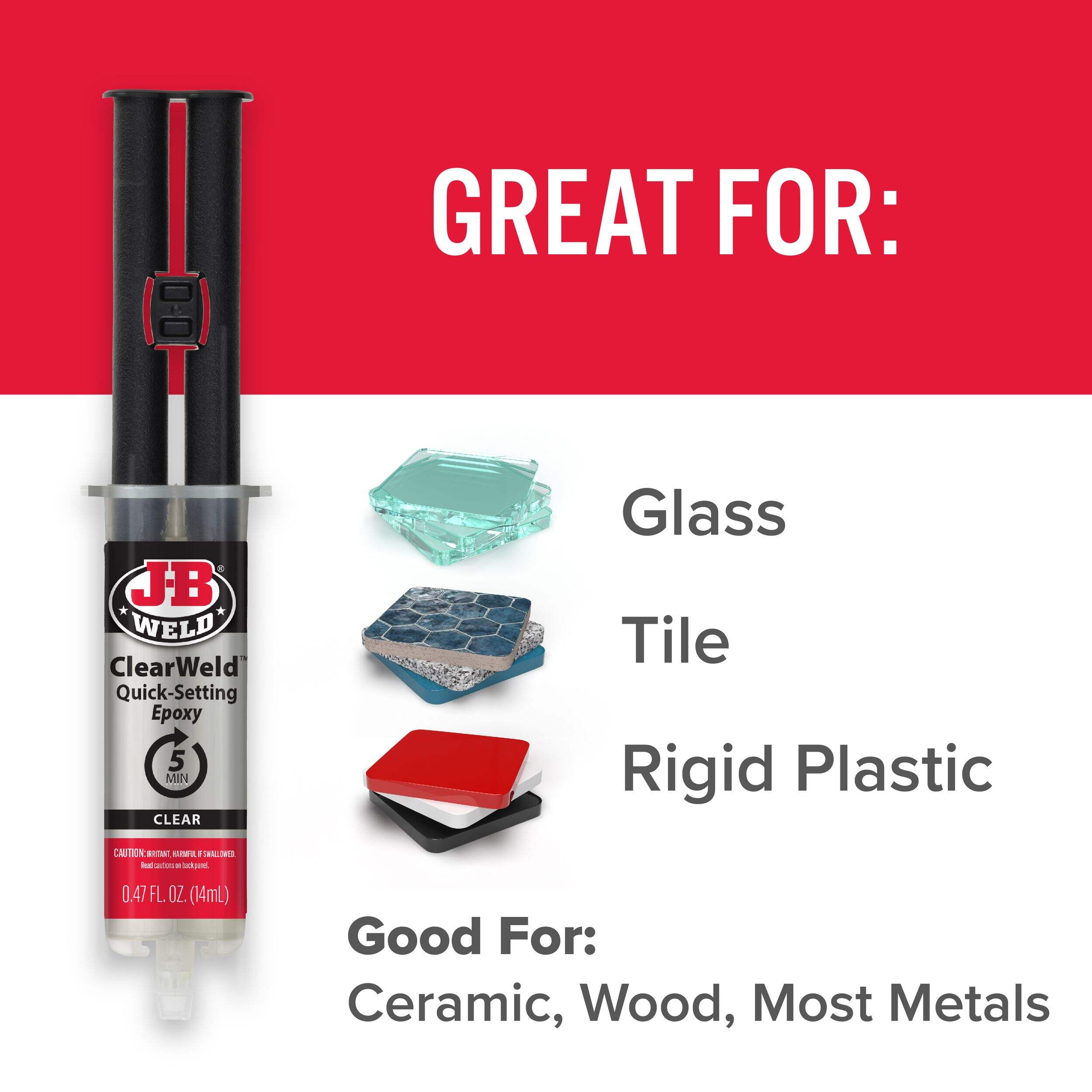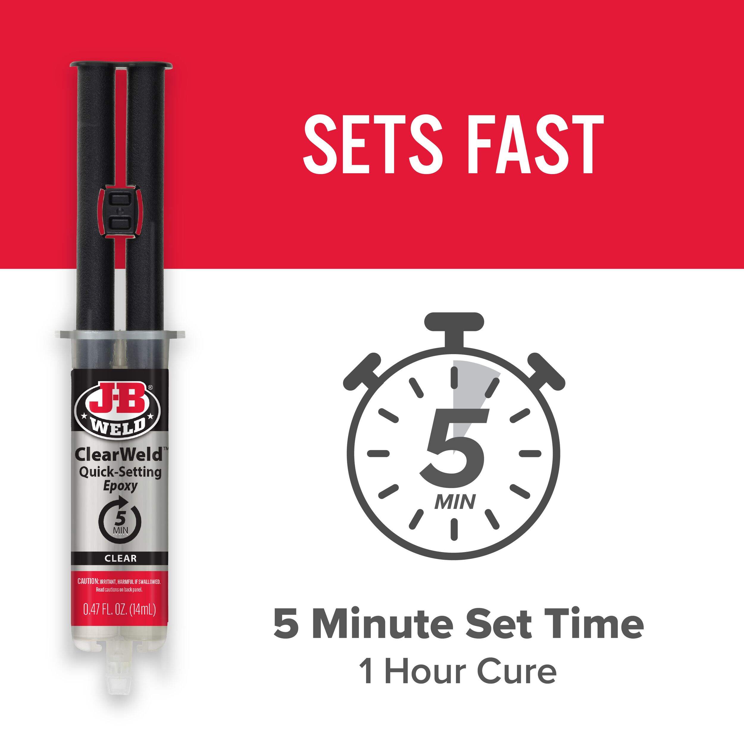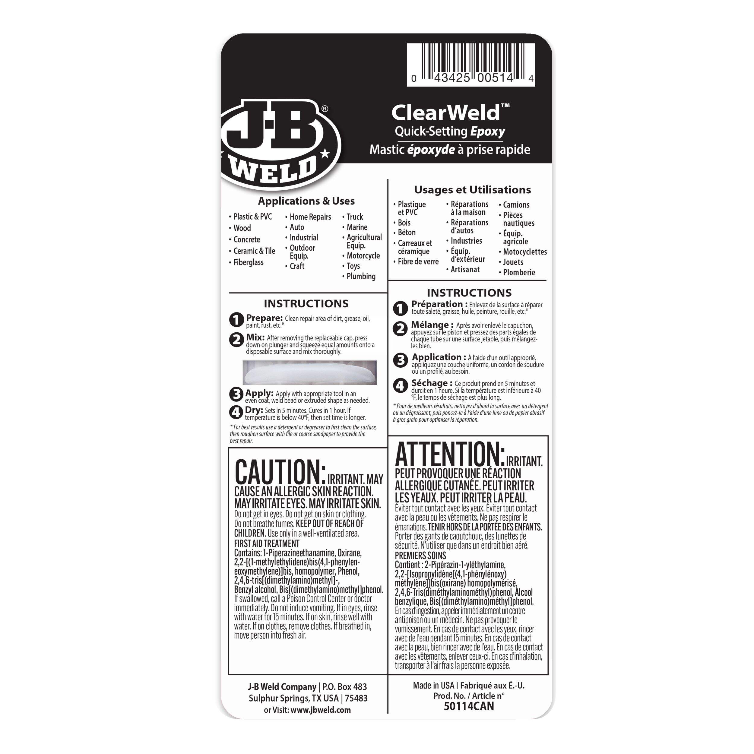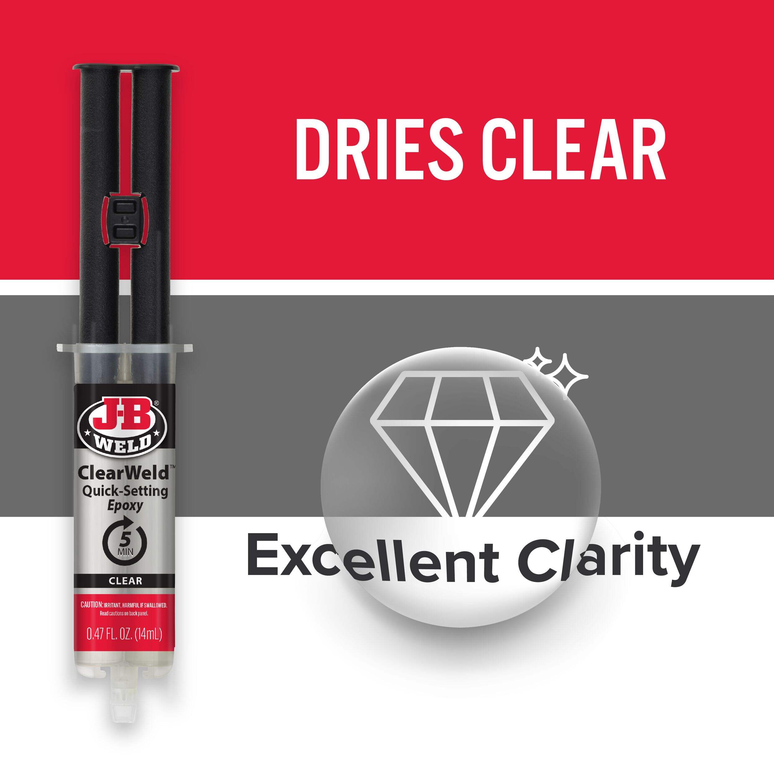 J-B Weld ClearWeld Syringe is a quick setting, multipurpose two part epoxy that provides a strong and lasting bond on most surfaces including tile, most plastics, ceramic, glass, wood and metal. ClearWeld is designed to cure with a clear, transparent bond when used at thicknesses of less than 15 mil. ClearWeld has a 1:1 mixing ratio, sets in 5 minutes and cures in 1 hour. With a tensile strength of 3900 PSI, ClearWeld sets to a hard, permanent bond.