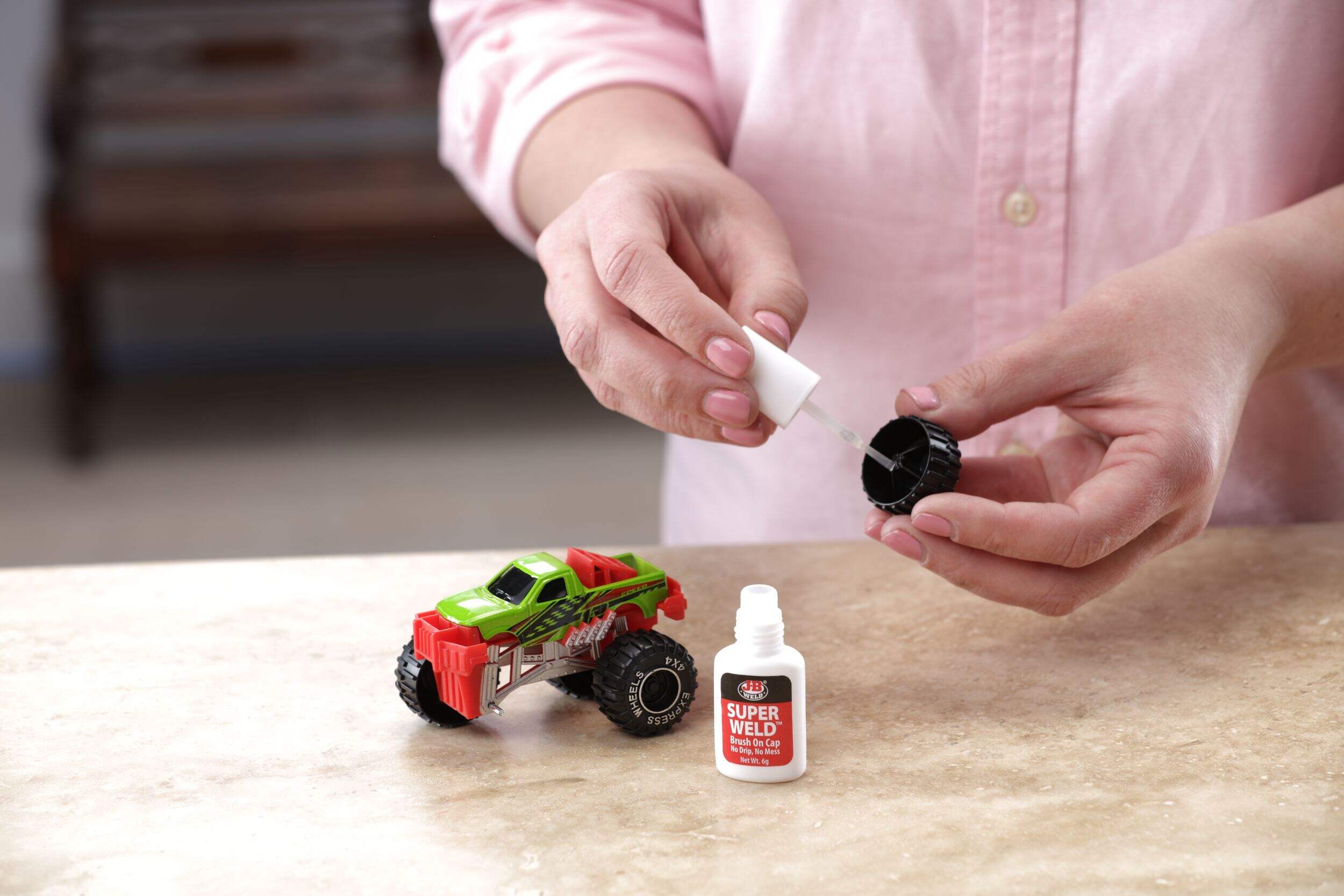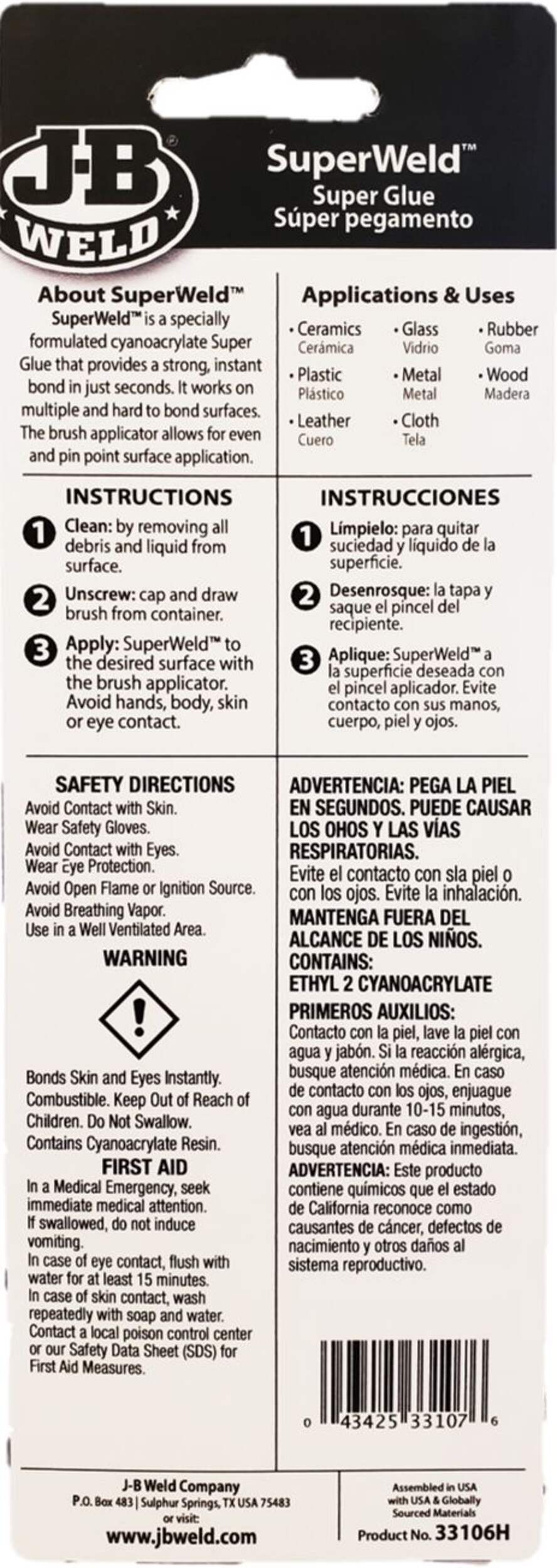 SuperWeld™ is a specially formulated cyanoacrylate Super Glue that provides a strong, instant bond in just seconds. It works on multiple and hard to bond surfaces. The brush applicator (6g size) allows for even surface application. The precision tip applicator on the 20g size allows for pin point surface application.