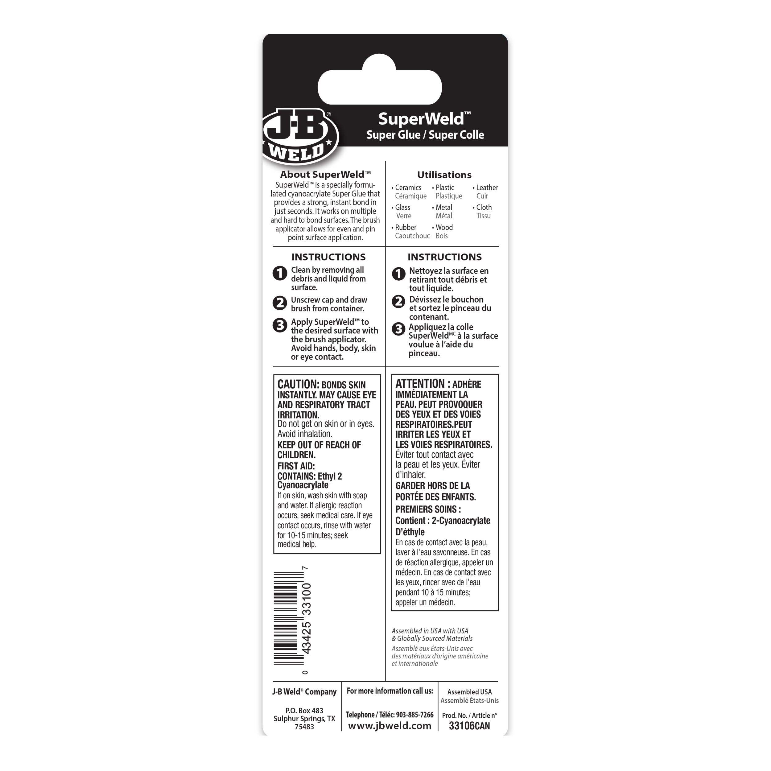 J-B Weld SuperWeld is a specially formulated cyanoacrylate super glue that provides a strong, instant bond in just seconds