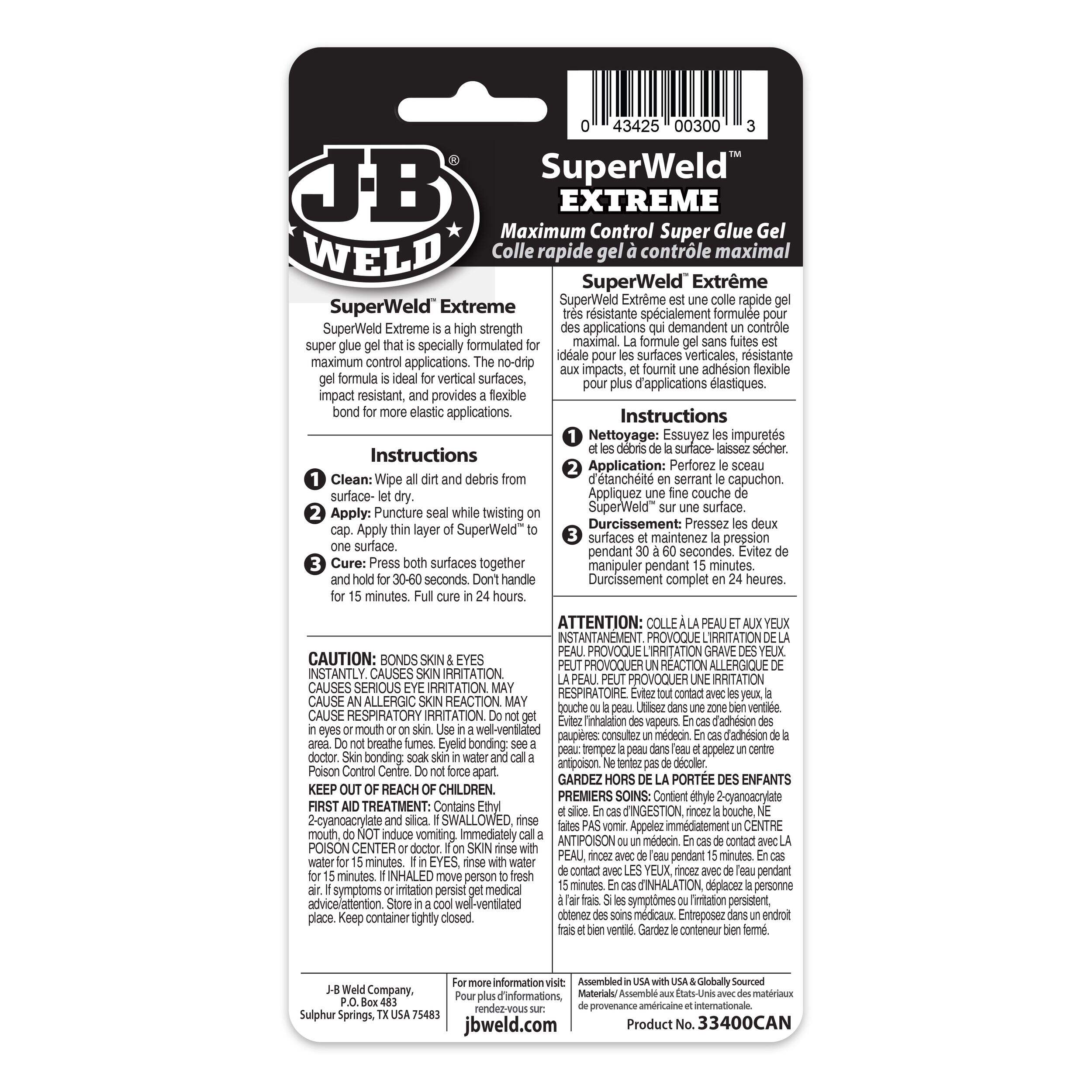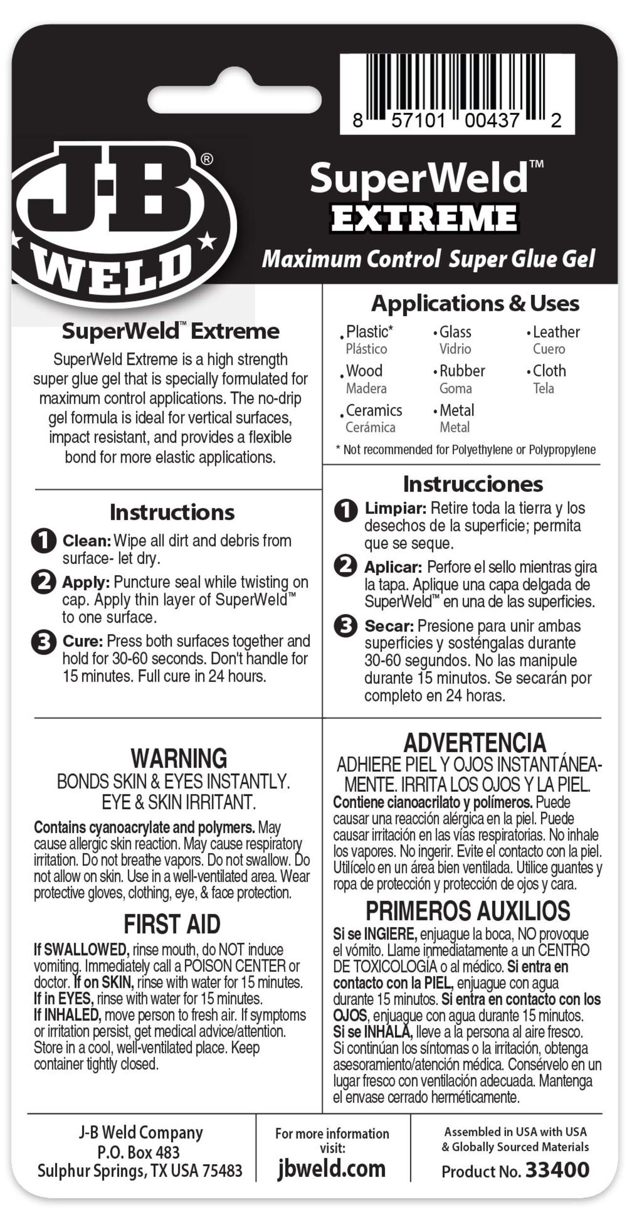 SuperWeld™ Extreme is a specially formulated Super Glue that provides a strong, flexible bond and cures in 24 hours. SuperWeld™ Extreme has a precision tip, no drip formula and is ideal for both vertical and horizontal surfaces! SuperWeld™ Extreme is impact resistant and has a flexible bond allowing it be great for plastics, leather, rubber, glass, metal, and more!