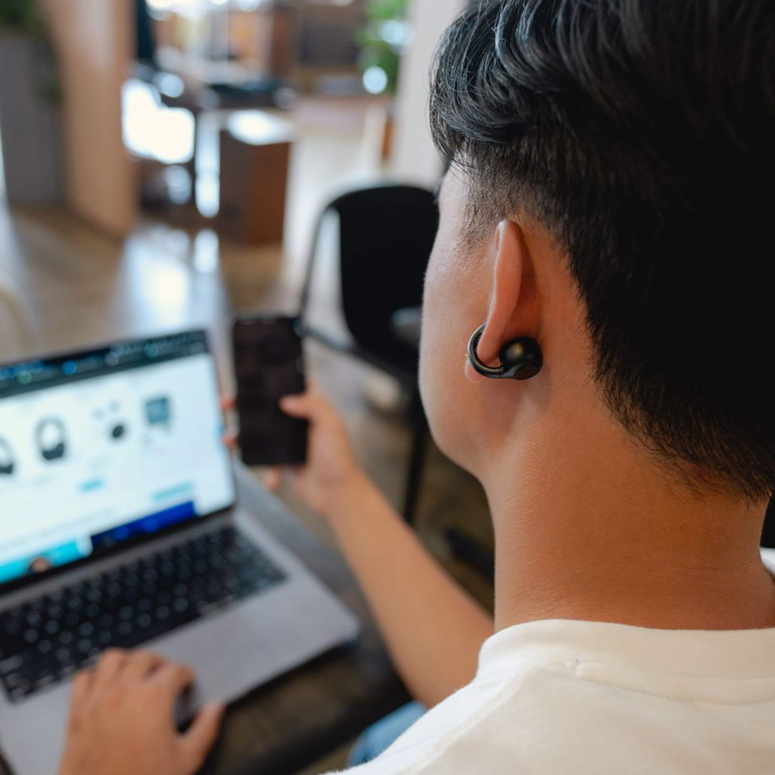 Introducing the Flex Open Earbuds, the perfect blend of technology and ergonomic design for your everyday life. The revolutionary clip-on cuff design ensures a secure, lightweight fit, seamlessly blending your surroundings with immersive open-ear sound. Whether you're running errands, walking, or navigating a busy city, these earbuds adapt to your personal sound preferences for an unparalleled listening experience. With seamless Bluetooth connectivity, you can effortlessly switch from a podcast on your laptop to a call on your phone, while noise-canceling microphones ensure crystal-clear calls. Built for your dynamic lifestyle, the Flex Open Earbuds are your ideal everyday companion.