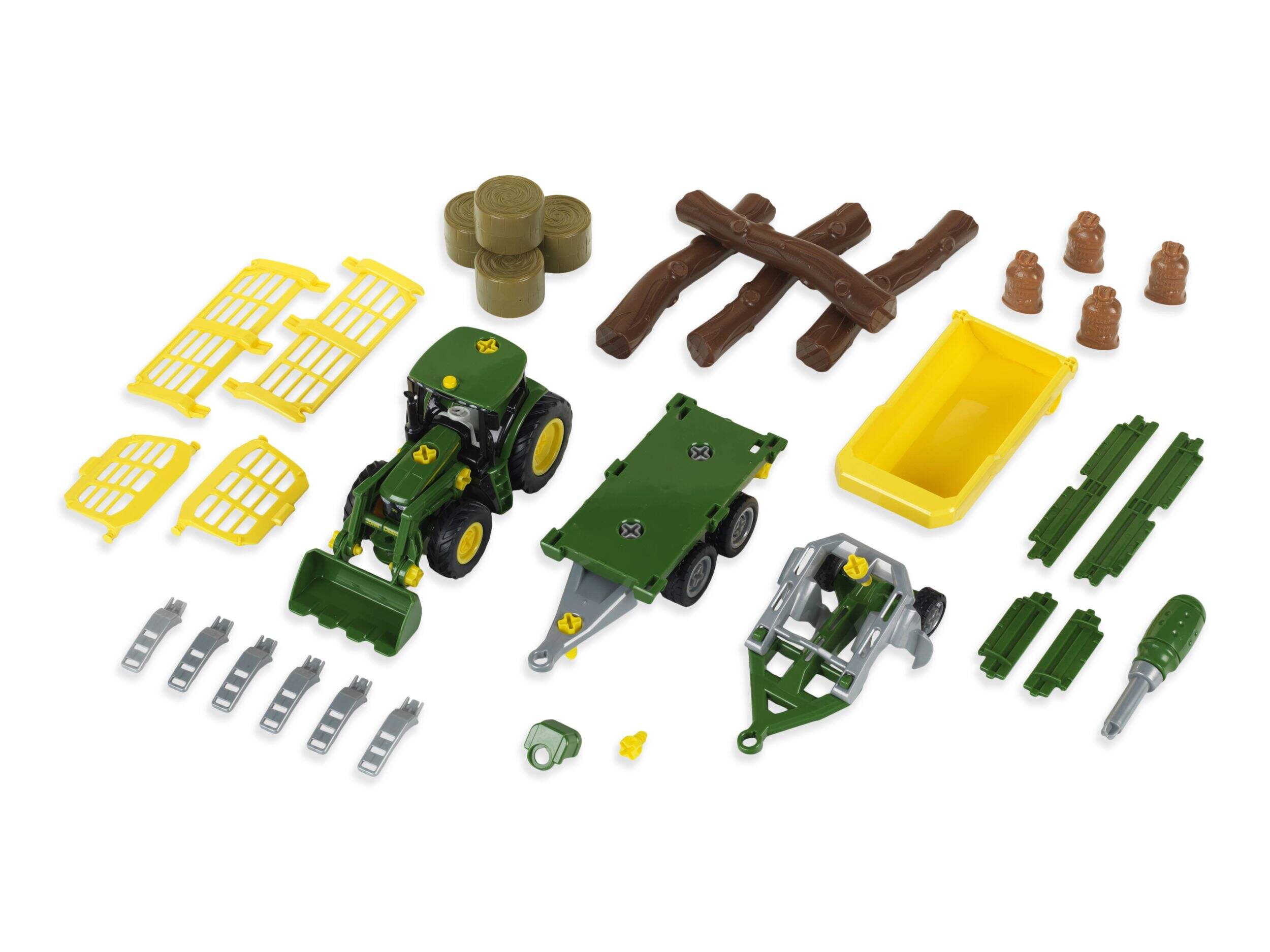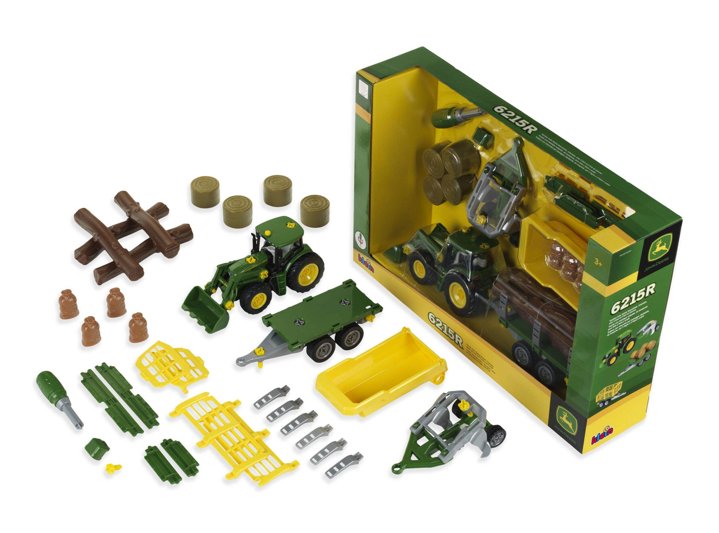 Set includes: John Deere Tractor with tipping dumper, transport, wood and hay cart trailer, and plough