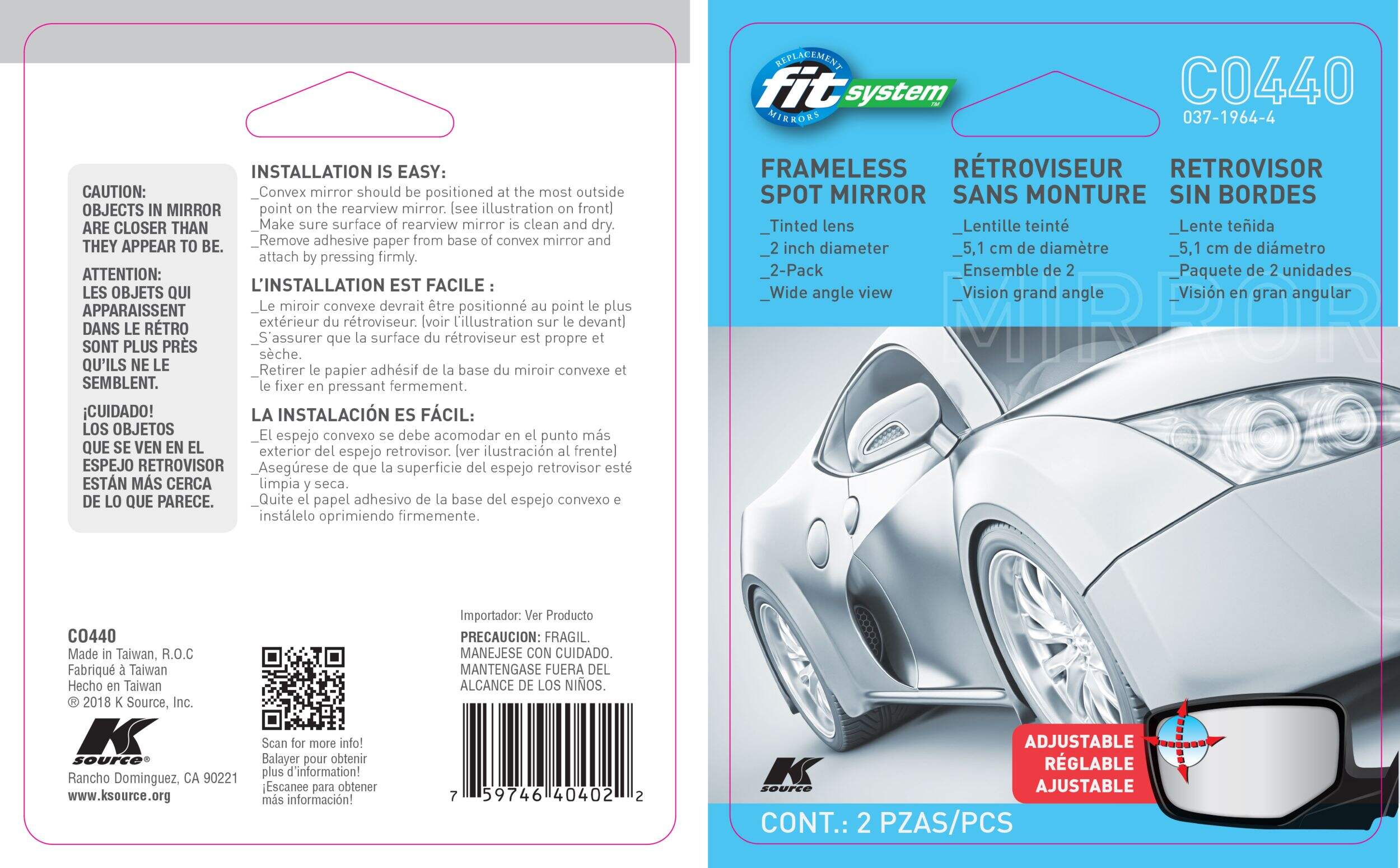 K-Source's Adjustable Frameless Blind Spot Mirror is designed to expand your field of view while driving. This 2-pack includes a convex lens for increased visibility and a tinted lens to reduce glare. The mirrors are 2" (5 cm) in size and come with adhesive tape for simple, hassle-free stick-on installation. The wide angle view offered by these mirrors enhances safety and maneuverability. These are frameless for a sleek, modern look.