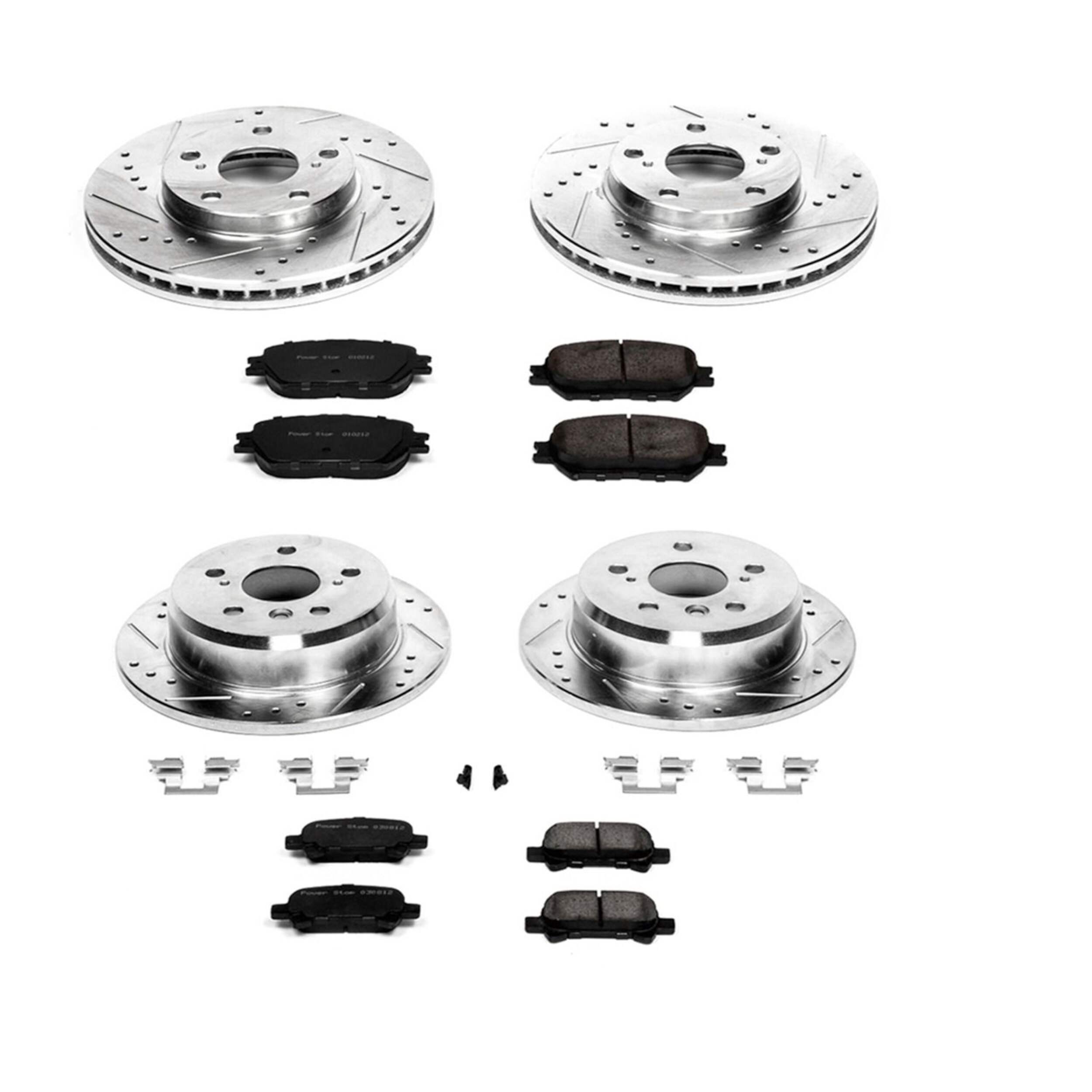 The Power Stop Z23 Evolution Sport Performance Brake Kit - Front & Rear delivers enhanced braking power with its Z23 Carbon-Fiber Ceramic formula. It offers dust-free operation and virtually noise-free braking due to premium rubberized shims. The kit includes drilled and slotted performance rotors for maximum cooling. The rotors, excluding hub assemblies, are zinc-plated to guard against rust. The package also contains ceramic brake lubricant, a premium hardware kit, 2 sets of brake pads, and 4 rotors. Additionally, the installation hardware is also included, making it a comprehensive brake kit for your vehicle.