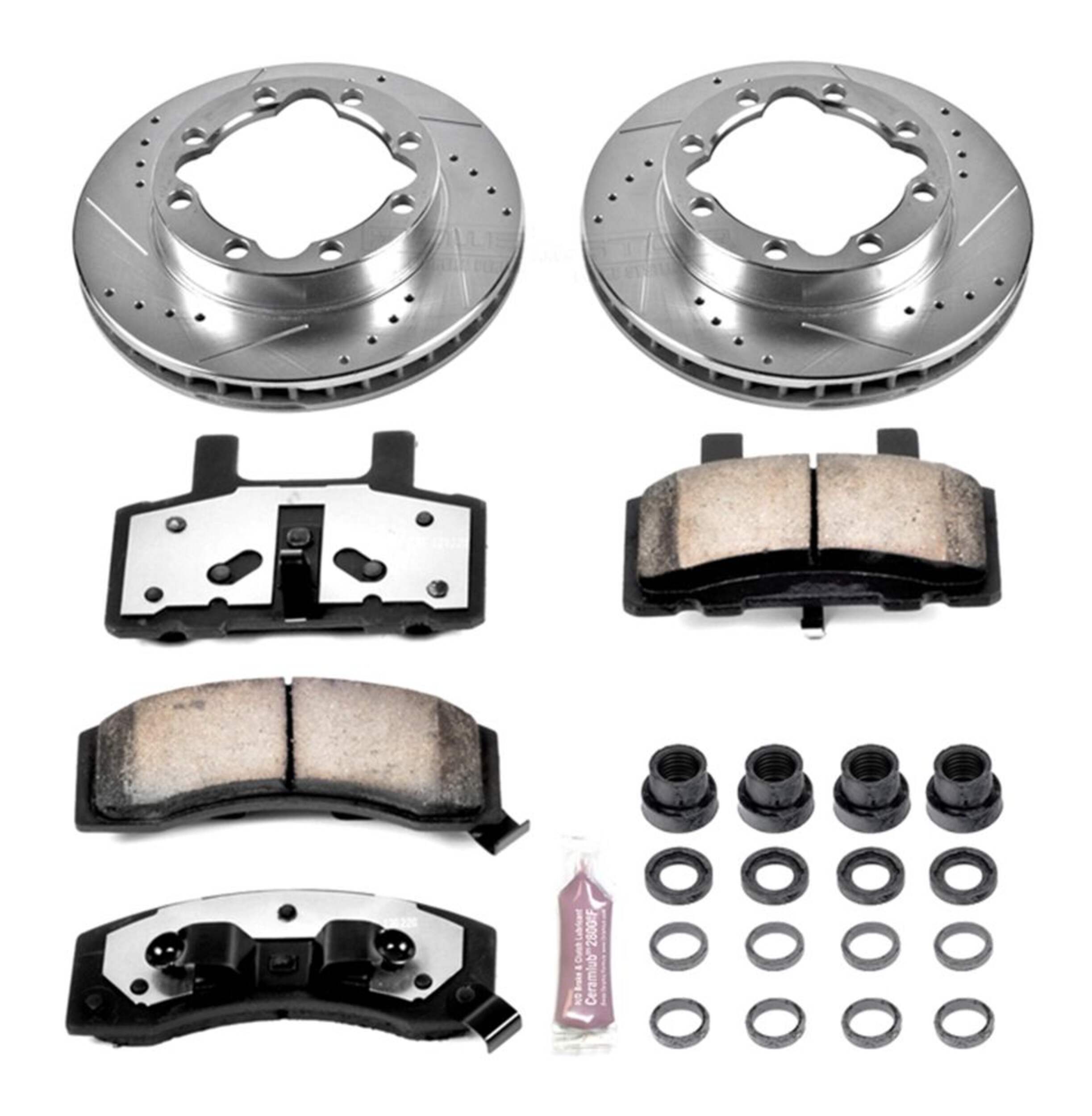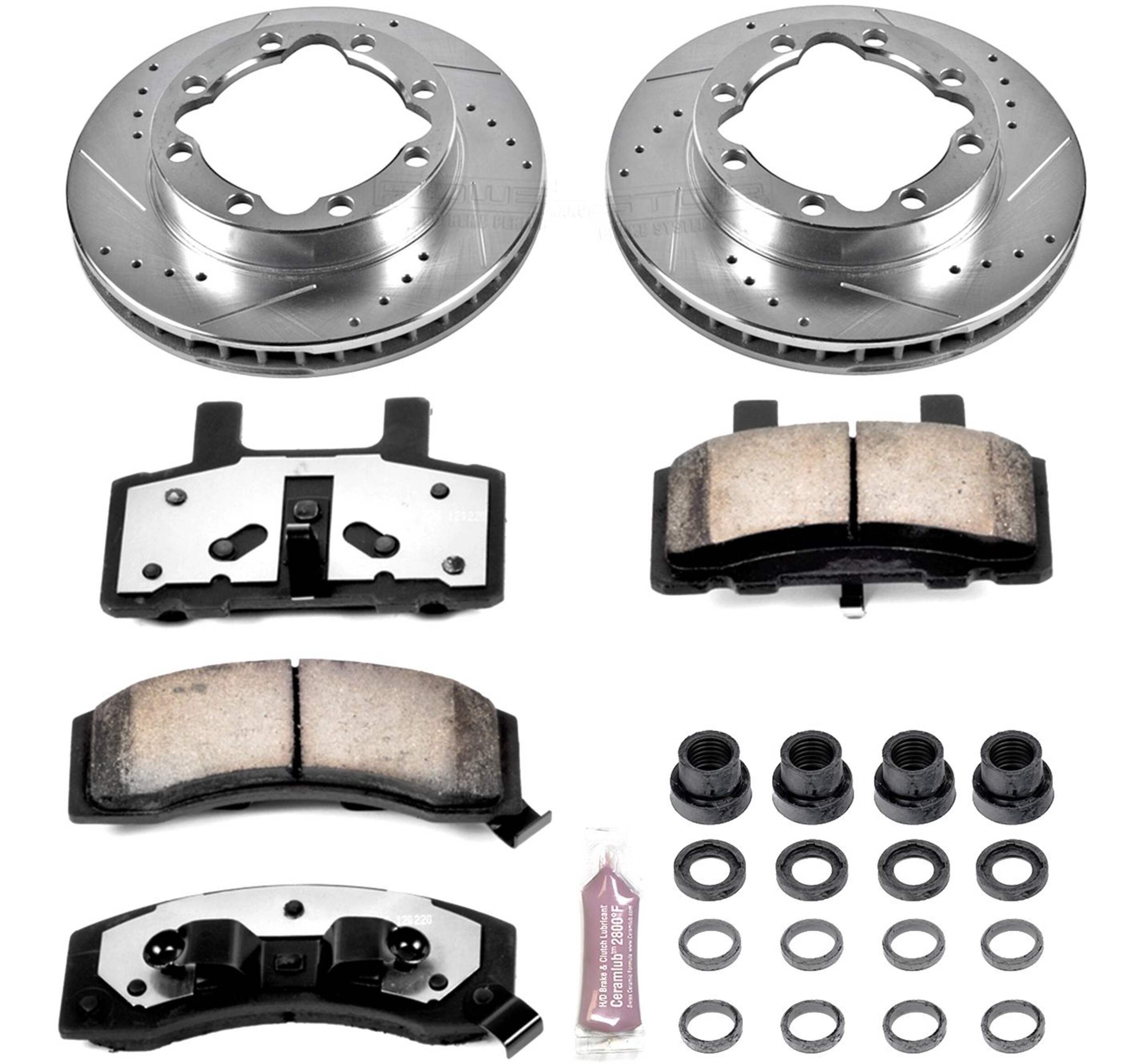 The Power Stop Z36 Truck & Tow Brake Kit provides extreme braking performance, specifically designed for trucks or 4x4s. The Z36 Carbon-Fiber Ceramic formula ensures dust-free braking, while premium stainless steel shims allow superior heat dissipation and virtually noise-free braking. The kit includes drilled and slotted performance rotors for optimal cooling, plated in zinc (excluding hub assemblies) for maximum rust protection. A ceramic brake lubricant and a premium stainless steel hardware kit are also included for your convenience.