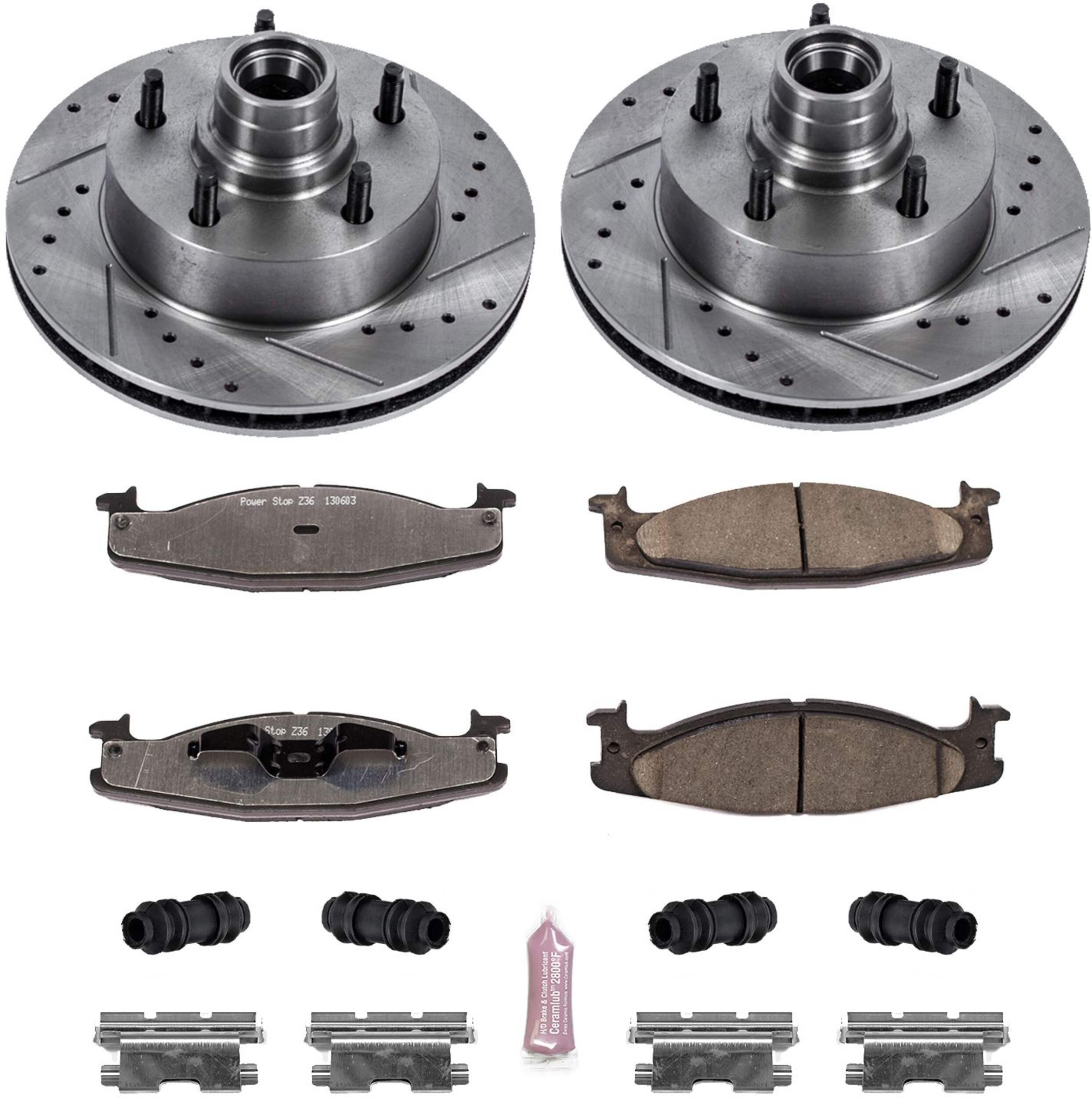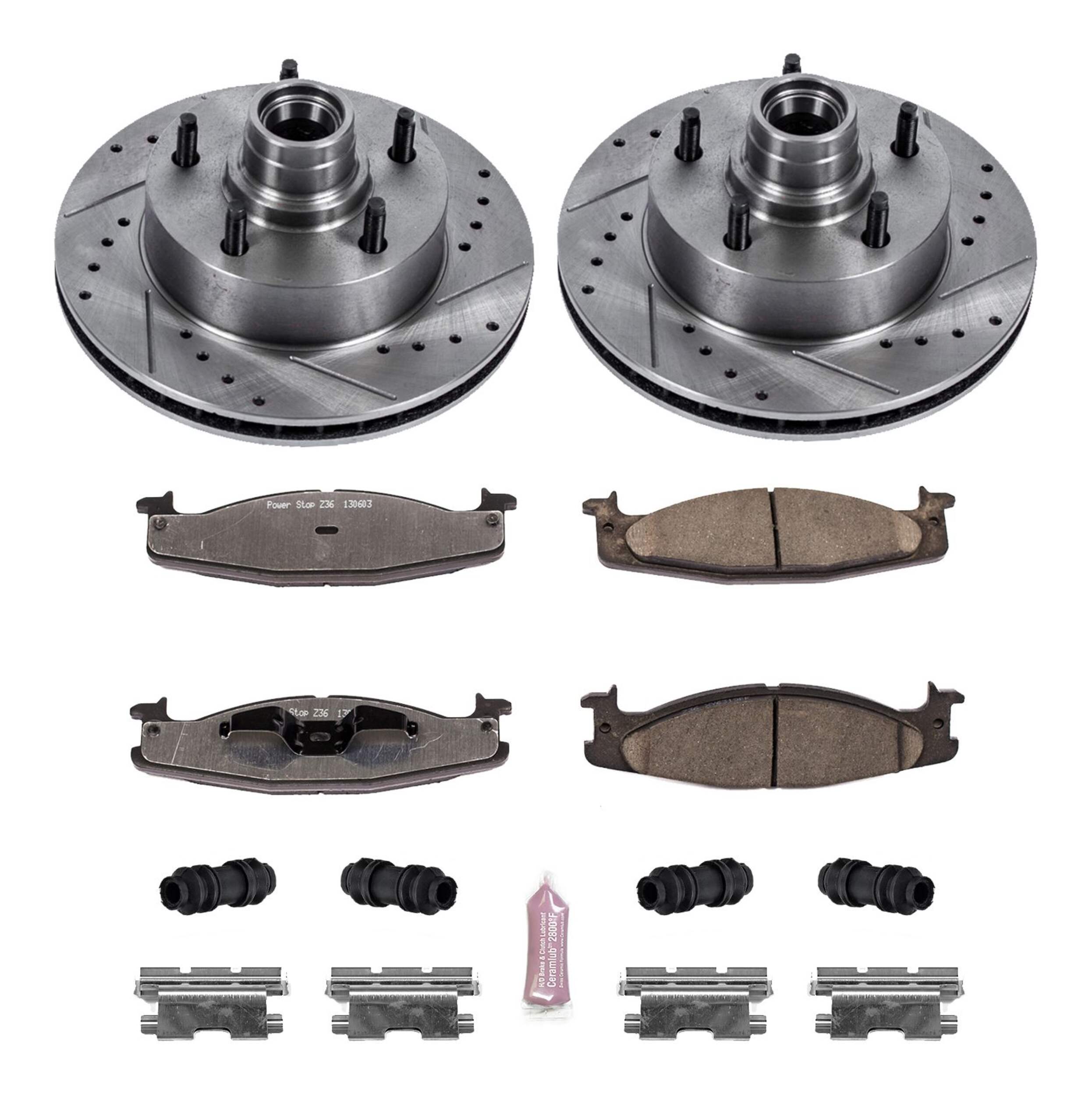 The Power Stop Z36 Truck & Tow Brake Kit provides extreme braking performance, specifically designed for trucks or 4x4s. The Z36 Carbon-Fiber Ceramic formula ensures dust-free braking, while premium stainless steel shims allow superior heat dissipation and virtually noise-free braking. The kit includes drilled and slotted performance rotors for optimal cooling, plated in zinc (excluding hub assemblies) for maximum rust protection. A ceramic brake lubricant and a premium stainless steel hardware kit are also included for your convenience.
