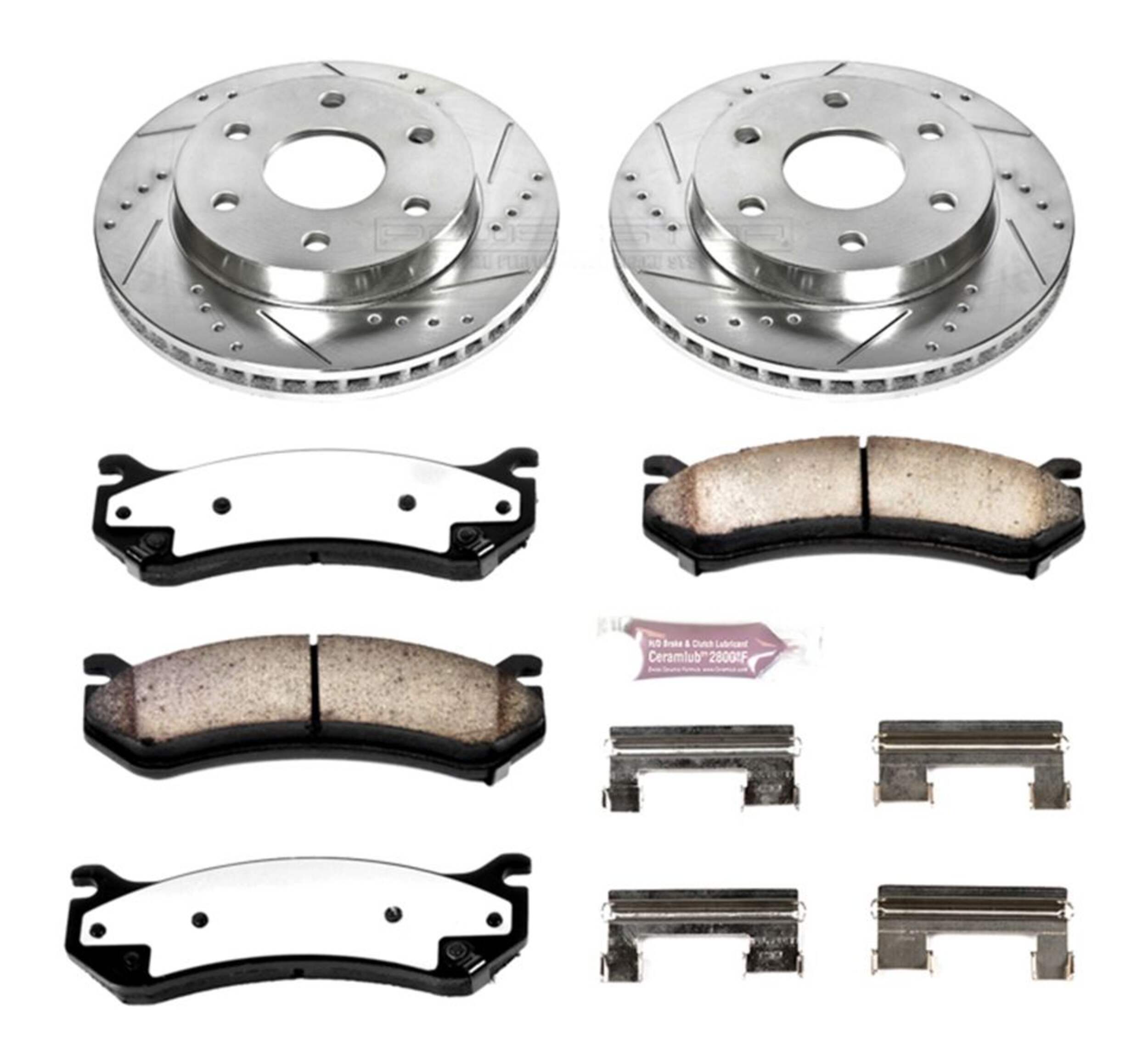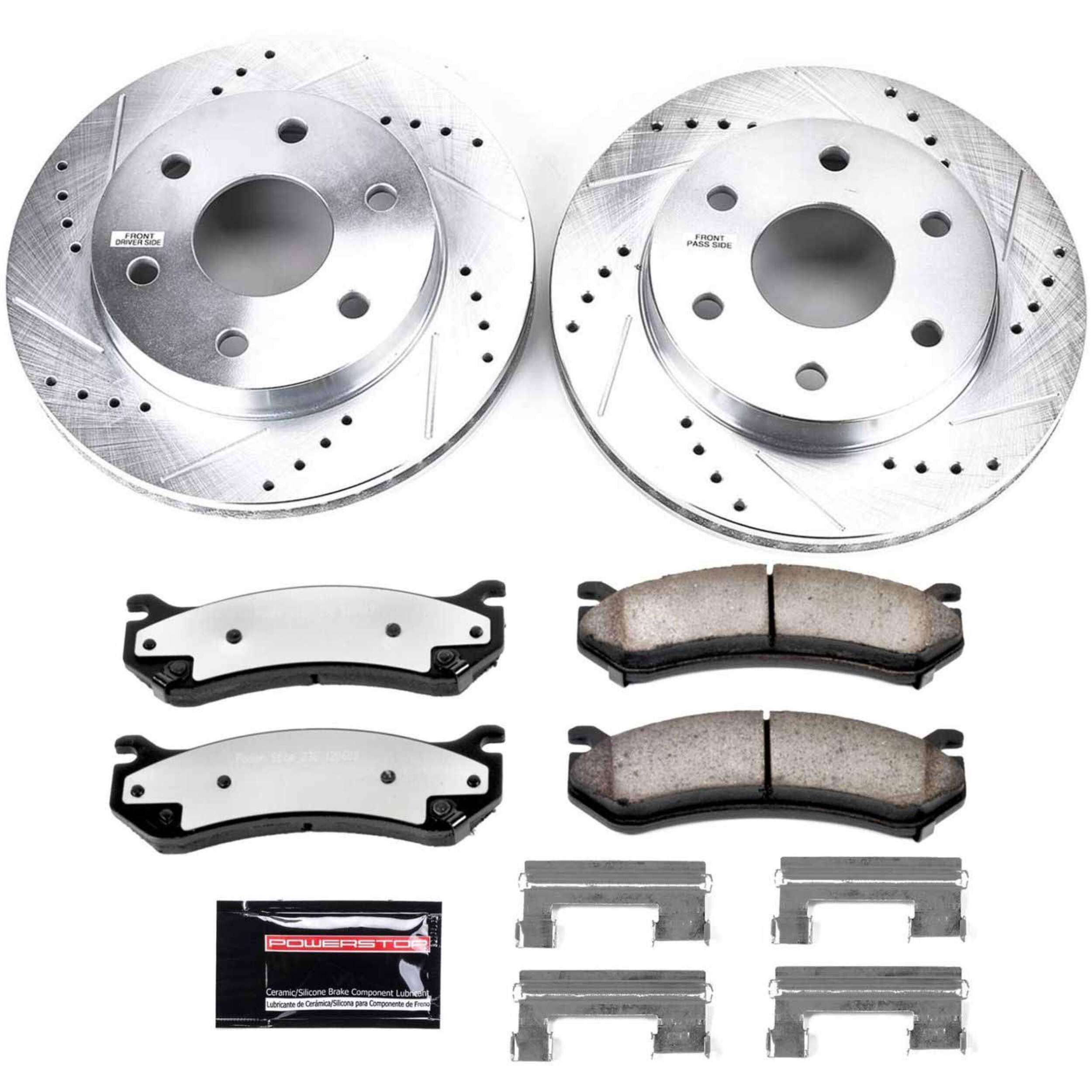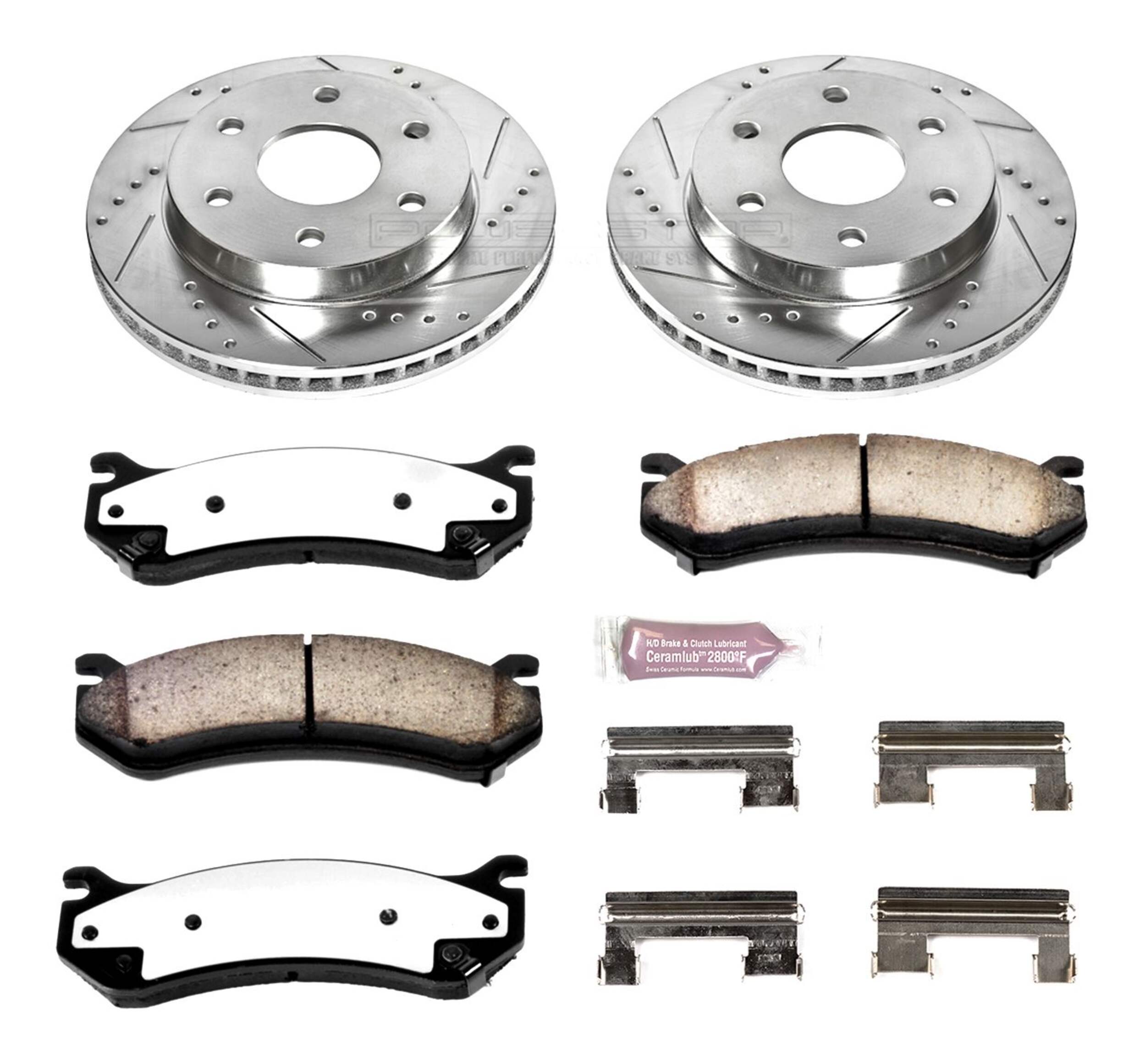 The Power Stop Z36 Truck & Tow Brake Kit provides extreme braking performance, specifically designed for trucks or 4x4s. The Z36 Carbon-Fiber Ceramic formula ensures dust-free braking, while premium stainless steel shims allow superior heat dissipation and virtually noise-free braking. The kit includes drilled and slotted performance rotors for optimal cooling, plated in zinc (excluding hub assemblies) for maximum rust protection. A ceramic brake lubricant and a premium stainless steel hardware kit are also included for your convenience.