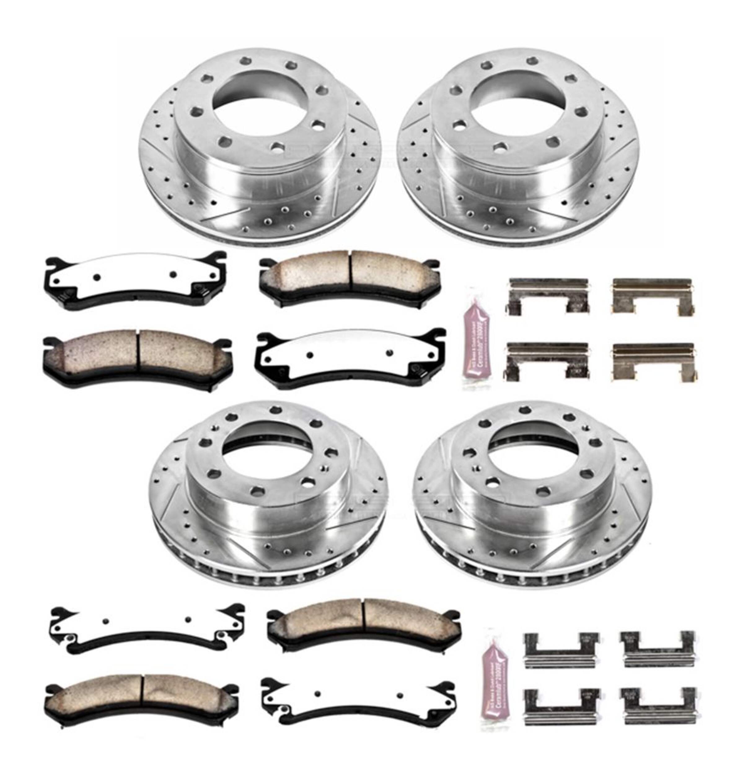 The Power Stop Z36 Truck & Tow Brake Kit provides extreme braking performance, specifically designed for trucks or 4x4s. The Z36 Carbon-Fiber Ceramic formula ensures dust-free braking, while premium stainless steel shims allow superior heat dissipation and virtually noise-free braking. The kit includes drilled and slotted performance rotors for optimal cooling, plated in zinc (excluding hub assemblies) for maximum rust protection. A ceramic brake lubricant and a premium stainless steel hardware kit are also included for your convenience.
