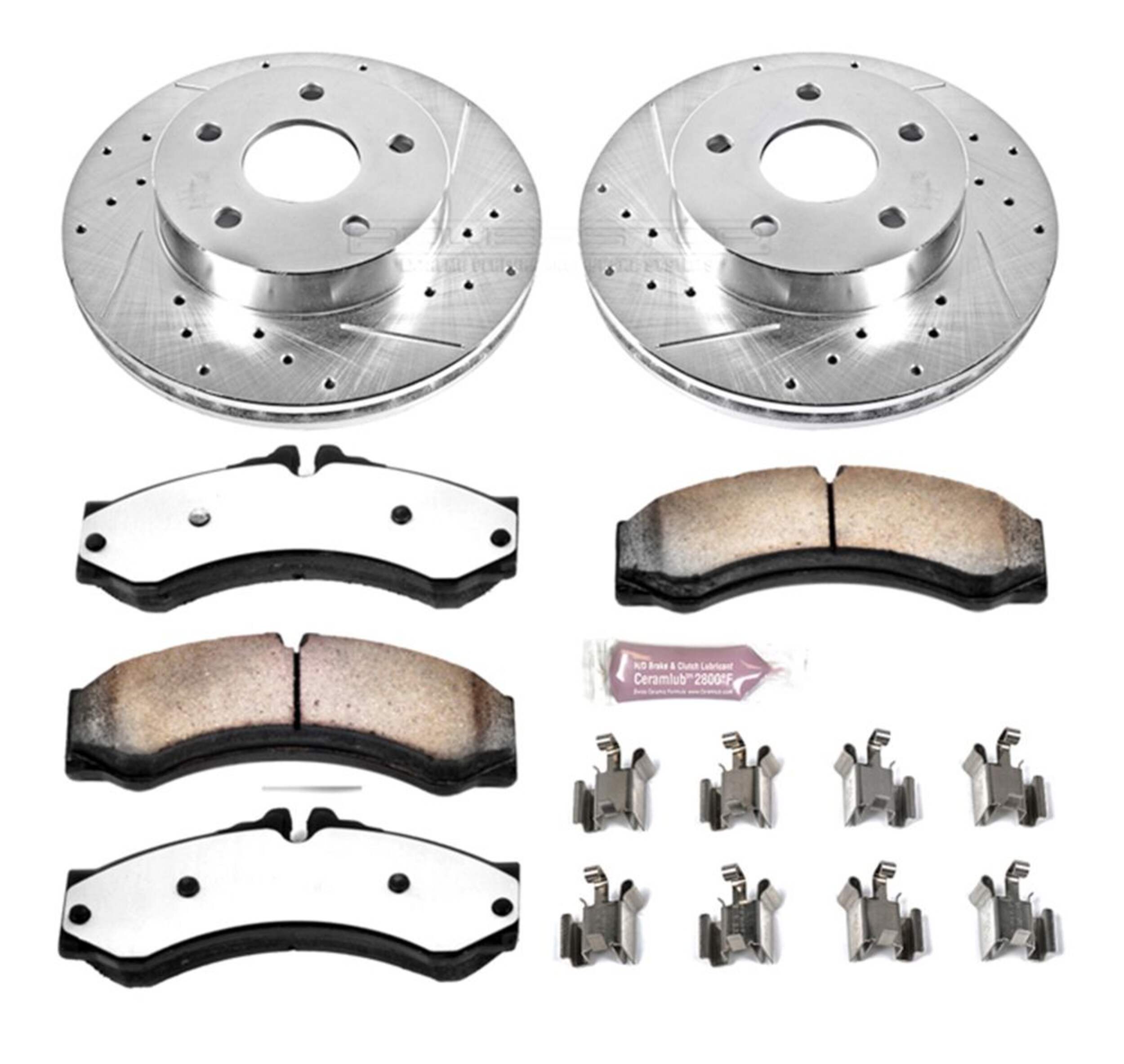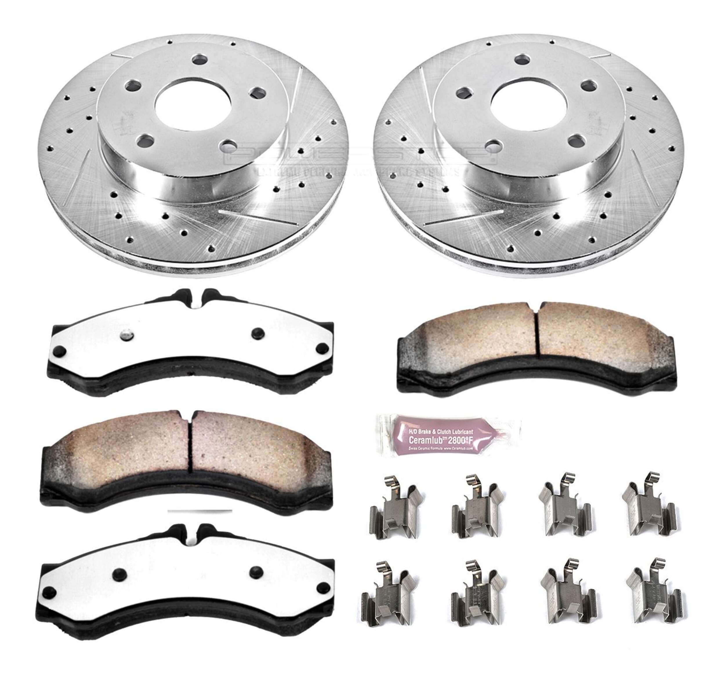 The Power Stop Z36 Truck & Tow Brake Kit provides extreme braking performance, specifically designed for trucks or 4x4s. The Z36 Carbon-Fiber Ceramic formula ensures dust-free braking, while premium stainless steel shims allow superior heat dissipation and virtually noise-free braking. The kit includes drilled and slotted performance rotors for optimal cooling, plated in zinc (excluding hub assemblies) for maximum rust protection. A ceramic brake lubricant and a premium stainless steel hardware kit are also included for your convenience.