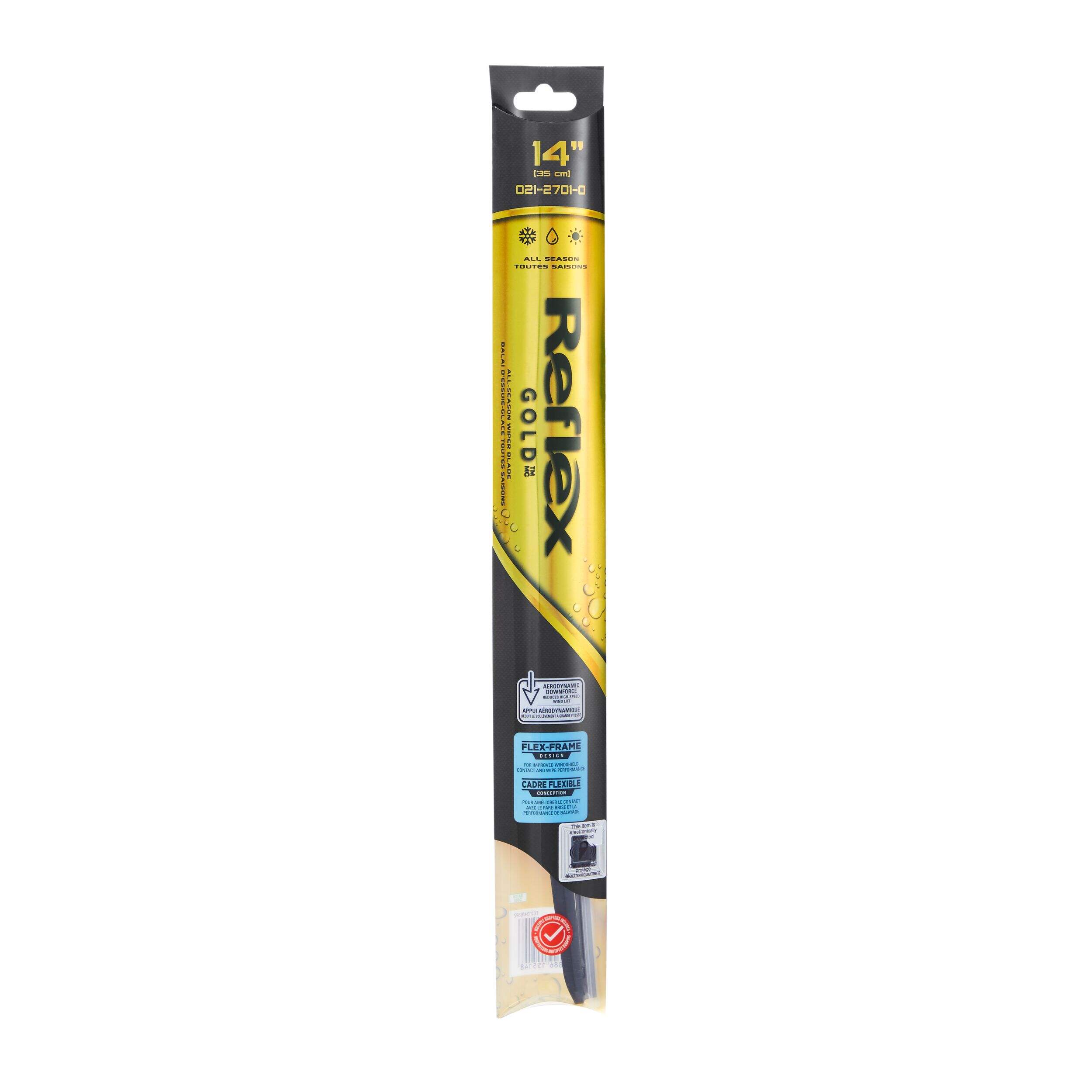 The Reflex Gold Wiper Blade features an aerodynamic, flexible design that effortlessly conforms to windshields while resisting the build-up of ice and snow. A lower wiper height cuts down on annoying noise, while the unique rotational construction of the wiper is designed to move condensation, snow, and rain from the windshield more efficiently. This wiper is also simple to install, with adaptors included.