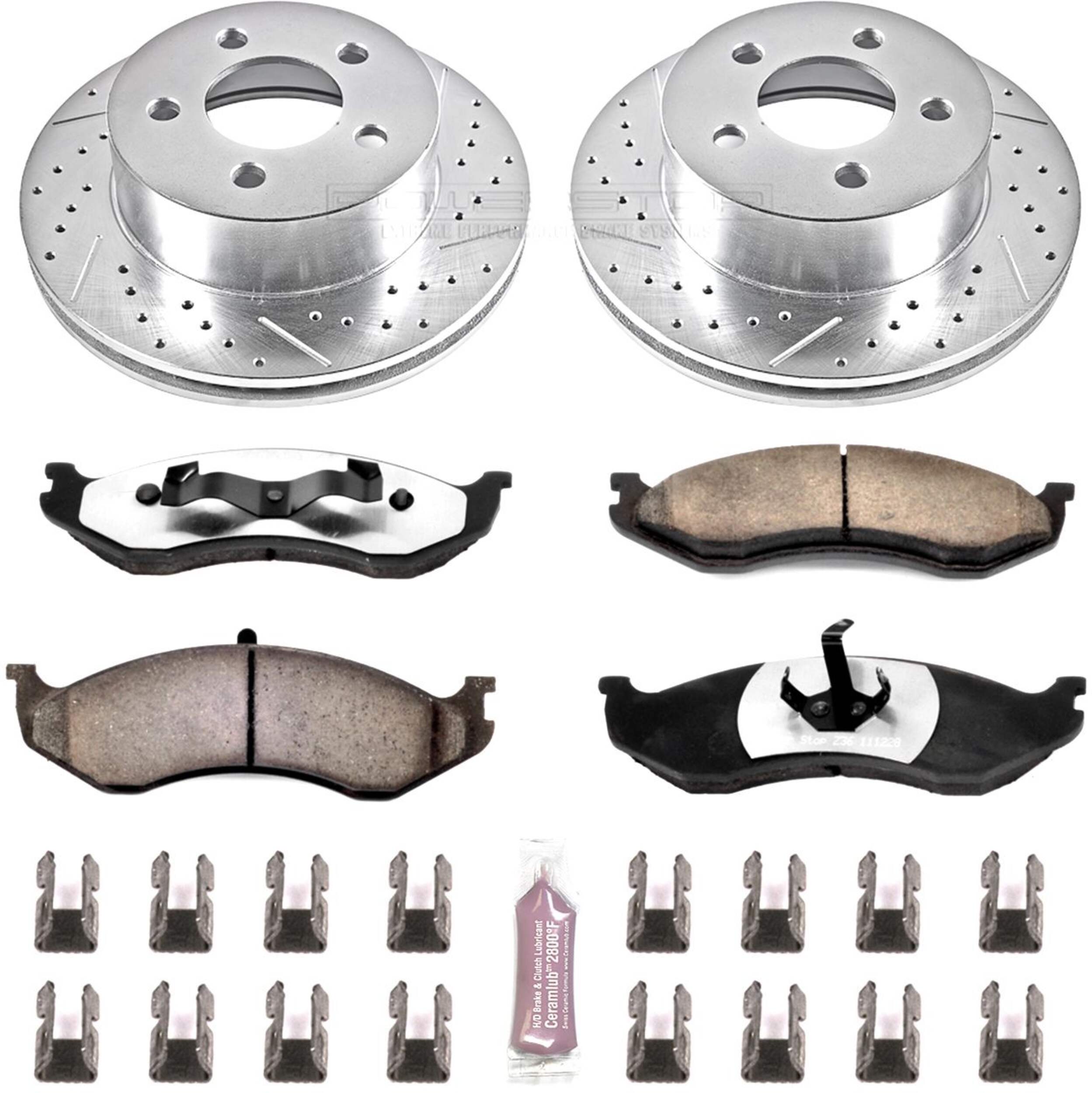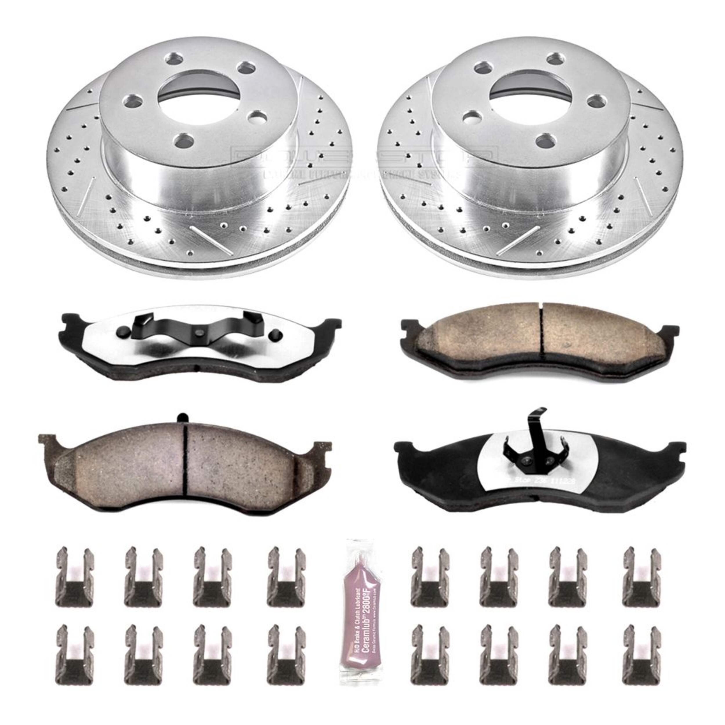 The Power Stop Z36 Truck & Tow Brake Kit provides extreme braking performance, specifically designed for trucks or 4x4s. The Z36 Carbon-Fiber Ceramic formula ensures dust-free braking, while premium stainless steel shims allow superior heat dissipation and virtually noise-free braking. The kit includes drilled and slotted performance rotors for optimal cooling, plated in zinc (excluding hub assemblies) for maximum rust protection. A ceramic brake lubricant and a premium stainless steel hardware kit are also included for your convenience.