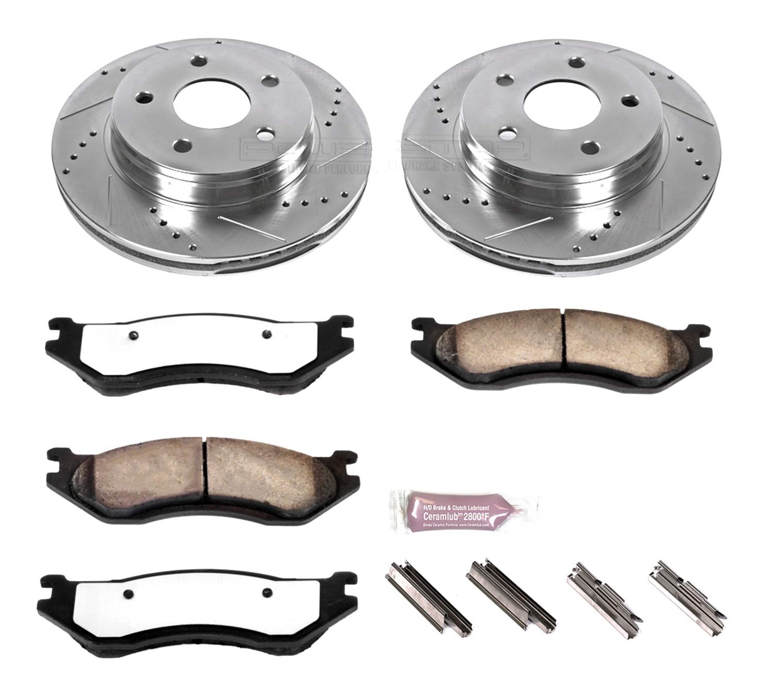 The Power Stop Z36 Truck & Tow Brake Kit provides extreme braking performance, specifically designed for trucks or 4x4s. The Z36 Carbon-Fiber Ceramic formula ensures dust-free braking, while premium stainless steel shims allow superior heat dissipation and virtually noise-free braking. The kit includes drilled and slotted performance rotors for optimal cooling, plated in zinc (excluding hub assemblies) for maximum rust protection. A ceramic brake lubricant and a premium stainless steel hardware kit are also included for your convenience.