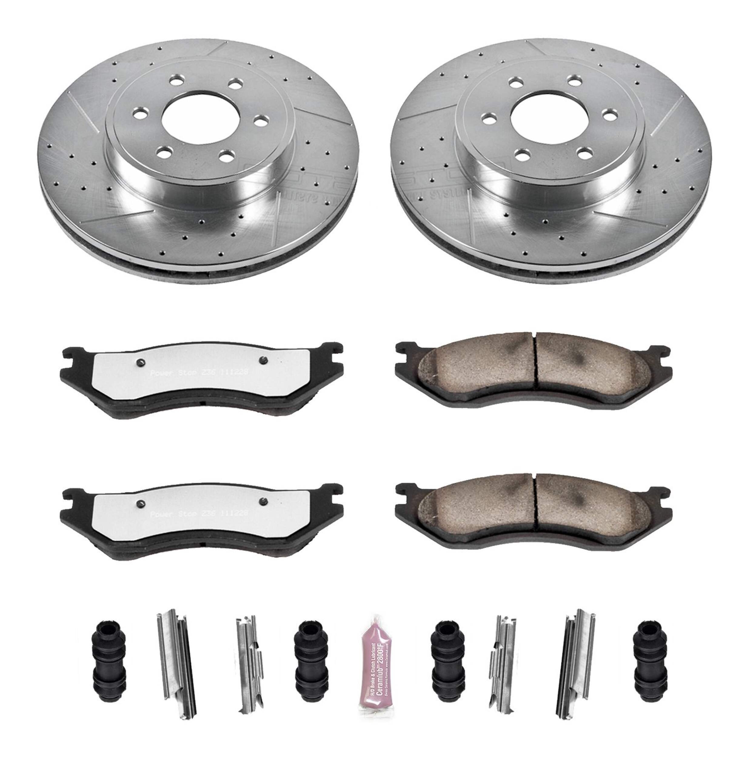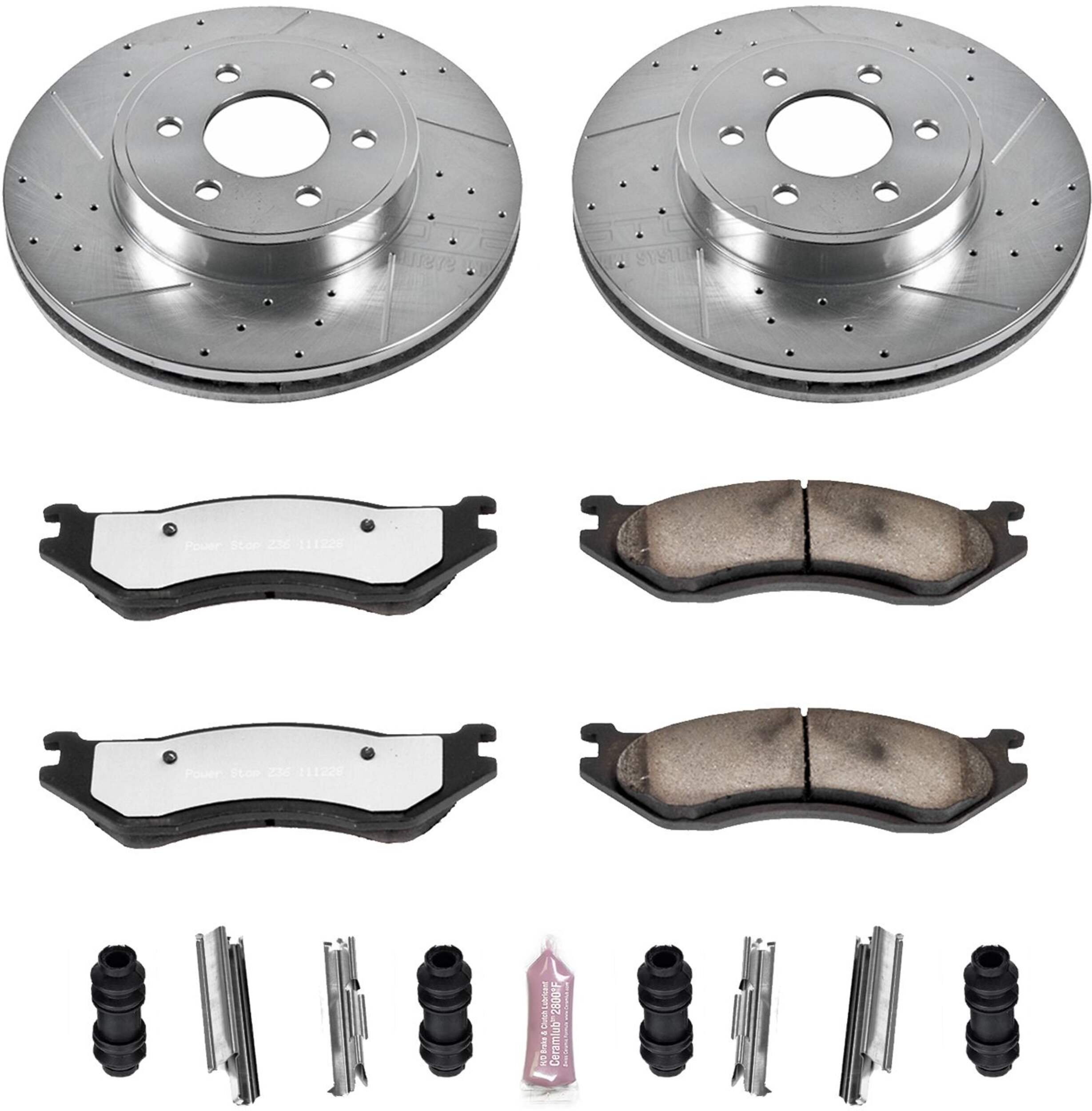 The Power Stop Z36 Truck & Tow Brake Kit provides extreme braking performance, specifically designed for trucks or 4x4s. The Z36 Carbon-Fiber Ceramic formula ensures dust-free braking, while premium stainless steel shims allow superior heat dissipation and virtually noise-free braking. The kit includes drilled and slotted performance rotors for optimal cooling, plated in zinc (excluding hub assemblies) for maximum rust protection. A ceramic brake lubricant and a premium stainless steel hardware kit are also included for your convenience.