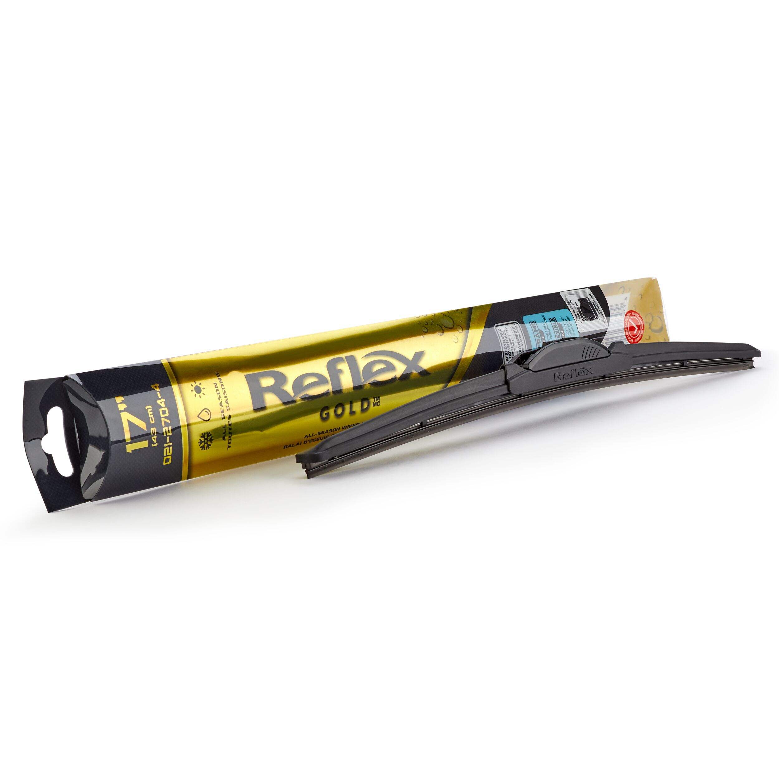 The Reflex Gold Wiper Blade features an aerodynamic, flexible design that effortlessly conforms to windshields while resisting the build-up of ice and snow. A lower wiper height cuts down on annoying noise, while the unique rotational construction of the wiper is designed to move condensation, snow, and rain from the windshield more efficiently. This wiper is also simple to install, with adaptors included.