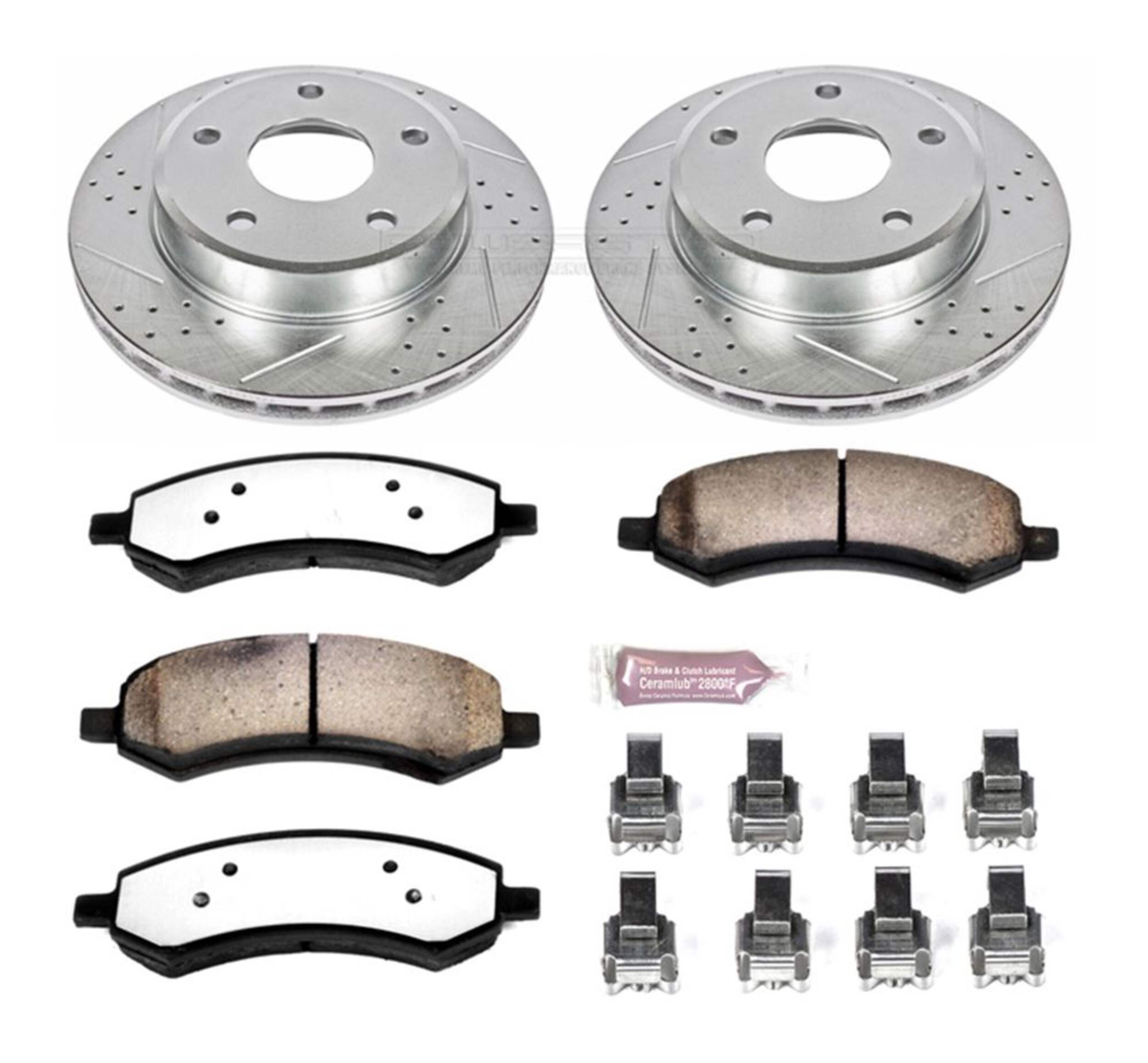 The Power Stop Z36 Truck & Tow Brake Kit provides extreme braking performance, specifically designed for trucks or 4x4s. The Z36 Carbon-Fiber Ceramic formula ensures dust-free braking, while premium stainless steel shims allow superior heat dissipation and virtually noise-free braking. The kit includes drilled and slotted performance rotors for optimal cooling, plated in zinc (excluding hub assemblies) for maximum rust protection. A ceramic brake lubricant and a premium stainless steel hardware kit are also included for your convenience.