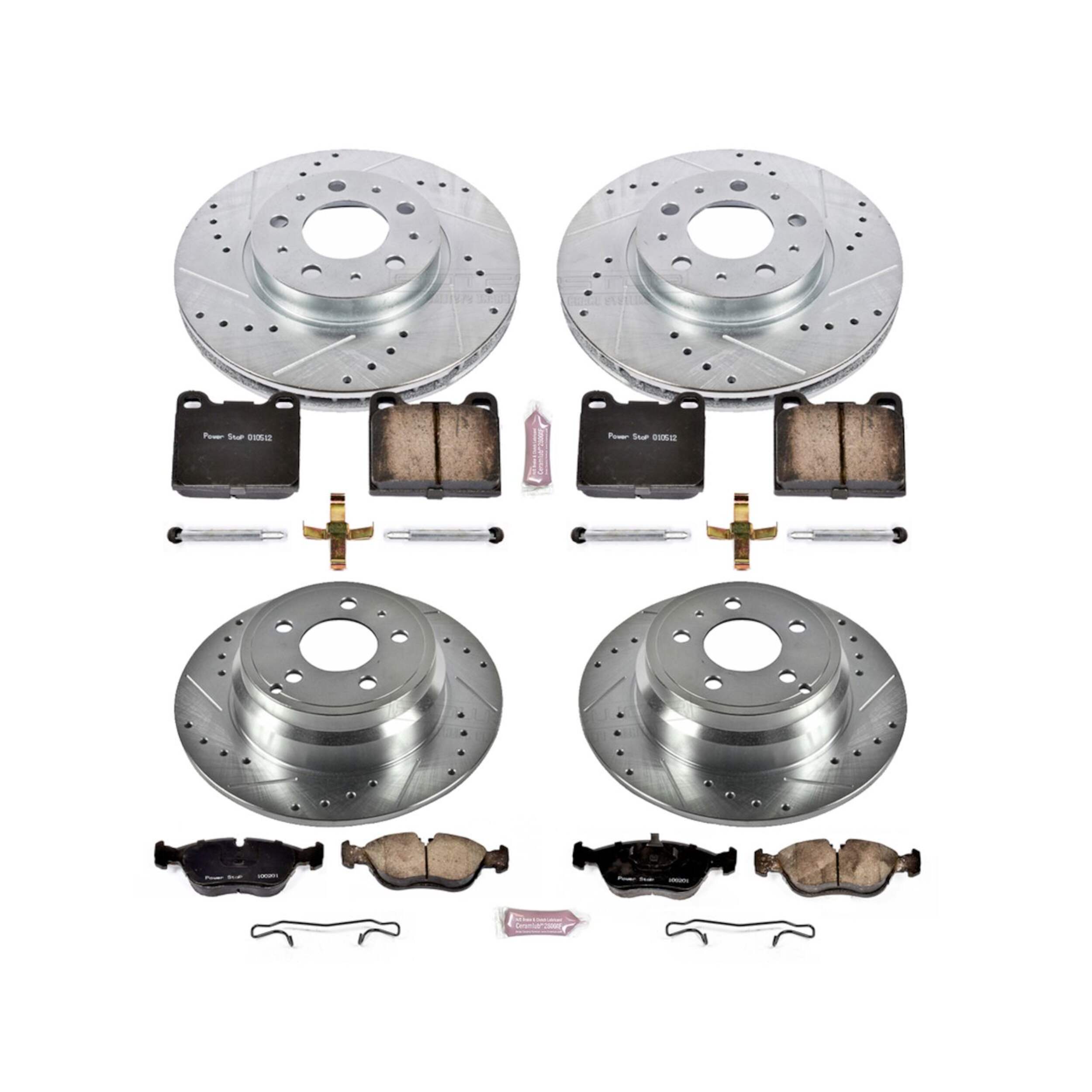 The Power Stop Z23 Evolution Sport Performance Brake Kit - Front & Rear delivers enhanced braking power with its Z23 Carbon-Fiber Ceramic formula. It offers dust-free operation and virtually noise-free braking due to premium rubberized shims. The kit includes drilled and slotted performance rotors for maximum cooling. The rotors, excluding hub assemblies, are zinc-plated to guard against rust. The package also contains ceramic brake lubricant, a premium hardware kit, 2 sets of brake pads, and 4 rotors. Additionally, the installation hardware is also included, making it a comprehensive brake kit for your vehicle.