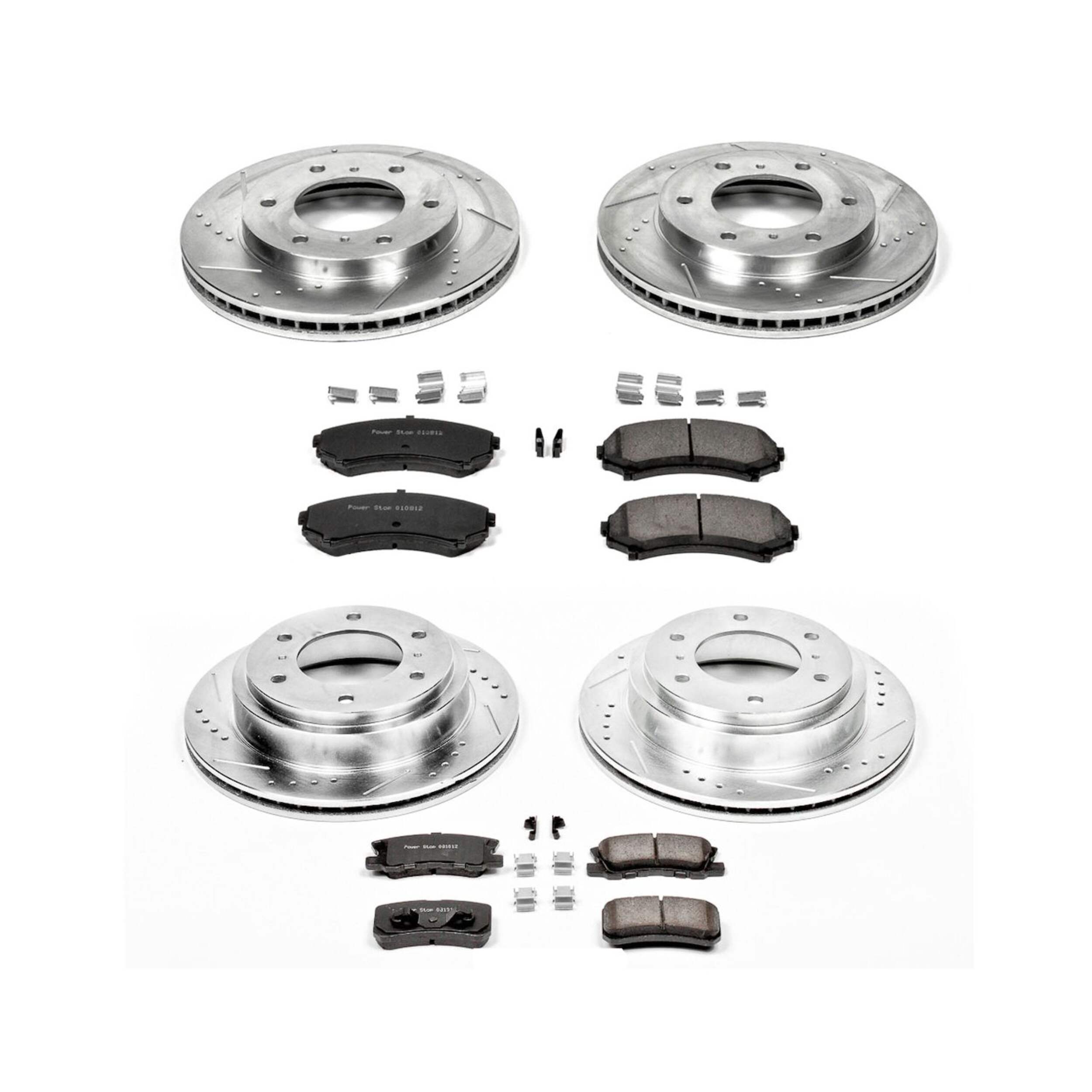 The Power Stop Z23 Evolution Sport Performance Brake Kit - Front & Rear delivers enhanced braking power with its Z23 Carbon-Fiber Ceramic formula. It offers dust-free operation and virtually noise-free braking due to premium rubberized shims. The kit includes drilled and slotted performance rotors for maximum cooling. The rotors, excluding hub assemblies, are zinc-plated to guard against rust. The package also contains ceramic brake lubricant, a premium hardware kit, 2 sets of brake pads, and 4 rotors. Additionally, the installation hardware is also included, making it a comprehensive brake kit for your vehicle.