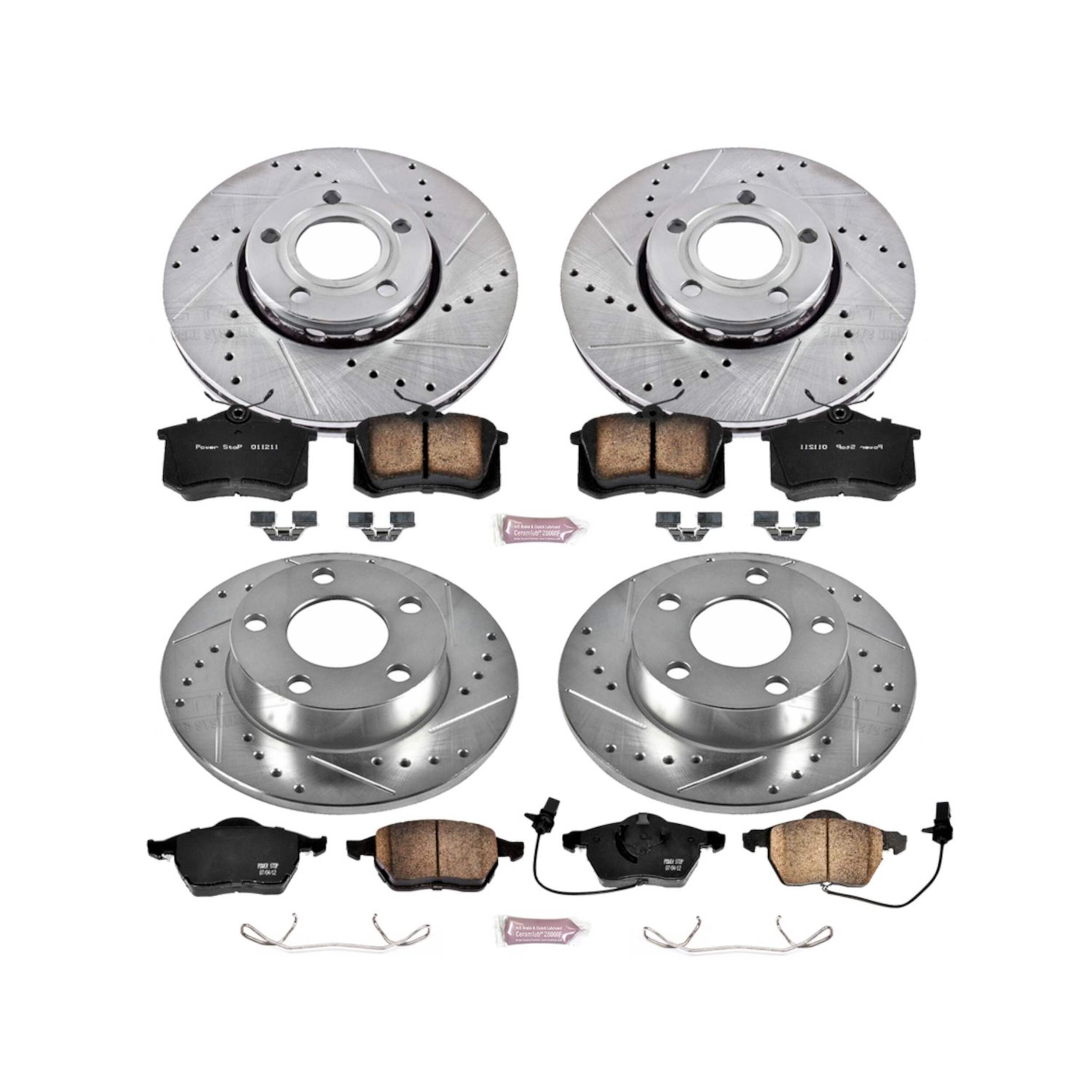 The Power Stop Z23 Evolution Sport Performance Brake Kit - Front & Rear delivers enhanced braking power with its Z23 Carbon-Fiber Ceramic formula. It offers dust-free operation and virtually noise-free braking due to premium rubberized shims. The kit includes drilled and slotted performance rotors for maximum cooling. The rotors, excluding hub assemblies, are zinc-plated to guard against rust. The package also contains ceramic brake lubricant, a premium hardware kit, 2 sets of brake pads, and 4 rotors. Additionally, the installation hardware is also included, making it a comprehensive brake kit for your vehicle.