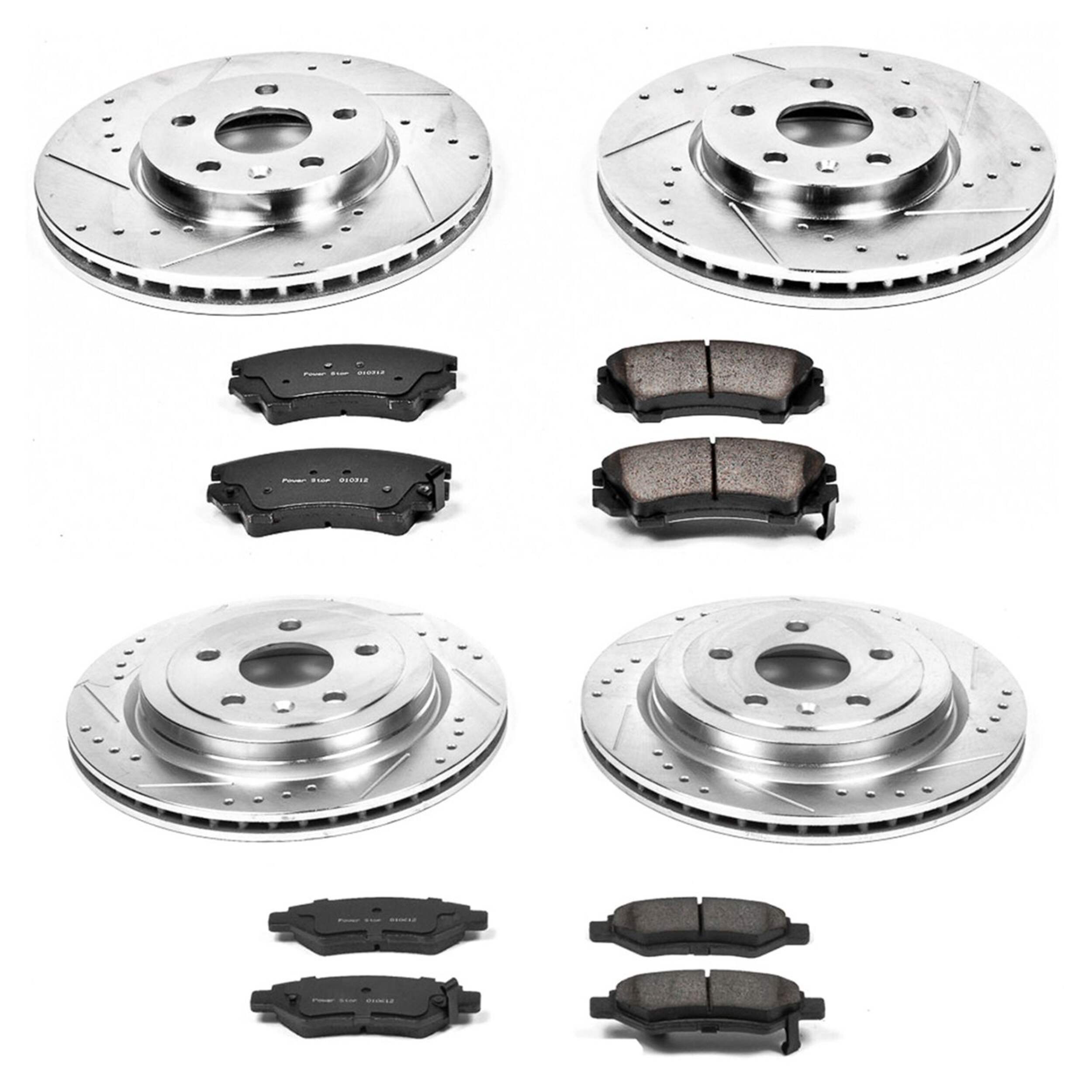 The Power Stop Z23 Evolution Sport Performance Brake Kit - Front & Rear delivers enhanced braking power with its Z23 Carbon-Fiber Ceramic formula. It offers dust-free operation and virtually noise-free braking due to premium rubberized shims. The kit includes drilled and slotted performance rotors for maximum cooling. The rotors, excluding hub assemblies, are zinc-plated to guard against rust. The package also contains ceramic brake lubricant, a premium hardware kit, 2 sets of brake pads, and 4 rotors. Additionally, the installation hardware is also included, making it a comprehensive brake kit for your vehicle.