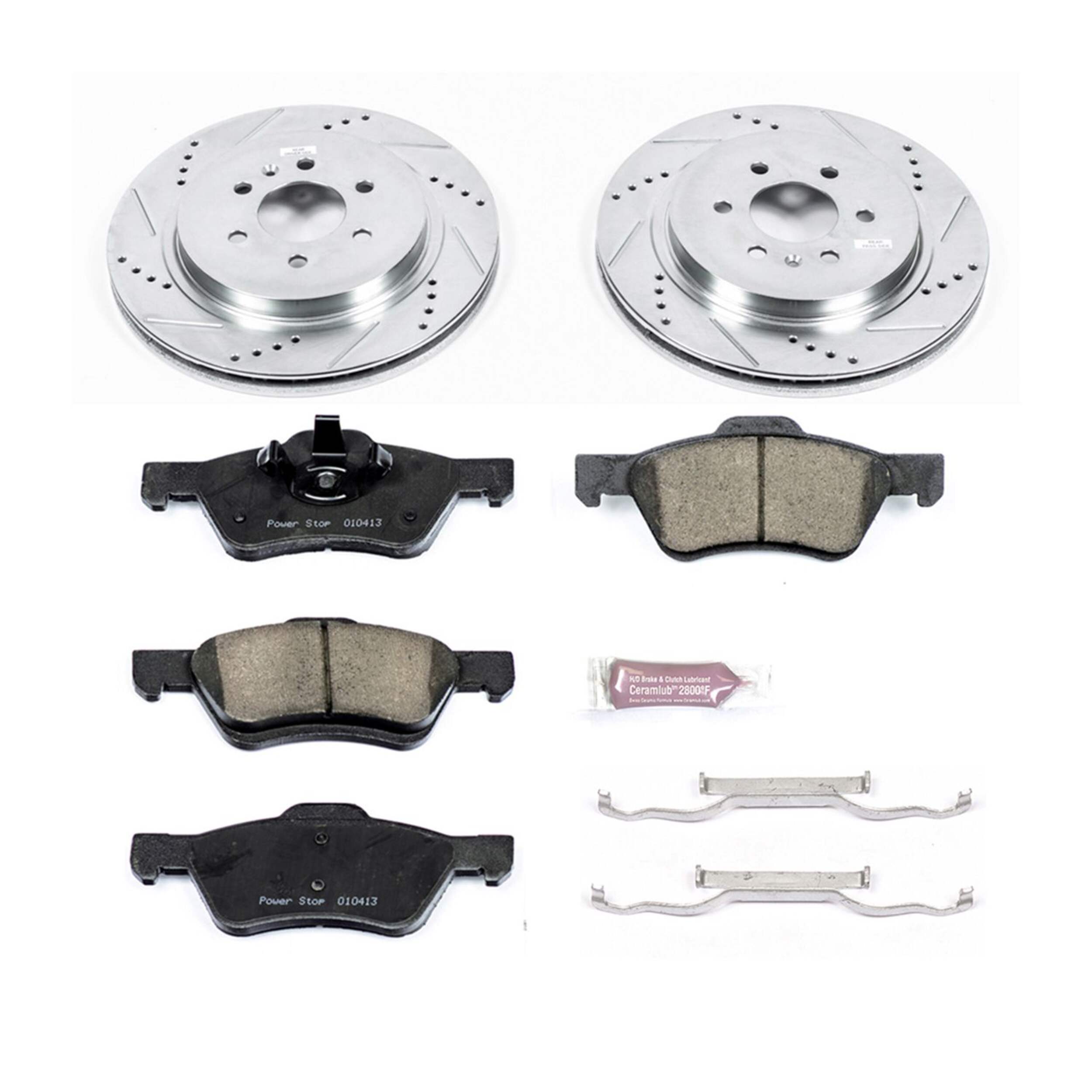 The Power Stop Z23 Evolution Sport Performance Front Brake Kit delivers superior stopping power for the front brakes of your vehicle. This complete kit includes drilled and slotted rotors that provide maximum cooling along with premium brake pads for dust-free, quiet braking. Rubberized shims ensure virtually noise-free operation while zinc-plated rotors prevent rust. Everything needed for a high-performance front brake upgrade is included: pads, rotors, shims, lubricant, and premium hardware. All in all, the Power Stop Z23 kit can offer an ideal way to boost your vehicle’s braking performance.