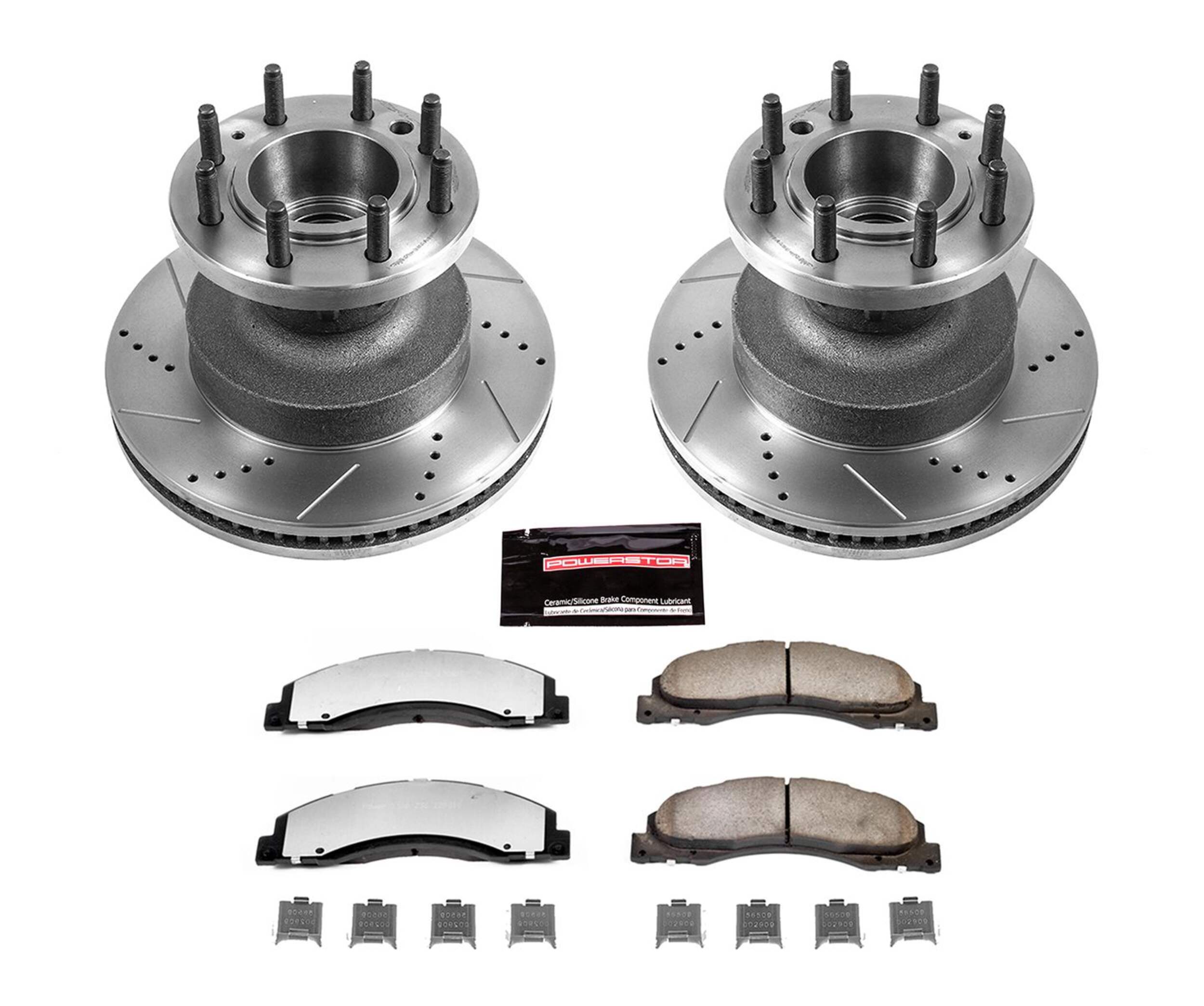 The Power Stop Z36 Truck & Tow Brake Kit provides extreme braking performance, specifically designed for trucks or 4x4s. The Z36 Carbon-Fiber Ceramic formula ensures dust-free braking, while premium stainless steel shims allow superior heat dissipation and virtually noise-free braking. The kit includes drilled and slotted performance rotors for optimal cooling, plated in zinc (excluding hub assemblies) for maximum rust protection. A ceramic brake lubricant and a premium stainless steel hardware kit are also included for your convenience.