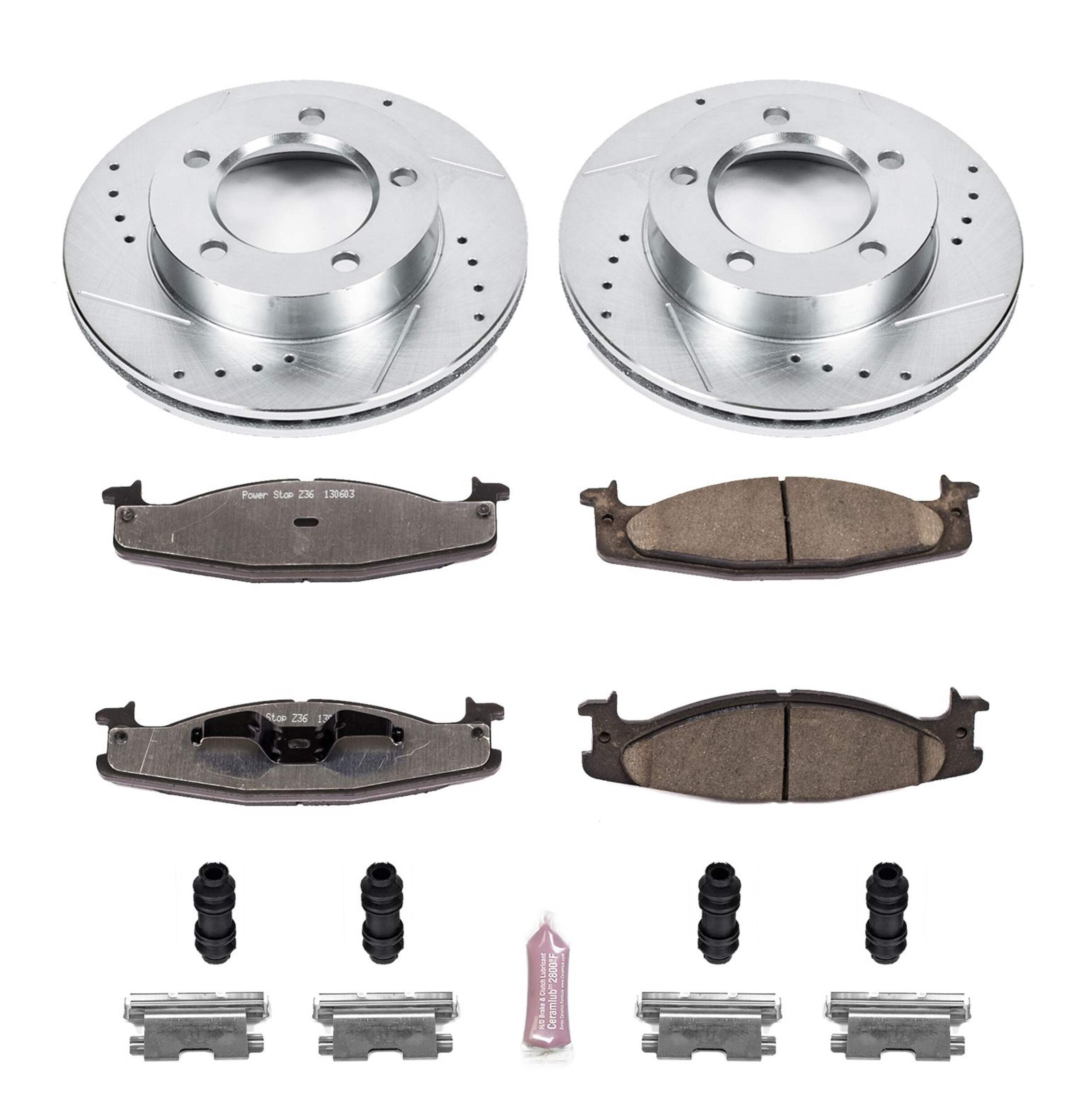 The Power Stop Z36 Truck & Tow Brake Kit provides extreme braking performance, specifically designed for trucks or 4x4s. The Z36 Carbon-Fiber Ceramic formula ensures dust-free braking, while premium stainless steel shims allow superior heat dissipation and virtually noise-free braking. The kit includes drilled and slotted performance rotors for optimal cooling, plated in zinc (excluding hub assemblies) for maximum rust protection. A ceramic brake lubricant and a premium stainless steel hardware kit are also included for your convenience.