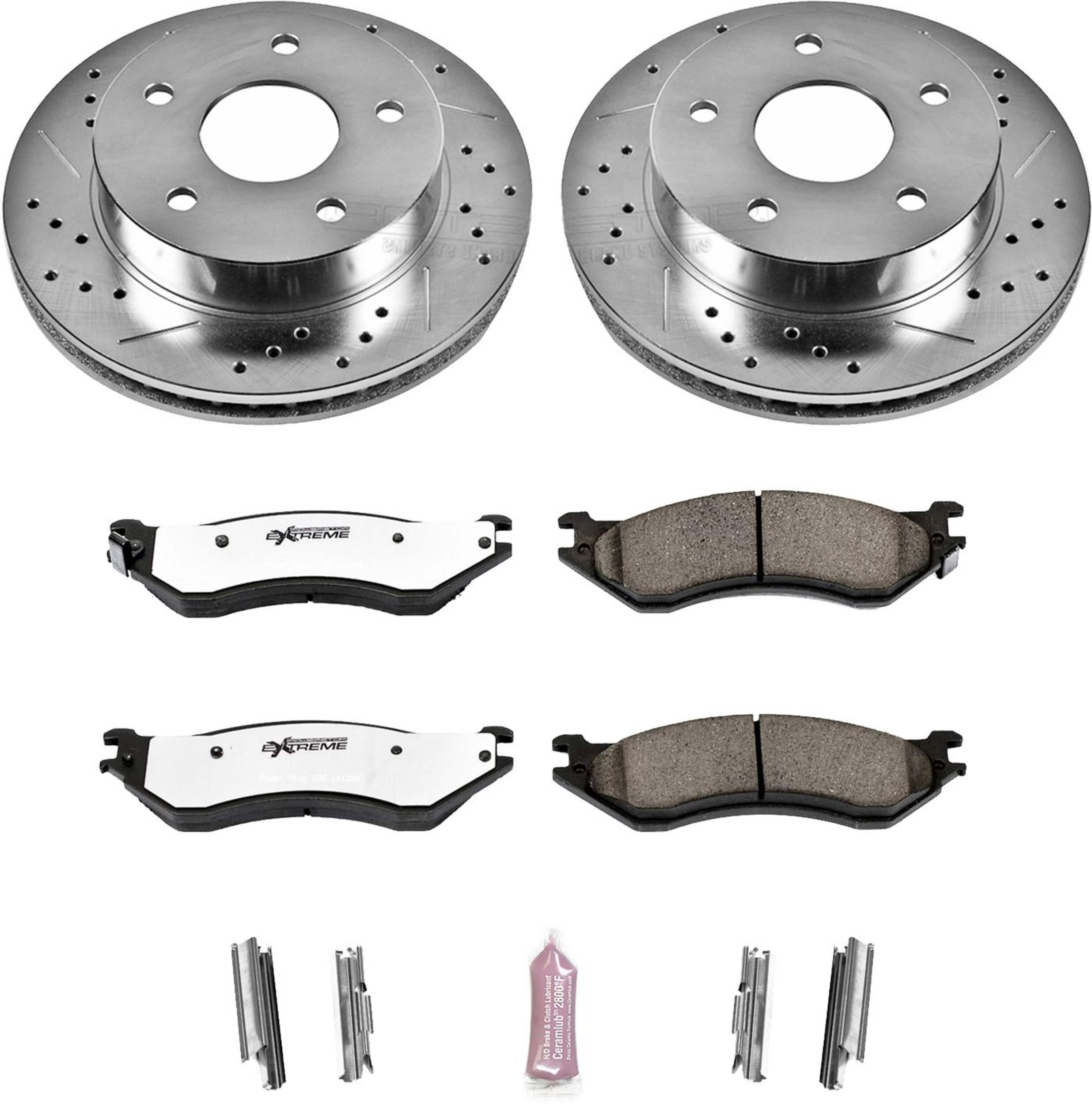 The Power Stop Z36 Truck & Tow Brake Kit provides extreme braking performance, specifically designed for trucks or 4x4s. The Z36 Carbon-Fiber Ceramic formula ensures dust-free braking, while premium stainless steel shims allow superior heat dissipation and virtually noise-free braking. The kit includes drilled and slotted performance rotors for optimal cooling, plated in zinc (excluding hub assemblies) for maximum rust protection. A ceramic brake lubricant and a premium stainless steel hardware kit are also included for your convenience.