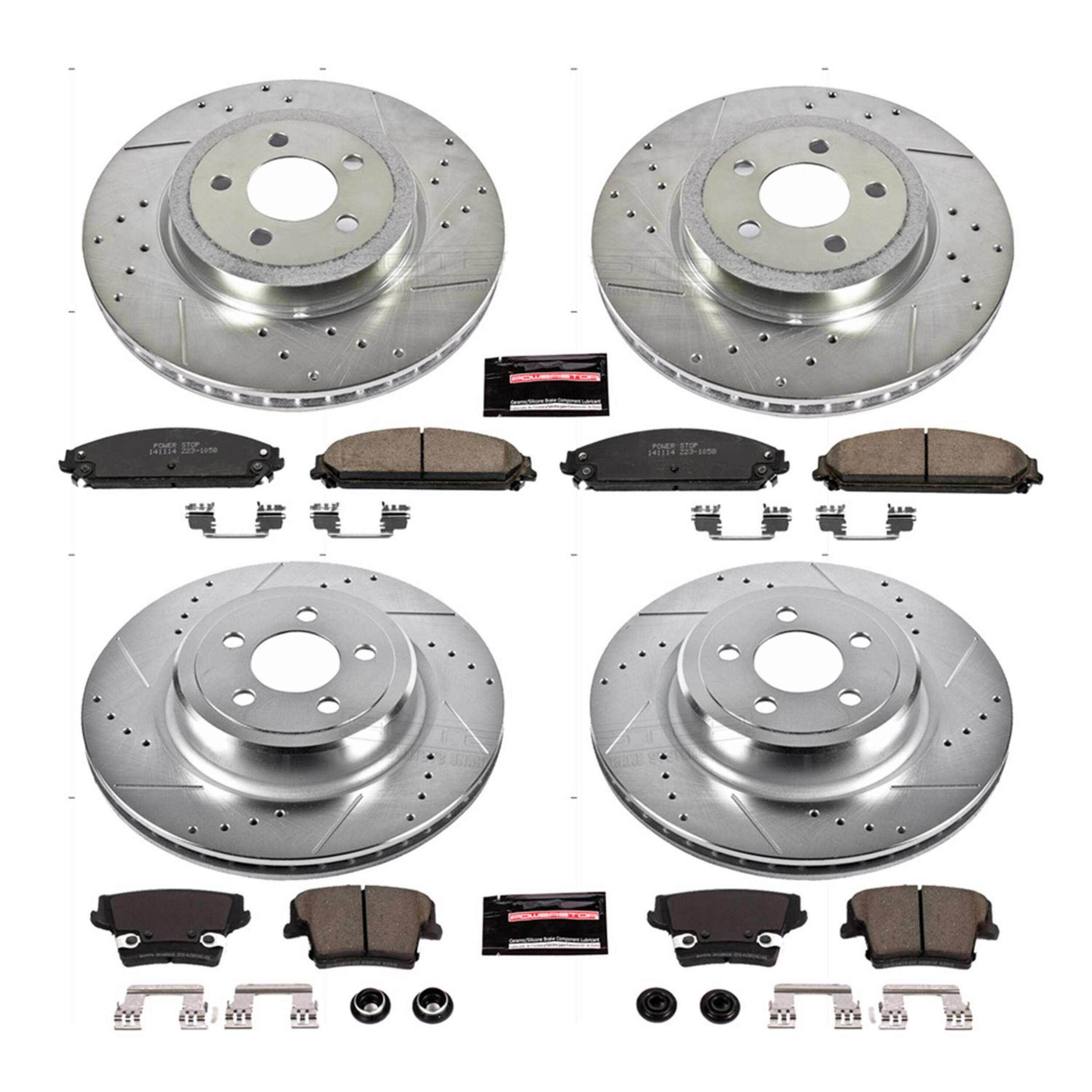 The Power Stop Z23 Evolution Sport Performance Brake Kit - Front & Rear delivers enhanced braking power with its Z23 Carbon-Fiber Ceramic formula. It offers dust-free operation and virtually noise-free braking due to premium rubberized shims. The kit includes drilled and slotted performance rotors for maximum cooling. The rotors, excluding hub assemblies, are zinc-plated to guard against rust. The package also contains ceramic brake lubricant, a premium hardware kit, 2 sets of brake pads, and 4 rotors. Additionally, the installation hardware is also included, making it a comprehensive brake kit for your vehicle.