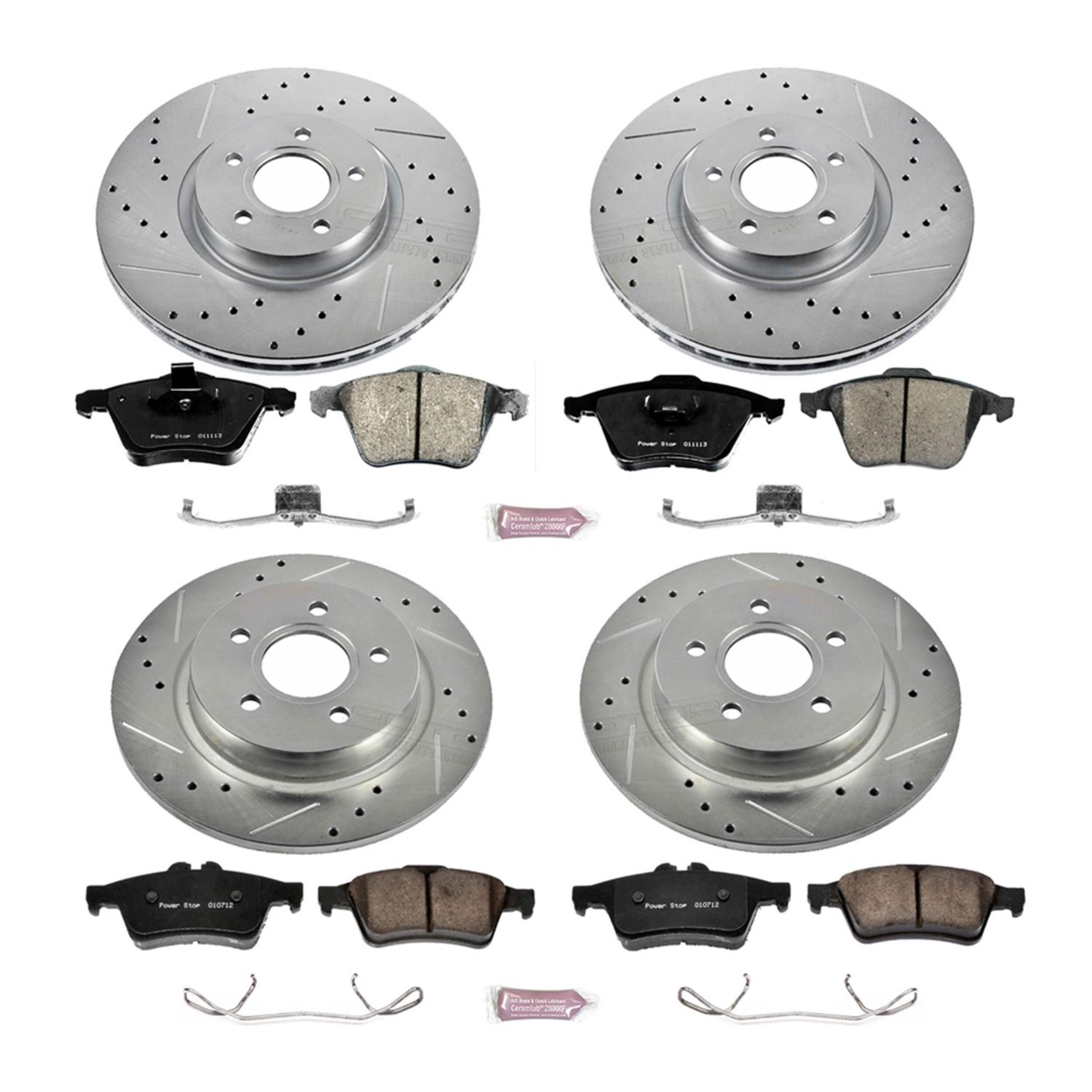 The Power Stop Z23 Evolution Sport Performance Brake Kit - Front & Rear delivers enhanced braking power with its Z23 Carbon-Fiber Ceramic formula. It offers dust-free operation and virtually noise-free braking due to premium rubberized shims. The kit includes drilled and slotted performance rotors for maximum cooling. The rotors, excluding hub assemblies, are zinc-plated to guard against rust. The package also contains ceramic brake lubricant, a premium hardware kit, 2 sets of brake pads, and 4 rotors. Additionally, the installation hardware is also included, making it a comprehensive brake kit for your vehicle.
