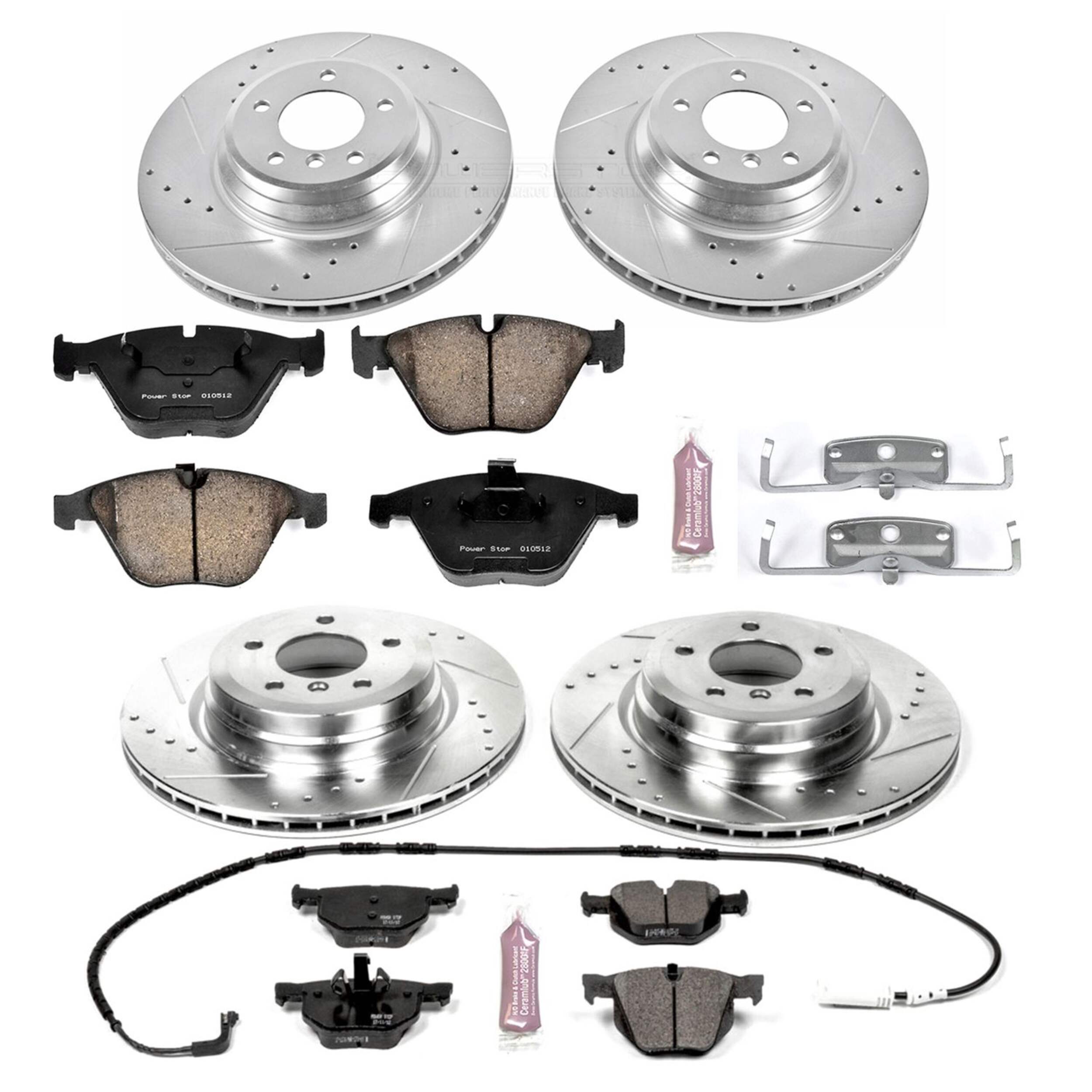 The Power Stop Z23 Evolution Sport Performance Brake Kit - Front & Rear delivers enhanced braking power with its Z23 Carbon-Fiber Ceramic formula. It offers dust-free operation and virtually noise-free braking due to premium rubberized shims. The kit includes drilled and slotted performance rotors for maximum cooling. The rotors, excluding hub assemblies, are zinc-plated to guard against rust. The package also contains ceramic brake lubricant, a premium hardware kit, 2 sets of brake pads, and 4 rotors. Additionally, the installation hardware is also included, making it a comprehensive brake kit for your vehicle.