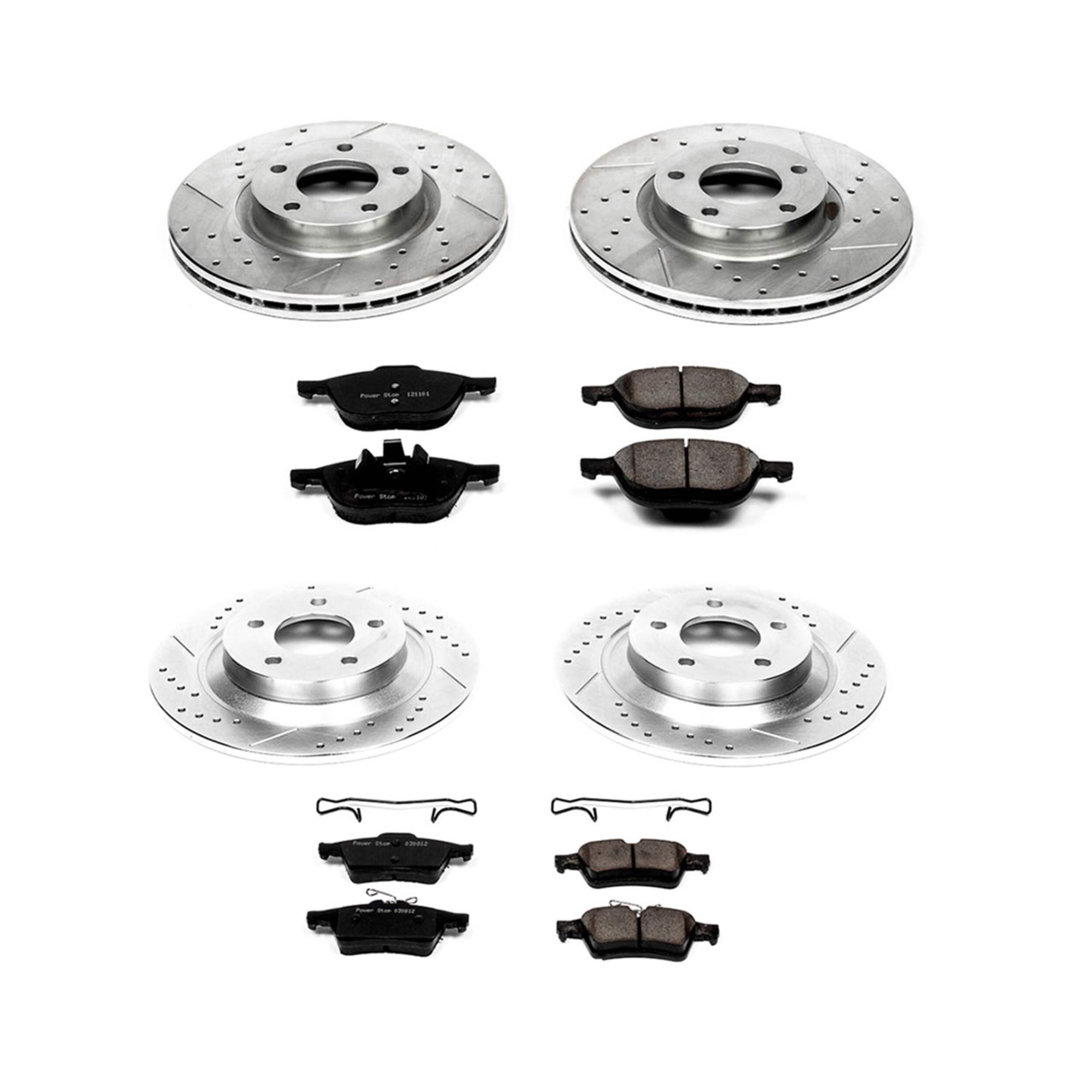 The Power Stop Z23 Evolution Sport Performance Brake Kit - Front & Rear delivers enhanced braking power with its Z23 Carbon-Fiber Ceramic formula. It offers dust-free operation and virtually noise-free braking due to premium rubberized shims. The kit includes drilled and slotted performance rotors for maximum cooling. The rotors, excluding hub assemblies, are zinc-plated to guard against rust. The package also contains ceramic brake lubricant, a premium hardware kit, 2 sets of brake pads, and 4 rotors. Additionally, the installation hardware is also included, making it a comprehensive brake kit for your vehicle.