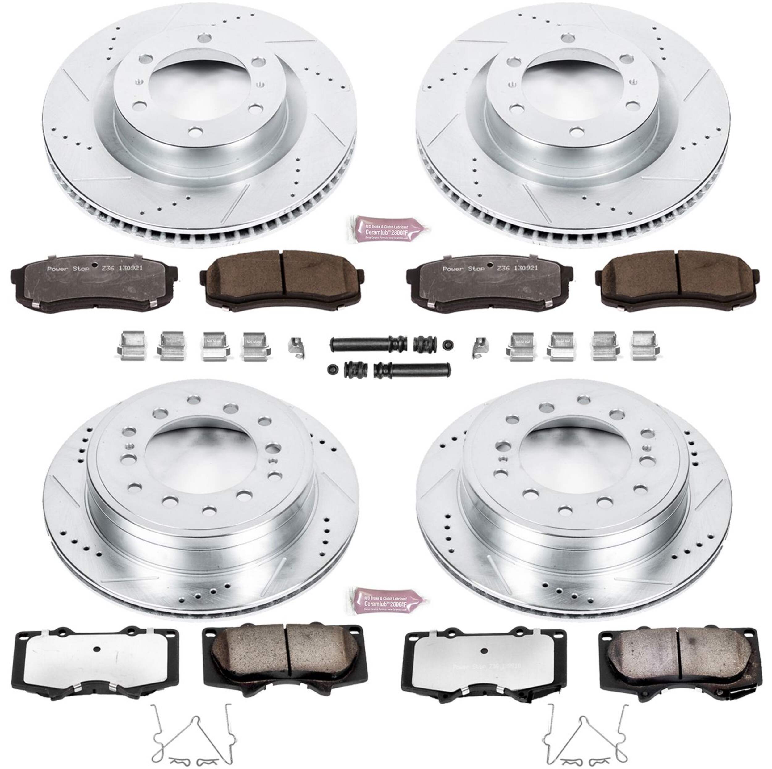 The Power Stop Z36 Truck & Tow Brake Kit provides extreme braking performance, specifically designed for trucks or 4x4s. The Z36 Carbon-Fiber Ceramic formula ensures dust-free braking, while premium stainless steel shims allow superior heat dissipation and virtually noise-free braking. The kit includes drilled and slotted performance rotors for optimal cooling, plated in zinc (excluding hub assemblies) for maximum rust protection. A ceramic brake lubricant and a premium stainless steel hardware kit are also included for your convenience.