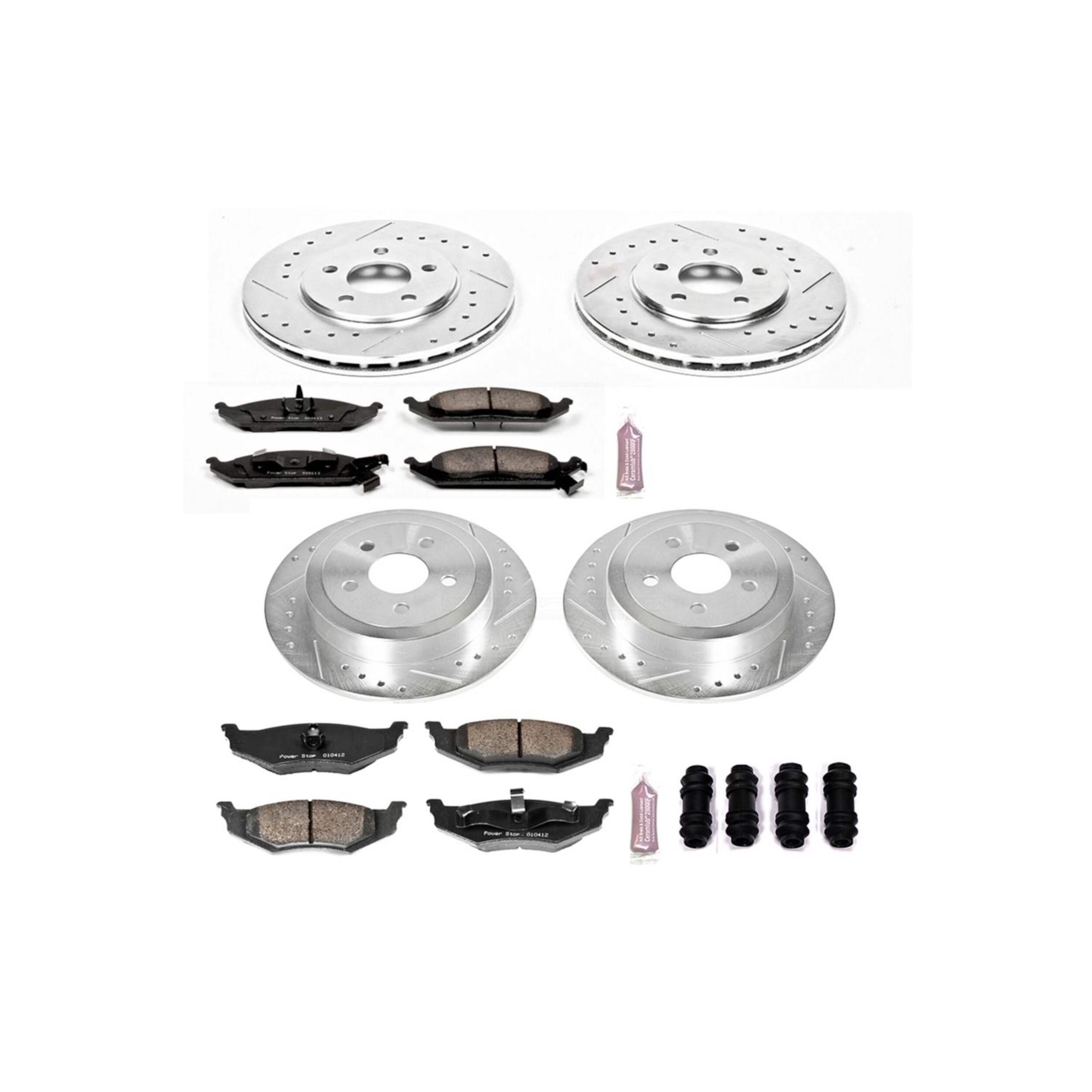 The Power Stop Z23 Evolution Sport Performance Brake Kit delivers exceptional braking power with its Z23 Carbon-Fiber Ceramic formula. With dust-free performance and premium rubberized shims, enjoy virtually noise-free braking. The kit features drilled and slotted performance rotors for optimal cooling and rotors plated with zinc for rust protection (excluding hub assemblies). Including a ceramic brake lubricant and a premium hardware kit, it comes with two sets of brake pads, four rotors, and all necessary installation hardware. With the Power Stop Z23, experience enhanced braking in a comprehensive, easy-to-install package.