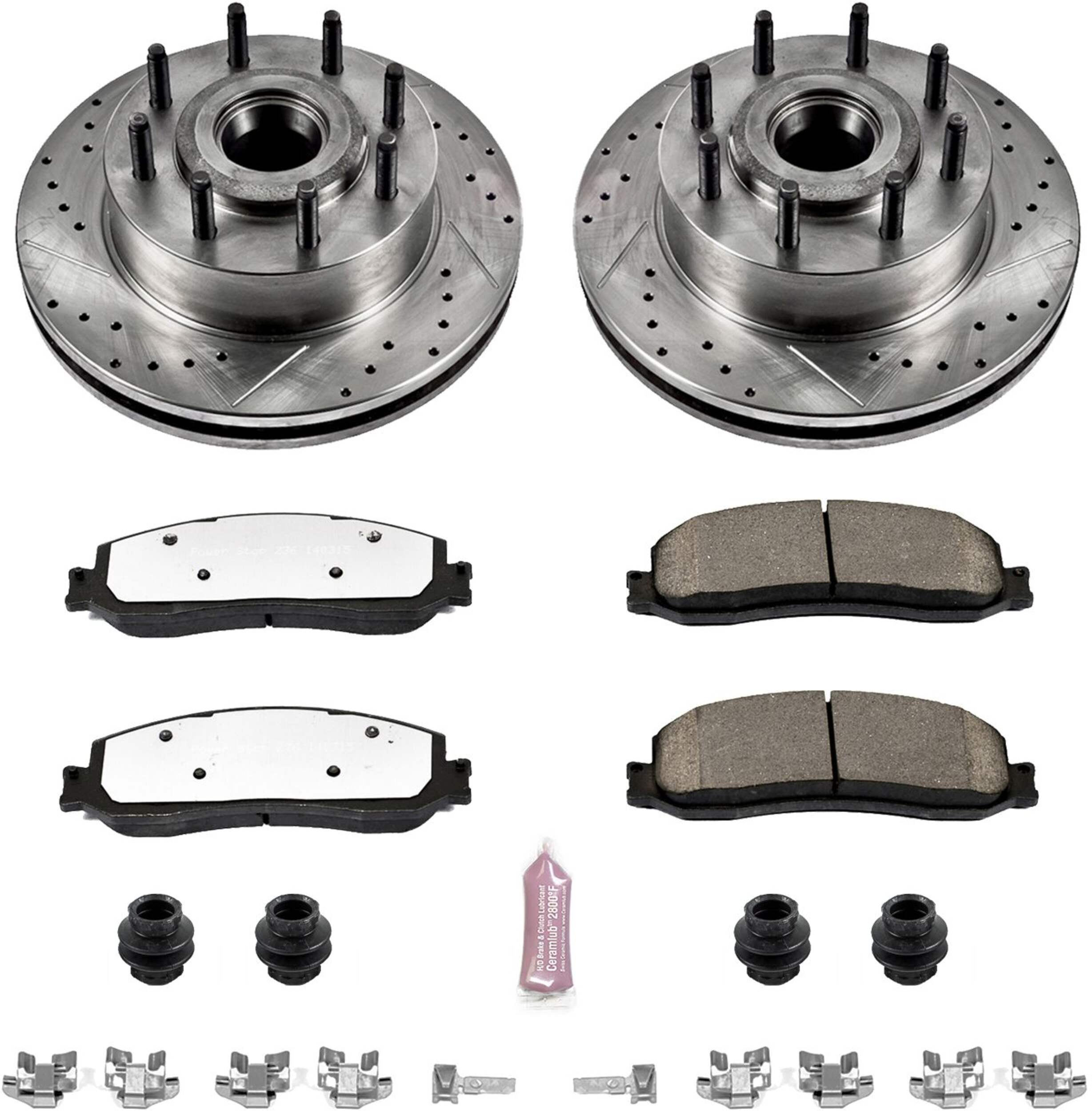 The Power Stop Z36 Truck & Tow Brake Kit provides extreme braking performance, specifically designed for trucks or 4x4s. The Z36 Carbon-Fiber Ceramic formula ensures dust-free braking, while premium stainless steel shims allow superior heat dissipation and virtually noise-free braking. The kit includes drilled and slotted performance rotors for optimal cooling, plated in zinc (excluding hub assemblies) for maximum rust protection. A ceramic brake lubricant and a premium stainless steel hardware kit are also included for your convenience.