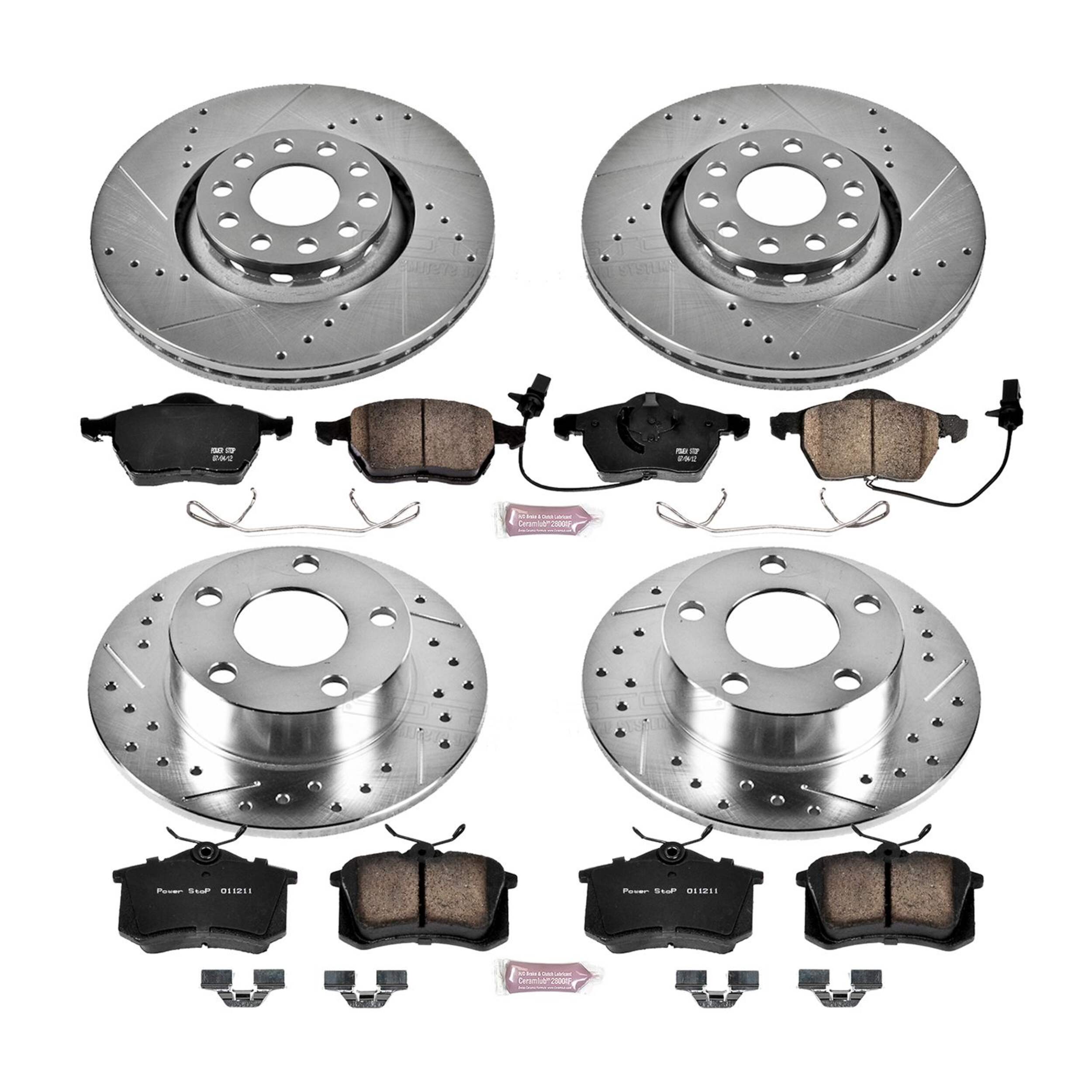 The Power Stop Z23 Evolution Sport Performance Brake Kit delivers exceptional braking power with its Z23 Carbon-Fiber Ceramic formula. With dust-free performance and premium rubberized shims, enjoy virtually noise-free braking. The kit features drilled and slotted performance rotors for optimal cooling and rotors plated with zinc for rust protection (excluding hub assemblies). Including a ceramic brake lubricant and a premium hardware kit, it comes with two sets of brake pads, four rotors, and all necessary installation hardware. With the Power Stop Z23, experience enhanced braking in a comprehensive, easy-to-install package.