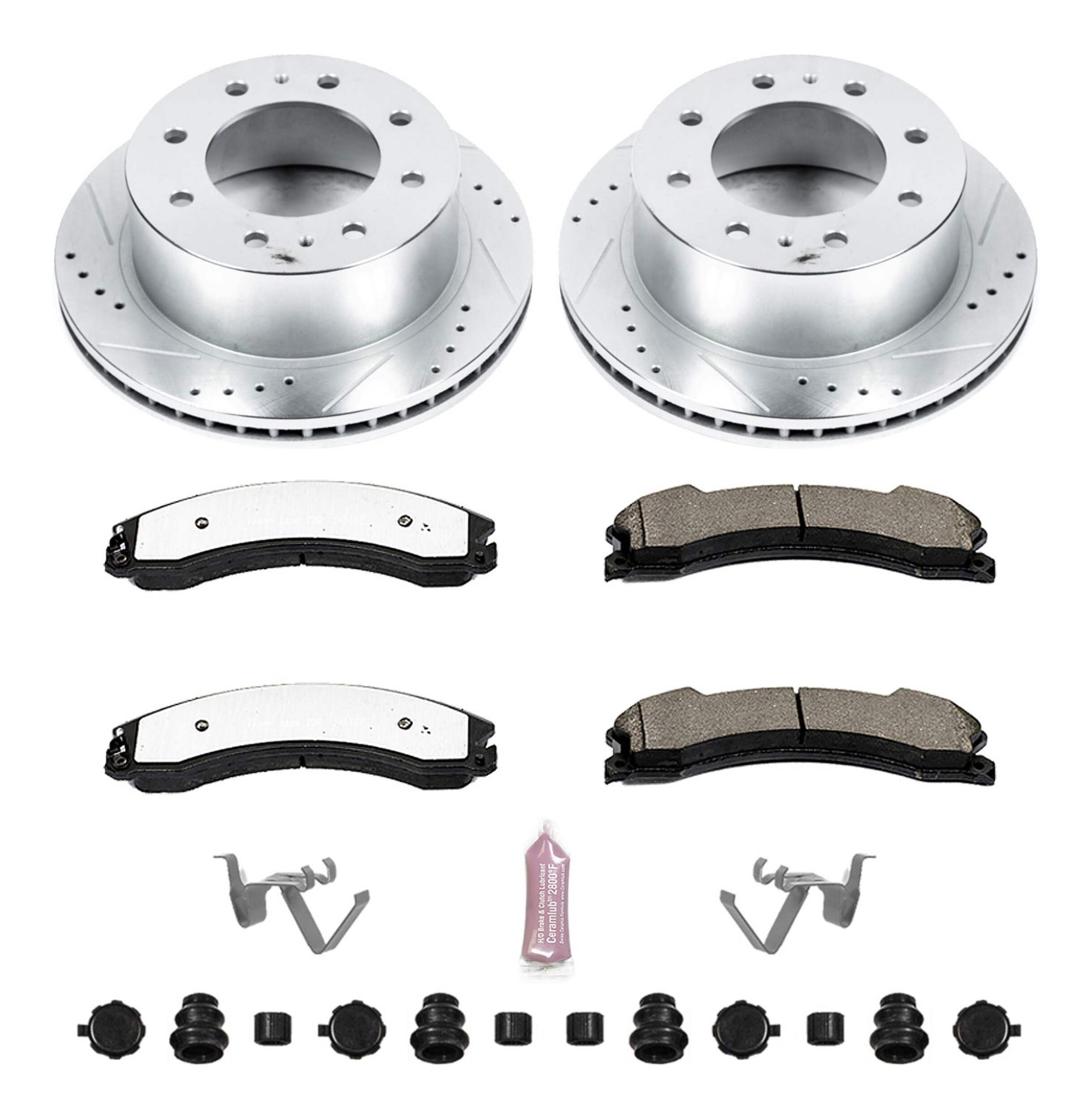 The Power Stop Z36 Truck & Tow Brake Kit provides extreme braking performance, specifically designed for trucks or 4x4s. The Z36 Carbon-Fiber Ceramic formula ensures dust-free braking, while premium stainless steel shims allow superior heat dissipation and virtually noise-free braking. The kit includes drilled and slotted performance rotors for optimal cooling, plated in zinc (excluding hub assemblies) for maximum rust protection. A ceramic brake lubricant and a premium stainless steel hardware kit are also included for your convenience.