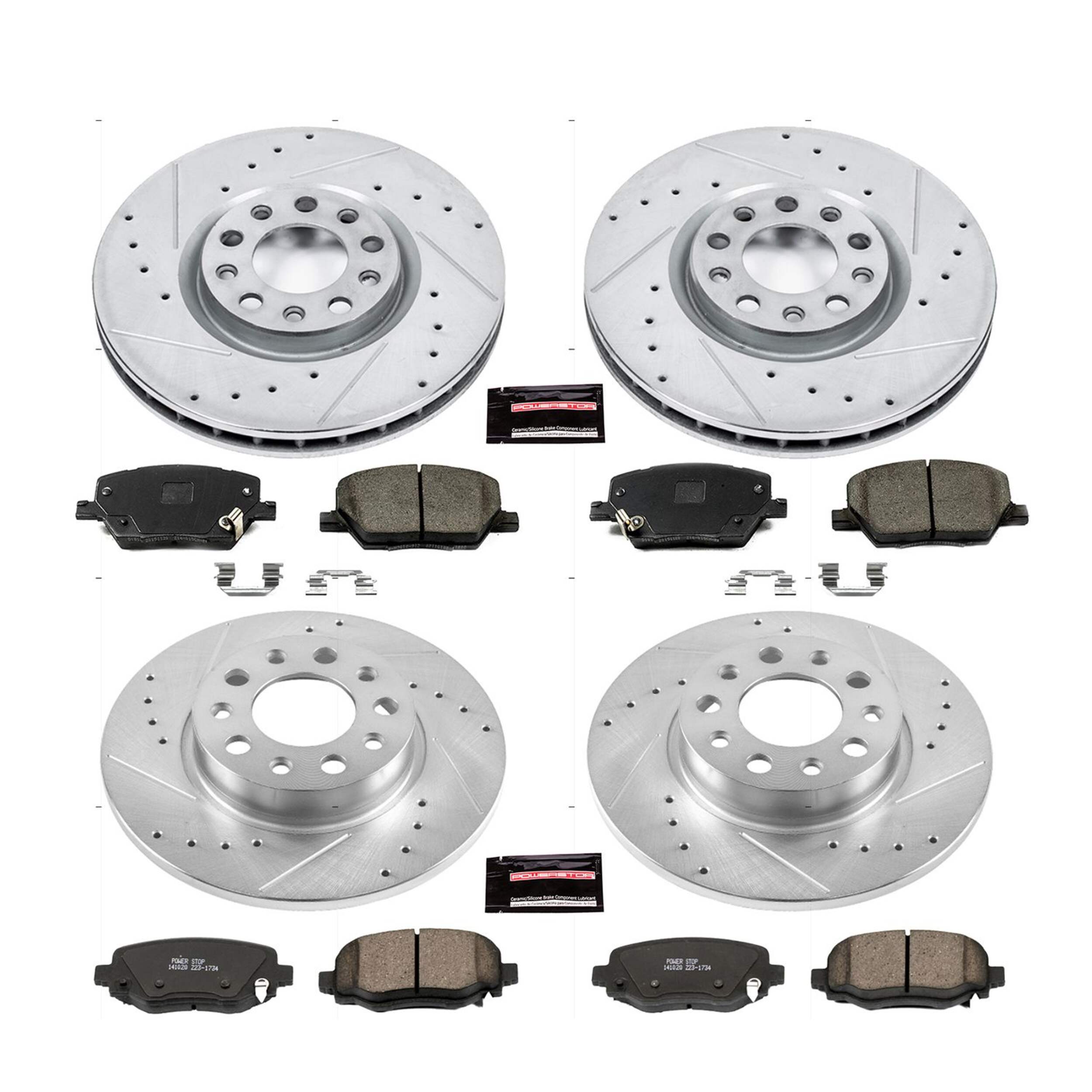 The Power Stop Z23 Evolution Sport Performance Brake Kit delivers exceptional braking power with its Z23 Carbon-Fiber Ceramic formula. With dust-free performance and premium rubberized shims, enjoy virtually noise-free braking. The kit features drilled and slotted performance rotors for optimal cooling and rotors plated with zinc for rust protection (excluding hub assemblies). Including a ceramic brake lubricant and a premium hardware kit, it comes with two sets of brake pads, four rotors, and all necessary installation hardware. With the Power Stop Z23, experience enhanced braking in a comprehensive, easy-to-install package.