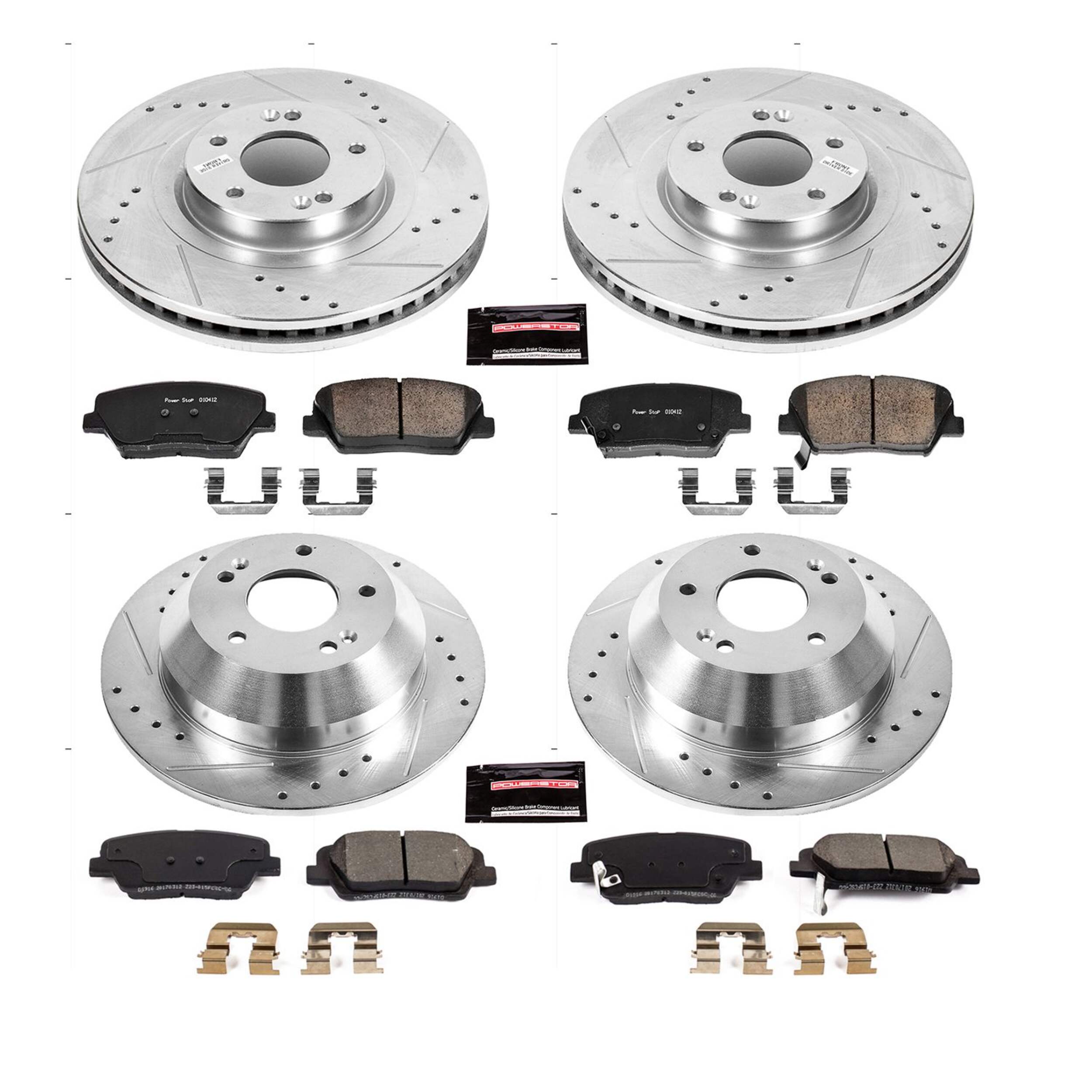 The Power Stop Z23 Evolution Sport Performance Brake Kit delivers exceptional braking power with its Z23 Carbon-Fiber Ceramic formula. With dust-free performance and premium rubberized shims, enjoy virtually noise-free braking. The kit features drilled and slotted performance rotors for optimal cooling and rotors plated with zinc for rust protection (excluding hub assemblies). Including a ceramic brake lubricant and a premium hardware kit, it comes with two sets of brake pads, four rotors, and all necessary installation hardware. With the Power Stop Z23, experience enhanced braking in a comprehensive, easy-to-install package.