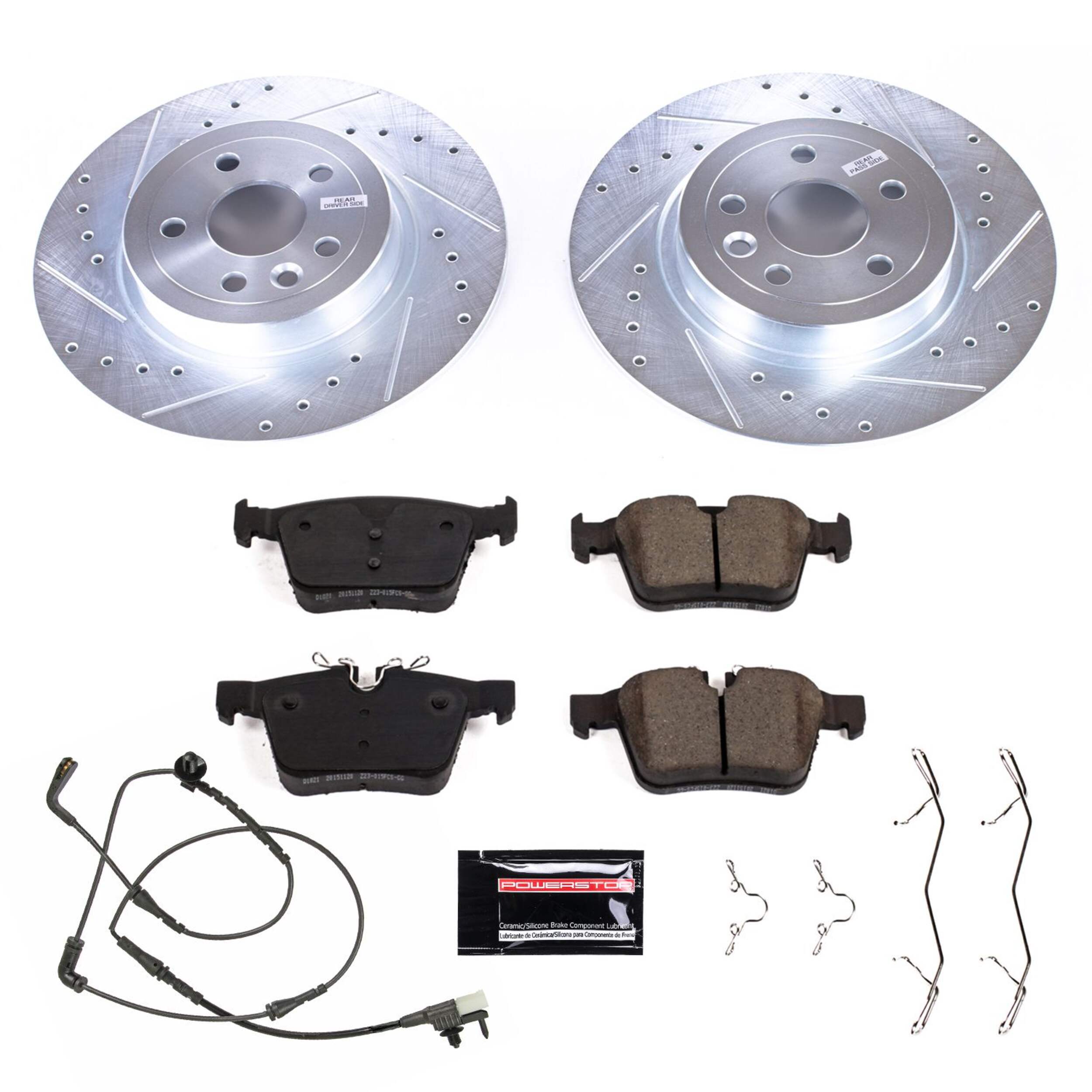 The Power Stop Z23 Evolution Sport Performance Brake Kit - Rear is designed to offer superior braking power, owing to its Z23 Carbon-Fiber Ceramic formula. It assures a dust-free braking performance and virtually noise-free braking with its premium rubberized shims. The kit includes drilled and slotted performance rotors for optimal cooling, enhanced by zinc-plated rotors for maximum rust protection. The package is complete with a ceramic brake lubricant, a premium hardware kit, one set of brake pads and two rotors.