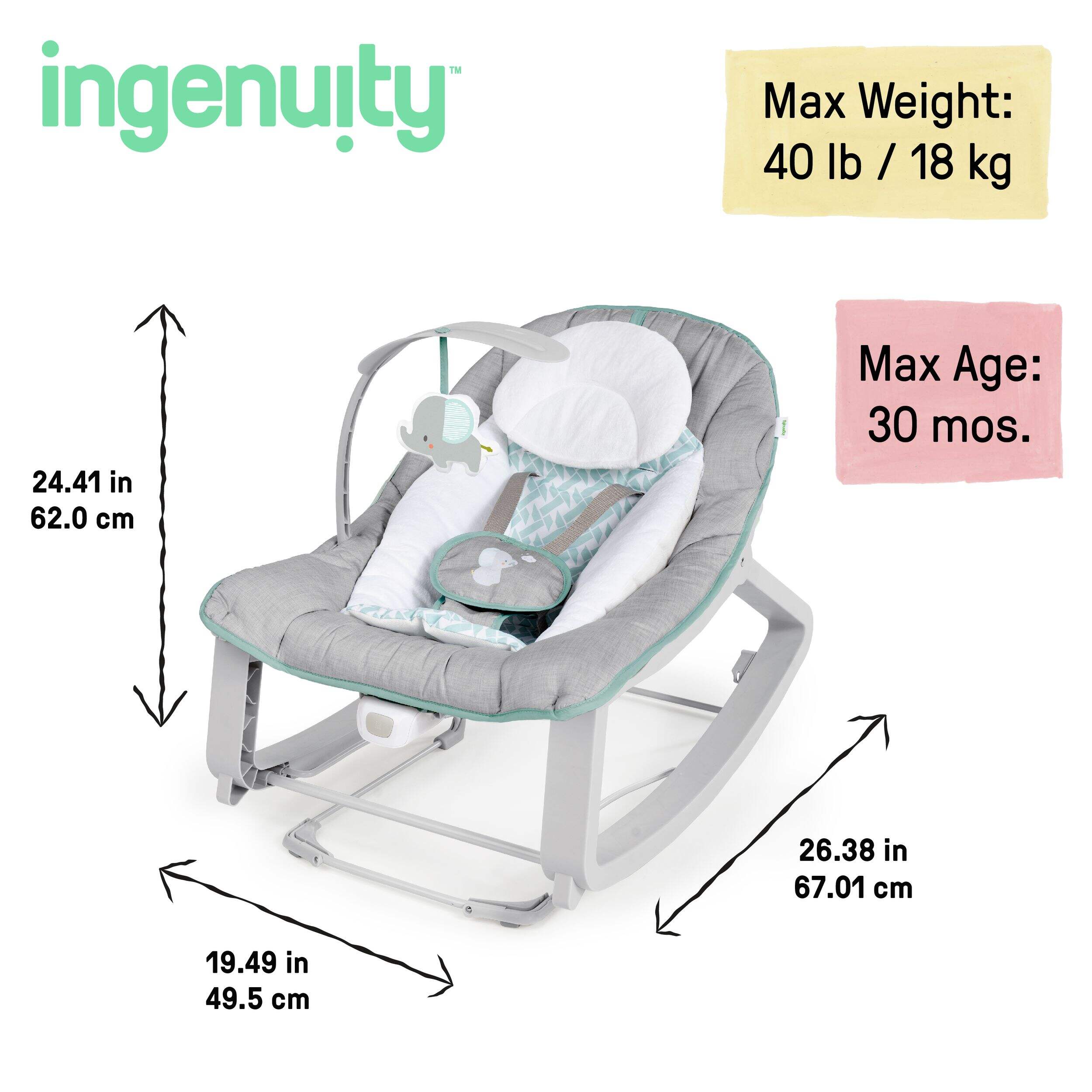 The Ingenuity Keep Cozy™ 3-in-1 Grow with Me™ Bounce & Rock Seat is an adaptable piece designed to support your child from infancy through toddlerhood. This multifunctional seat transitions seamlessly from a baby bouncer to a rocker, and finally to a stationary toddler seat with a supportive kickstand. With a neutral design, the baby seat is a practical addition to your home, giving you a second set of hands while baby sits comfortably in your sight.