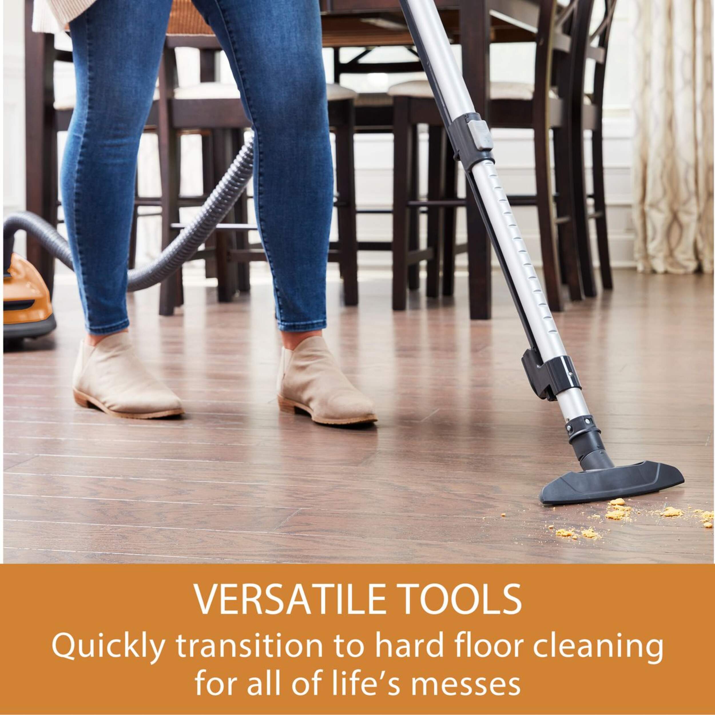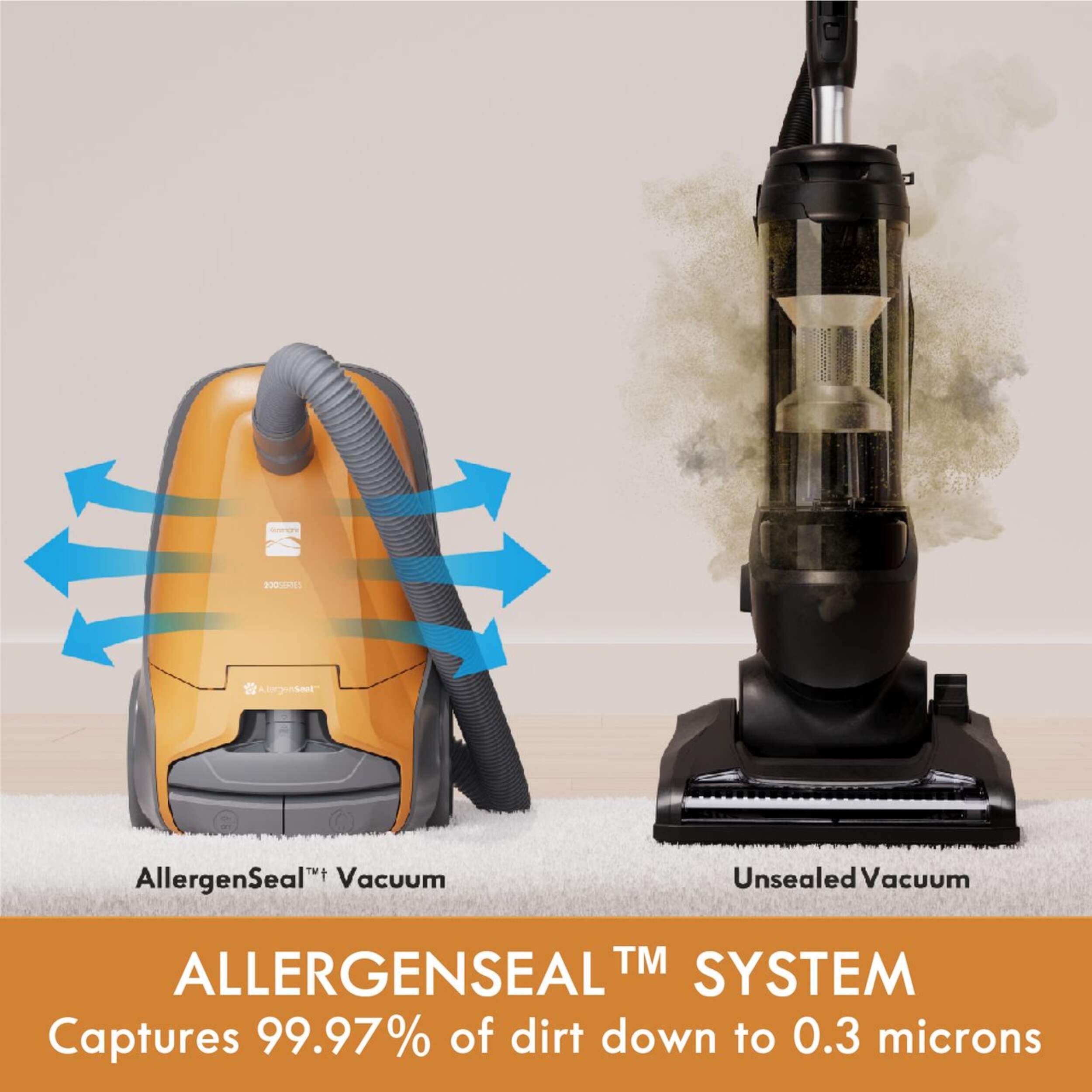 This Kenmore 14A 400 Series HEPA Bagged Canister Vacuum delivers pro-grade power in a compact, maneuverable package. The robust motor on this corded vacuum provides relentless suction to lift dust and debris from any surface, while the filtration system captures dust and particles for cleaner indoor air. The flexible hose extends your reach, and the telescoping wand takes care of ceilings and hard-to-reach areas. Adjust the height with a simple foot pedal to transition between carpets and hard floor.