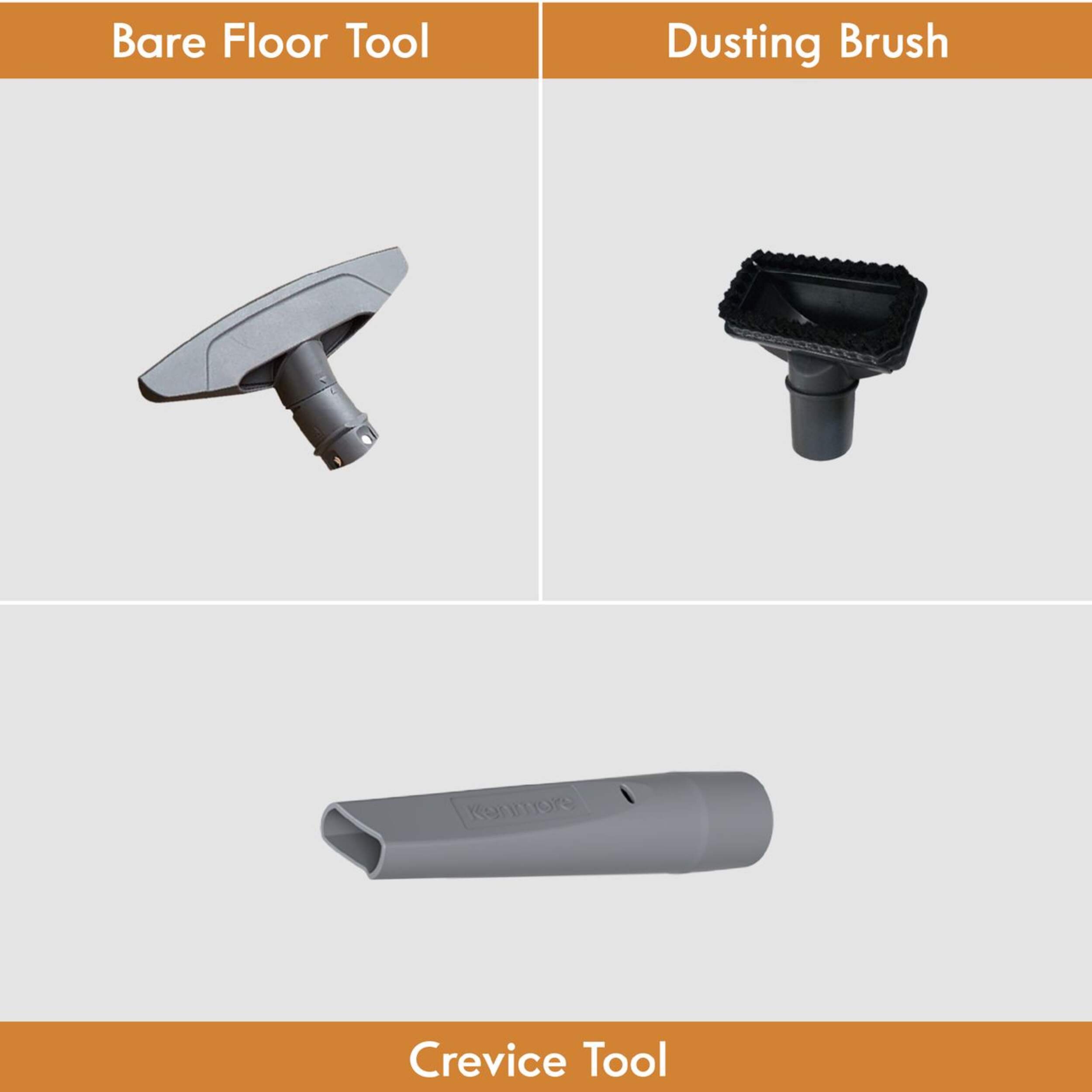 Includes large dusting brush, long crevice tool, and bare floor brush