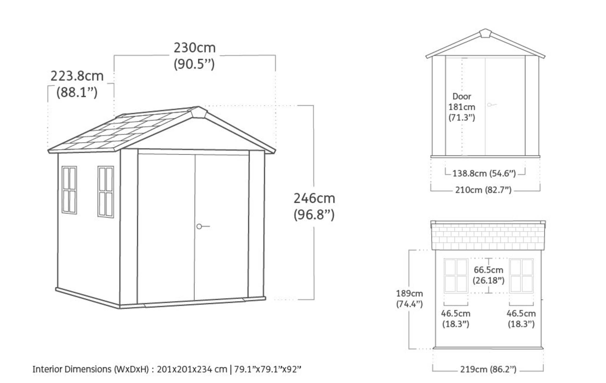 Set-up 7'x7.5': External dimensions: 88.1"W x 90.5"D x 96.5"H (224 W x 230 D x 246 H cm), Internal dimensions: 79.1"W x 79.1"D x 92.1"H (201 W x 201 D x 234 H cm)
